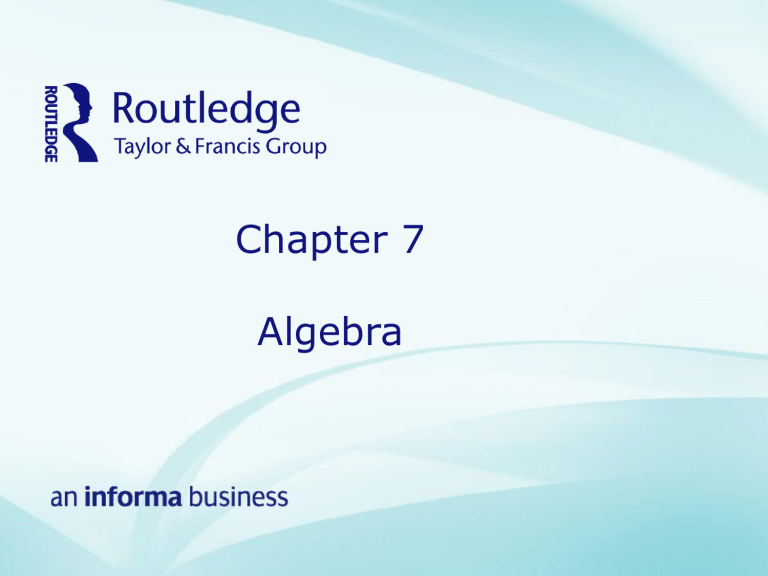 Chapter 7 Algebra Chapter Summary • The chapter explains how algebraic thinking is at the heart of mathematics from the minute we begin exploring the world mathematically • It argues that young learners have a natural propensity for algebraic thinking • It illustrates how specialising and generalising are the big ideas that underpin algebraic thinking. Starting point Explore any 2 x 2 grid in a 100 square. 12 13 22 23 What do you notice about the numbers in this grid? If we call the number in the top left hand corner ‘n’ can you write an expression for the sum of the 4 numbers? Explore totals in different grids within the 100 square? Portfolio task Look at this series of shapes: • How do you see the shape growing? • How many squares would be in the 100th shape? • How many squares would be in shape ‘N’? Algebra in the Early Years: Yes! • Read the article ‘Algebra in the Early years: Yes’ by Jennifer Taylor Cox. • Which activities could you use or develop for use in your own classroom? • Write a paragraph in your journal outlining how children in the Early Years are developing algebraic thinking. Modelling Quantitative Relationships • A farmer has only goats and chickens. She has 28 animals and there are 72 legs all together. How many chickens and goats are there? • Illustrate your thinking using diagrams or jottings. Observing the teaching of algebra Watch the video of pupils engaging in an investigation exploring handshakes on the companion website. How would you introduce this activity to a class that you were working with? How would you group the pupils? How would you arrange the classroom?