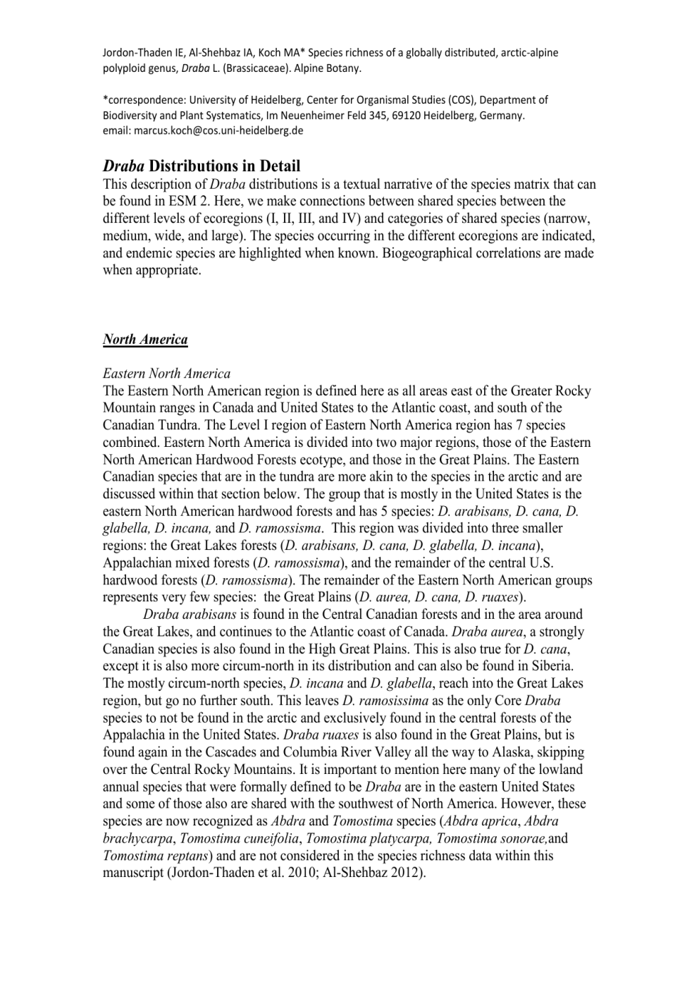 Jordon-Thaden IE, Al-Shehbaz IA, Koch MA* Species richness of a globally distributed, arctic-alpine polyploid genus, Draba L. (Brassicaceae). Alpine Botany. *correspondence: University of Heidelberg, Center for Organismal Studies (COS), Department of Biodiversity and Plant Systematics, Im Neuenheimer Feld 345, 69120 Heidelberg, Germany. email: [email protected] Draba Distributions in Detail This description of Draba distributions is a textual narrative of the species matrix that can be found in ESM 2. Here, we make connections between shared species between the different levels of ecoregions (I, II, III, and IV) and categories of shared species (narrow, medium, wide, and large). The species occurring in the different ecoregions are indicated, and endemic species are highlighted when known. Biogeographical correlations are made when appropriate. North America Eastern North America The Eastern North American region is defined here as all areas east of the Greater Rocky Mountain ranges in Canada and United States to the Atlantic coast, and south of the Canadian Tundra. The Level I region of Eastern North America region has 7 species combined. Eastern North America is divided into two major regions, those of the Eastern North American Hardwood Forests ecotype, and those in the Great Plains. The Eastern Canadian species that are in the tundra are more akin to the species in the arctic and are discussed within that section below. The group that is mostly in the United States is the eastern North American hardwood forests and has 5 species: D. arabisans, D. cana, D. glabella, D. incana, and D. ramossisma. This region was divided into three smaller regions: the Great Lakes forests (D. arabisans, D. cana, D. glabella, D. incana), Appalachian mixed forests (D. ramossisma), and the remainder of the central U.S. hardwood forests (D. ramossisma). The remainder of the Eastern North American groups represents very few species: the Great Plains (D. aurea, D. cana, D. ruaxes). Draba arabisans is found in the Central Canadian forests and in the area around the Great Lakes, and continues to the Atlantic coast of Canada. Draba aurea, a strongly Canadian species is also found in the High Great Plains. This is also true for D. cana, except it is also more circum-north in its distribution and can also be found in Siberia. The mostly circum-north species, D. incana and D. glabella, reach into the Great Lakes region, but go no further south. This leaves D. ramosissima as the only Core Draba species to not be found in the arctic and exclusively found in the central forests of the Appalachia in the United States. Draba ruaxes is also found in the Great Plains, but is found again in the Cascades and Columbia River Valley all the way to Alaska, skipping over the Central Rocky Mountains. It is important to mention here many of the lowland annual species that were formally defined to be Draba are in the eastern United States and some of those also are shared with the southwest of North America. However, these species are now recognized as Abdra and Tomostima species (Abdra aprica, Abdra brachycarpa, Tomostima cuneifolia, Tomostima platycarpa, Tomostima sonorae,and Tomostima reptans) and are not considered in the species richness data within this manuscript (Jordon-Thaden et al. 2010; Al-Shehbaz 2012). Western North America The Western portion of North America includes the North American Cordillera of the Western Hemisphere and consists of the many mountain ranges either closely associated with the Continental Divide or even as far west as the mountains of California (the Southern American Cordillera is in South America and consists of the Andes and is discussed next), and as far east as eastern Wyoming. The Level I region North American Cordillera has a total of 102 Draba species, most of which have a narrow distribution within the different mountain ranges. This North American Cordillera is divided here into three Level II Ecoregions: Northern North American Cordillera (26), Central North American Cordillera (58), and Southern North American Cordillera (41). The Northern North American Cordillera is divided into two Level III Ecoregions. The north-central Canadian Tiaga, having 22 species, many of which are also found in the Central North American Cordillera and the arctic. The Pacific Northwest and Northern California coastal forests have five species: D. albertina, D. aureola, D. cinerea, D. howellii, and D. petrosperma. Two of these species, D. aureola and D. howellii, have a distribution that includes the forests of Northern California, into the Cascades and Columbia River Valley. Only two other species, D. carnosula and D. pterosperma, have a narrow distribution in coastal Northern California only. The Central North American Cordillera consists of one Level III region and is sub-divided into four Level IV regions, one of which has a very high species number. The Central Rocky Mountains holds one of the highest numbers of Draba species (49). The Northern Rocky Mountains hold 21 species, most of which also occur in the Central Rockies except with the addition of D. cinerea, D. corymbosa, D. glabella, D. grandis, and D. ruaxes. There are 33 species missing from the Northern Rockies that are only found in the Central Rockies. Five of species have a wide southerly distribution and grow both in the Central and Southern Rockies. Two of these species, D. fladnizensis and D. porsildii, have a Central Rocky Mountain distribution shared with Northern Canadian Tiaga and the North American Beringia areas. The Cascades and Columbia River Valley have 14 species. Draba cusickii has a medium range distribution that includes the Oregon Cascades and the Snake and Columbian River valleys and steppe. Draba cyclomorpha is the only species with a narrow distribution in northeastern forests of Oregon. Draba ruaxes has a disjunct distribution and is found within the Columbia River Valley, Great Plains, and Alaska. The Colorado Plateau, 