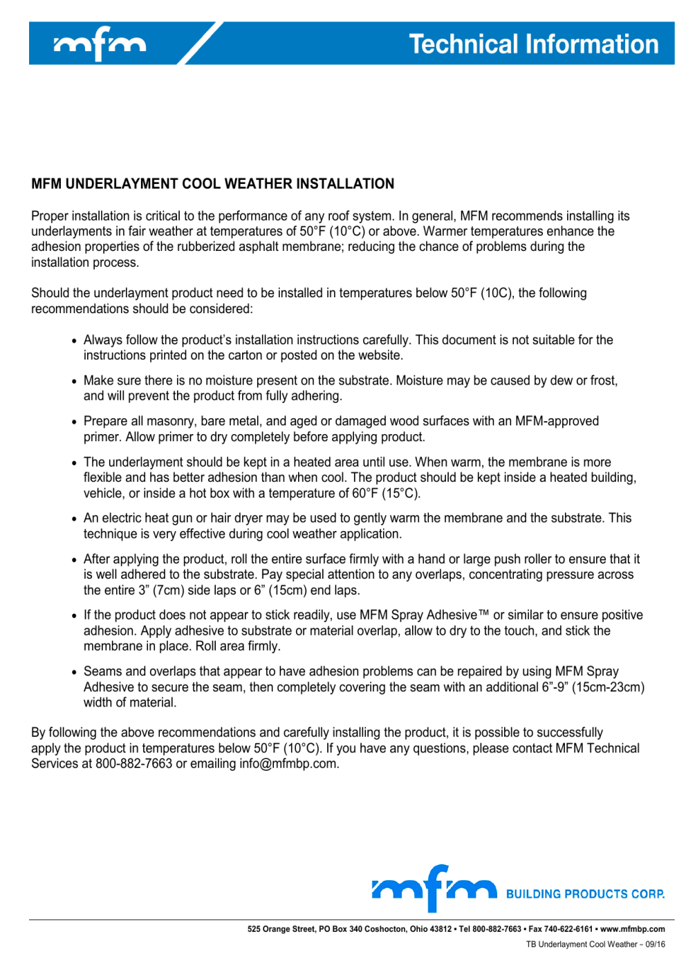 MFM UNDERLAYMENT COOL WEATHER INSTALLATION Proper installation is critical to the performance of any roof system. In general, MFM recommends installing its underlayments in fair weather at temperatures of 50°F (10°C) or above. Warmer temperatures enhance the adhesion properties of the rubberized asphalt membrane; reducing the chance of problems during the installation process. Should the underlayment product need to be installed in temperatures below 50°F (10C), the following recommendations should be considered: Always follow the product’s installation instructions carefully. This document is not suitable for the instructions printed on the carton or posted on the website. Make sure there is no moisture present on the substrate. Moisture may be caused by dew or frost, and will prevent the product from fully adhering. Prepare all masonry, bare metal, and aged or damaged wood surfaces with an MFM-approved primer. Allow primer to dry completely before applying product. The underlayment should be kept in a heated area until use. When warm, the membrane is more flexible and has better adhesion than when cool. The product should be kept inside a heated building, vehicle, or inside a hot box with a temperature of 60°F (15°C). An electric heat gun or hair dryer may be used to gently warm the membrane and the substrate. This technique is very effective during cool weather application. After applying the product, roll the entire surface firmly with a hand or large push roller to ensure that it is well adhered to the substrate. Pay special attention to any overlaps, concentrating pressure across the entire 3” (7cm) side laps or 6” (15cm) end laps. If the product does not appear to stick readily, use MFM Spray Adhesive™ or similar to ensure positive adhesion. Apply adhesive to substrate or material overlap, allow to dry to the touch, and stick the membrane in place. Roll area firmly. Seams and overlaps that appear to have adhesion problems can be repaired by using MFM Spray Adhesive to secure the seam, then completely covering the seam with an additional 6”-9” (15cm-23cm) width of material. By following the above recommendations and carefully installing the product, it is possible to successfully apply the product in temperatures below 50°F (10°C). If you have any questions, please contact MFM Technical Services at 800-882-7663 or emailing [email protected]. 525 Orange Street, PO Box 340 Coshocton, Ohio 43812 ▪ Tel 800-882-7663 ▪ Fax 740-622-6161 ▪ www.mfmbp.com TB Underlayment Cool Weather − 09/16