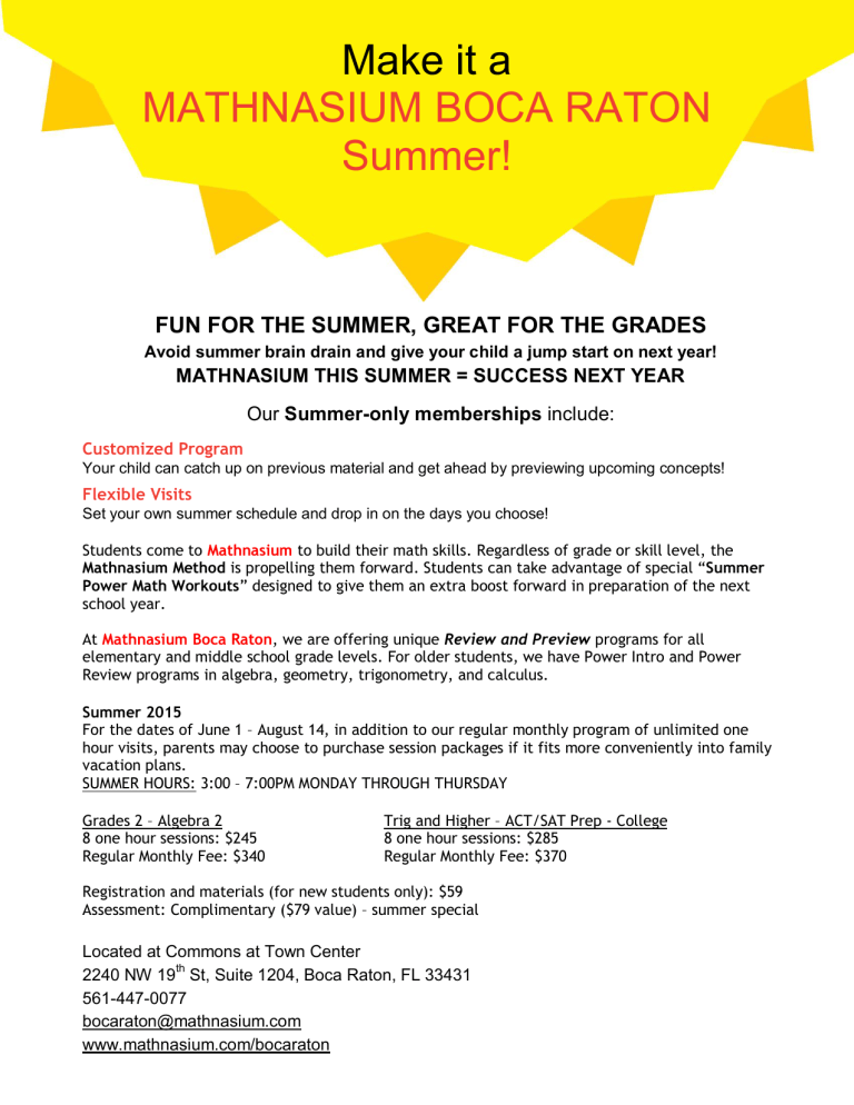 Make it a MATHNASIUM BOCA RATON Summer! FUN FOR THE SUMMER, GREAT FOR THE GRADES Avoid summer brain drain and give your child a jump start on next year! MATHNASIUM THIS SUMMER = SUCCESS NEXT YEAR Our Summer-only memberships include: Customized Program Your child can catch up on previous material and get ahead by previewing upcoming concepts! Flexible Visits Set your own summer schedule and drop in on the days you choose! Students come to Mathnasium to build their math skills. Regardless of grade or skill level, the Mathnasium Method is propelling them forward. Students can take advantage of special “Summer Power Math Workouts” designed to give them an extra boost forward in preparation of the next school year. At Mathnasium Boca Raton, we are offering unique Review and Preview programs for all elementary and middle school grade levels. For older students, we have Power Intro and Power Review programs in algebra, geometry, trigonometry, and calculus. Summer 2015 For the dates of June 1 – August 14, in addition to our regular monthly program of unlimited one hour visits, parents may choose to purchase session packages if it fits more conveniently into family vacation plans. SUMMER HOURS: 3:00 – 7:00PM MONDAY THROUGH THURSDAY Grades 2 – Algebra 2 8 one hour sessions: $245 Regular Monthly Fee: $340 Trig and Higher – ACT/SAT Prep - College 8 one hour sessions: $285 Regular Monthly Fee: $370 Registration and materials (for new students only): $59 Assessment: Complimentary ($79 value) – summer special Located at Commons at Town Center 2240 NW 19th St, Suite 1204, Boca Raton, FL 33431 561-447-0077 [email protected] www.mathnasium.com/bocaraton