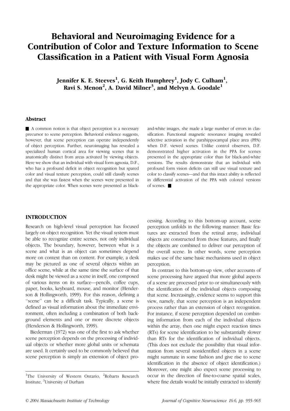 Behavioral and Neuroimaging Evidence for a Contribution of Color and Texture Information to Scene Classification in a Patient with Visual Form Agnosia Jennifer K. E. Steeves1, G. Keith Humphrey1, Jody C. Culham1, Ravi S. Menon2, A. David Milner 3, and Melvyn A. Goodale1 Abstract & A common notion is that object perception is a necessary precursor to scene perception. Behavioral evidence suggests, however, that scene perception can operate independently of object perception. Further, neuroimaging has revealed a specialized human cortical area for viewing scenes that is anatomically distinct from areas activated by viewing objects. Here we show that an individual with visual form agnosia, D.F., who has a profound deficit in object recognition but spared color and visual texture perception, could still classify scenes and that she was fastest when the scenes were presented in the appropriate color. When scenes were presented as black- INTRODUCTION Research on high-level visual perception has focused largely on object recognition. Yet the visual system must be able to recognize entire scenes, not only individual objects. The boundary, however, between what is a scene and what is an object can sometimes depend more on context than on content. For example, a desk may be pictured as one of several objects within an office scene, while at the same time the surface of that desk might be viewed as a scene in itself, one composed of various items on its surface—pencils, coffee cups, paper, books, keyboard, mouse, and monitor (Henderson & Hollingworth, 1999). For this reason, defining a ‘‘scene’’ can be a difficult task. Typically, a scene is defined as visual information about the immediate environment, often including a combination of both background elements and one or more discrete objects (Henderson & Hollingworth, 1999). Biederman (1972) was one of the first to ask whether scene perception depends on the processing of individual objects or whether more global units or schemata are used. It certainly used to be commonly believed that scene perception is simply an extension of object pro- 1 The University of Western Ontario, Institute, 3University of Durham 2 Robarts Research D 2004 Massachusetts Institute of Technology and-white images, she made a large number of errors in classification. Functional magnetic resonance imaging revealed selective activation in the parahippocampal place area (PPA) when D.F. viewed scenes. Unlike control observers, D.F. demonstrated higher activation in the PPA for scenes presented in the appropriate color than for black-and-white versions. The results demonstrate that an individual with profound form vision deficits can still use visual texture and color to classify scenes—and that this intact ability is reflected in differential activation of the PPA with colored versions of scenes. & cessing. According to this bottom-up account, scene perception unfolds in the following manner: Basic features are extracted from the retinal array, individual objects are constructed from those features, and finally the objects are combined to deliver our perception of the overall scene. In other words, scene perception makes use of the same basic mechanisms used in object perception. In contrast to this bottom-up view, other accounts of scene processing have argued that more global aspects of a scene are processed prior to or simultaneously with the identification of the individual objects composing that scene. Increasingly, evidence seems to support this view, namely, that scene perception is an independent process rather than an extension of object recognition. For instance, if scene perception depended on combining information from each of the individual objects within the array, then one might expect reaction times (RTs) for scene identification to be substantially slower than RTs for the identification of individual objects. (This does not exclude the possibility that visual information from several nonidentified objects in a scene might summate in some fashion and give rise to scene identification in the absence of object identification.) Moreover, one might also expect scene processing to occur in the direction of fine-to-coarse spatial scales, where fine details would be initially extracted to identify Journal of Cognitive Neuroscience 16:6, pp. 955–965 objects before the coarse scene information could be used to provide a global impression of the scene. But neither of these appears to be the case. As it turns out, scenes can be identified quite rapidly—as rapidly as the individual objects constituting the scene (Gegenfurtner & Rieger, 2000). Even more compelling is the fact that scene perception occurs quite effectively, and sometimes even preferentially, in the coarse-to-fine direction of processing (Oliva & Schyns, 1997; Schyns & Oliva, 1994, 1997). Indeed, scenes can be identified solely on the basis of coarse (low spatial frequency) information from extremely brief (50 msec) presentations, in which individual objects cannot be differentiated (Schyns & Oliva, 1994). The idea that scenes can be identified on the basis of global properties alone has also received support from computational models that permit accurate scene classification without the prior identification of individual objects (Oliva & Torralba, 2001; Vailaya, Jain, & Jiang Zhang, 1998). Models that allow fast recognition of scene gist, without the identification of component objects, make use of properties such as the spatial complexity of the scene, visual texture, and color (Oliva & Schyns, 2000; Oliva & Torralba, 2001). Natural landscapes, for example, tend to have zones with undulating contours and characteristic textures and/or colors, whereas manmade scenes tend to have straight horizontal and vertical lines without such zones. Behavioral studies have shown that color can be a particularly useful cue in the identification of natural landscapes. For example, Oliva and Schyns (2000) sh