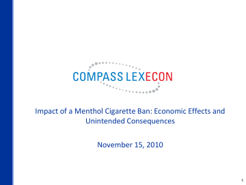 Impact of a Menthol Cigarette Ban: Economic Effects and Unintended Consequences November 15, 2010 1 LIKELY OUTCOMES FROM A MENTHOL BAN • No Significant Reduction in Aggregate Smoking • Development of a Sizeable Black Market for Menthol Cigarettes • Harmful Unintended Consequences o Increase in Organized Crime Activity o Increase in Youth Access to Cigarettes 2 NO SIGNIFICANT REDUCTION IN AGGREGATE SMOKING • Overall cigarette demand is highly inelastic. • Inelastic demand indicates that even if the menthol ban raised the cost of all cigarettes, the decline in overall consumption would be low. • However, the menthol ban directly would affect the price of menthol cigarettes only, as the legal sale of non-menthol cigarettes would not be restricted. • These facts indicate that a majority of menthol cigarette smokers would either switch to non-menthol brands or purchase contraband menthol cigarettes in response to a ban. 3 DEVELOPMENT OF A SIZEABLE BLACK MARKET • We estimate a low elasticity of demand for menthol cigarettes, which implies that many menthol smokers have strong preferences for menthol cigarettes. Hence, many menthol smokers likely would purchase menthol cigarettes in the black market, even if the price of these cigarettes would be high. • Our study of previous black markets in cigarettes indicates that the elasticity of substitution between legal and illicit cigarettes is high. Namely, as the relative price of cigarettes sold through legal channels increase, contraband cigarette sales expand greatly. • Given a high demand for menthol cigarettes and a robust supply of illicit menthol cigarettes that likely would be available after a ban, the volume of transactions that would occur in a black market likely would be large. 4 DEVELOPMENT OF A SIZEABLE BLACK MARKET • The eventual size of the black market is difficult to predict, as it depends greatly on a number of uncertain factors, including: o o o The level of enforcement efforts, and the ultimate availability of supply The reluctance consumers must overcome to purchase on the black market The overall demand structure for menthol and non-menthol cigarettes • Nevertheless, we benchmark the post-ban size of the black market using parameter estimates that emerge from our preliminary economic analysis. • In our paper, we evaluate a broad range of parameter estimates, as the data upon which we rely are limited, and thus much uncertainty exists for each parameter estimate. • On the following slide, one estimate of black-market sales is developed (from what we find to be reasonable empirical approximations of these underlying parameters). We stress that this estimate represents only a rough approximation of the black market, given the limitations of currently available information. 5 DEVELOPMENT OF A SIZEABLE BLACK MARKET • Given a menthol own-price elasticity of -1.4; a cross price elasticity between non-menthol cigarettes and the price of menthol ones of 1.1; and an increase in the “full price” of menthol cigarettes of 25%, we find that the size of the post-ban black market would be: o Approximately 70% of the current menthol cigarette volume o Over 85% of the current menthol cigarette sales revenue o • Black market would be larger if the “full price” of menthol cigarettes increased by less than 25% over current prices Substantial federal, state and local governments taxes would be lost from this shift towards black market sales from current legal channels. 6 UNINTENDED CONSEQUENCES • Increases in Organized Crime o o Given the size of the potential black market for cigarettes, the financial incentives to enter this market would be high. Higher enforcement efforts, which likely would be needed for the ban to have an effect on aggregate smoking, could result in greater organized crime activity. Specifically, enforcement efforts could increase the rents organized crime earns from selling banned cigarettes (by reducing competition from “mom and pop” distributors), and thus increasing incentives to be a large supplier. • Increases in Youth Access o o Increases in the supply of cigarettes through non-regulated sources may lead to increases in youth access to all cigarettes. Canadian black market experience suggests that youth access to cigarettes increased as a result of the growth in the black market for cigarettes.