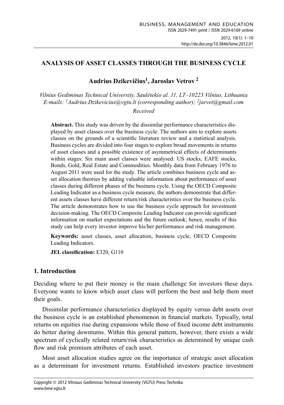 Business, Management and Education ISSN 2029-7491 print / ISSN 2029-6169 online 2012, 10(1): 1–10 http://dx.doi.org/10.3846/bme.2012.01 Analysis of Asset Classes Through the Business cycle Audrius Dzikevičius1, Jaroslav Vetrov 2 Vilnius Gediminas Technical University, Saulėtekio al. 11, LT–10223 Vilnius, Lithuania E-mails: [email protected] (corresponding author); [email protected] Received Abstract. This study was driven by the dissimilar performance characteristics displayed by asset classes over the business cycle. The authors aim to explore assets classes on the grounds of a scientific literature review and a statistical analysis. Business cycles are divided into four stages to explore broad movements in returns of asset classes and a possible existence of asymmetrical effects of determinants within stages. Six main asset classes were analysed: US stocks, EAFE stocks, Bonds, Gold, Real Estate and Commodities. Monthly data from February 1976 to August 2011 were used for the study. The article combines business cycle and asset allocation theories by adding valuable information about performance of asset classes during different phases of the business cycle. Using the OECD Composite Leading Indicator as a business cycle measure, the authors demonstrate that different assets classes have different return/risk characteristics over the business cycle. The article demonstrates how to use the business cycle approach for investment decision-making. The OECD Composite Leading Indicator can provide significant information on market expectations and the future outlook; hence, results of this study can help every investor improve his/her performance and risk management. Keywords: asset classes, asset allocation, business cycle, OECD Composite Leading Indicators. Jel classification: E320, G110 1. Introduction Deciding where to put their money is the main challenge for investors these days. Everyone wants to know which asset class will perform the best and help them meet their goals. Dissimilar performance characteristics displayed by equity versus debt assets over the business cycle is an established phenomenon in financial markets. Typically, total returns on equities rise during expansions while those of fixed income debt instruments do better during downturns. Within this general pattern, however, there exists a wide spectrum of cyclically related return/risk characteristics as determined by unique cash flow and risk premium attributes of each asset. Most asset allocation studies agree on the importance of strategic asset allocation as a determinant for investment returns. Established investors practice investment Copyright © 2012 Vilniaus Gediminas Technical University (VGTU) Press Technika www.bme.vgtu.lt A. Dzikevičius, J. Vetrov. Analysis of Asset Classes Through the Business cycle diversification across market capitalizations, countries, sectors, and asset classes to enhance the risk-return tradeoff in a portfolio. Brinson, Hood and Beebower (1986) claim that 93.6% of performance variation can be explained by strategic asset allocation decisions. This result implies that characteristics of various asset classes are a very important component of investment results. As the asset allocation decision is of significant importance, almost all asset managers and financial advisors determine an optimal portfolio for their clients – be they institutional or individual – by performing an asset allocation analysis with the help of a set of asset classes (Fabozzi et al. 2002). The goal of this article is to explore asset classes using the business cycle approach. The article combines business cycle and asset allocation theories by adding valuable information about performance of asset classes in different phases of the business cycle. It demonstrates how to use the business cycle approach in investment decision-making. The authors use 6 asset classes for analysis: US stocks, EAFE stocks, Bonds, Gold, Real Estate and Commodities. Research methods – the comparison and generalization method and statistical analysis on the basis of the OECD Leading Indicator approach – used in this paper resulted for logical analysis and synthesis of scientific literature. 2. Literature review The thesis that stock prices mimic rises and falls in the business cycle can be strongly supported. With few exceptions, research shows that stock prices lead the level of economic activity. This phenomenon follows from the belief that current stock prices correctly impound expectations of future economic activity. Moore, for example, shows that 18 of the 23 business cycle peaks (troughs) occurring between 1873 and 1970 are anticipated by the stock market, with an average lead-time of about five to six months. Moreover, from 1948 through 1970 his research shows 100% of peaks and troughs being correctly anticipated (1983). More contemporary research using Granger methods shows bidirectional causality between stock returns and real economic activity (Tunah 2010; Ali et al. 2010). Adjasi and Biekpe (2006) pointed out that stock exchanges can provide quick paths to capital acquisition, due to the ease with which securities are traded. Stock exchange activity therefore plays an important role in helping to determine country’s macroeconomic condition. Literature review contains a number of studies that examine stock price changes. Probably one of the most interesting and important subjects that receives increasingly more attention from economists, financial investors and policy makers is dynamic effects of macroeconomic indicators on stock prices. Ibrahim found that macroeconomic forces influence stock prices through their impact on the expected future cash flows (1999). Mehr noted that the public policy impact on growth can be measured by stock prices (2001). Chakravarty also stated that stock 2 Business, Management and Education, 2012, 10(1): 1–10 prices are highly sensitive to key macroeconomic indicators (2005). Fr