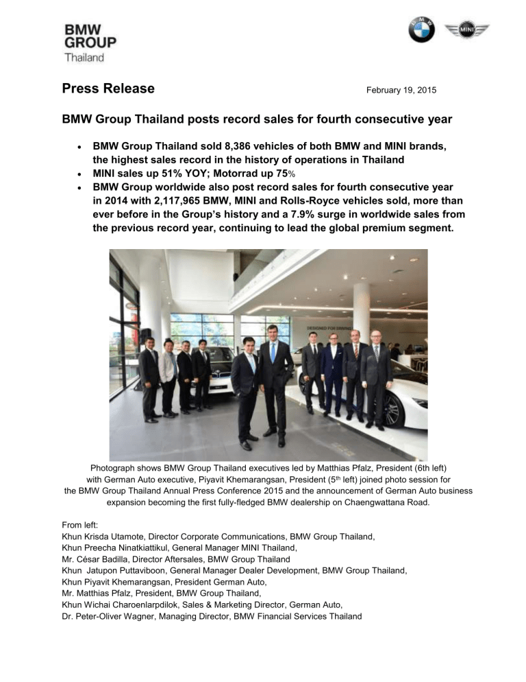Press Release February 19, 2015 BMW Group Thailand posts record sales for fourth consecutive year BMW Group Thailand sold 8,386 vehicles of both BMW and MINI brands, the highest sales record in the history of operations in Thailand MINI sales up 51% YOY; Motorrad up 75% BMW Group worldwide also post record sales for fourth consecutive year in 2014 with 2,117,965 BMW, MINI and Rolls-Royce vehicles sold, more than ever before in the Group’s history and a 7.9% surge in worldwide sales from the previous record year, continuing to lead the global premium segment. Photograph shows BMW Group Thailand executives led by Matthias Pfalz, President (6th left) with German Auto executive, Piyavit Khemarangsan, President (5th left) joined photo session for the BMW Group Thailand Annual Press Conference 2015 and the announcement of German Auto business expansion becoming the first fully-fledged BMW dealership on Chaengwattana Road. From left: Khun Krisda Utamote, Director Corporate Communications, BMW Group Thailand, Khun Preecha Ninatkiattikul, General Manager MINI Thailand, Mr. César Badilla, Director Aftersales, BMW Group Thailand Khun Jatupon Puttaviboon, General Manager Dealer Development, BMW Group Thailand, Khun Piyavit Khemarangsan, President German Auto, Mr. Matthias Pfalz, President, BMW Group Thailand, Khun Wichai Charoenlarpdilok, Sales & Marketing Director, German Auto, Dr. Peter-Oliver Wagner, Managing Director, BMW Financial Services Thailand Mr. Markus Glaeser, Head of BMW Motorrad Thailand, Mr. Lars Nielsen, Sales and Marketing Director, BMW Thailand Bangkok. BMW Group Thailand today revealed another record sales result for 2014, with 8,386 BMW and MINI vehicle deliveries being the highest in the company’s history of operations in Thailand. The announcement was made at BMW Group Thailand annual press conference, an event which also marked the opening of German Auto Chaengwattana, the first-ever BMW Group Thailand’s authorized dealership to offer BMW, BMW i, MINI, BMW Motorrad and BMW Premium Selection / MINI Next certified used cars, all at the one location. Mr. Matthias Pfalz, President, BMW Group Thailand said, “At the end of 2014, the BMW Group achieved another record worldwide, delivering for the first time over two million vehicles to customers last year with a total of 2,117,965 BMW, MINI and Rolls-Royce vehicles sold, more than ever before in the Group’s history and a 7.9% surge in our worldwide sales from the previous record year. This marks the highest sales record in our company’s history as we successfully maintain our position as the world’s leading manufacturer of premium vehicles in 2014, In December 2014, BMW Group Thailand achieved the best-ever sales performance of four digits with 1,205 BMW and MINI deliveries in a single month. This has been reflected in our 2014 annual result where we achieved record sales for fourth consecutive year with 8,386 BMW and MINI vehicles delivered. This illustrates steady demand for models across our BMW line-up despite the headwinds.” A highlight for BMW Group has been the performance of MINI, which has recorded a 51% increase year-on-year with 921 deliveries to become by far the fastest growing brand in Thailand’s premium automotive segment, and also the highest growth rate within the entire MINI subsidiaries worldwide. The continuing success of the locally-assembled MINI Countryman has contributed considerably to the success of the MINI product portfolio, supported by strong customer interest in this unique and historical brand. With the expansion of dealer network by including MINI at the recently opened Millennium Auto in Ubon Ratchathani and now German Auto Chaengwattana in Bangkok, MINI Thailand is only set to grow with the increased national MINI fanbase. BMW Motorrad too saw a record-breaking sales achievement bolstered by the unveiling of two locallyassembled models, the BMW F 800 R and BMW F 800 GS, both of which have been exceedingly wellreceived by Thai Big Bike enthusiasts. The marque achieved an all-time high sales with 700 deliveries, reflecting a full 75% year-on-year growth spurt. The brand looks forward to further traction with the opening of the second BMW Motorrad stand-alone showroom, MF Motorrad Rama II as well as dealership expansions at German Auto Chaengwattana, German Auto in Pattaya, and Cherdchai Autohaus in Korat in the first quarter of 2015. “The continuing success of BMW Group here in Thailand can be attributed to the innovation of our model line-up, the strength of our premium brands and our global recognition for sustainability. We are extremely proud to have been named the most admired automotive company in Thailand by the Company magazine, which reflects the appreciation Thai customers have for BMW vision. Our long-term commitment to Thailand continues with the 15th anniversary of our BMW Group Manufacturing Thailand in Rayong in 2015, a major milestone for the only BMW Manufacturing facility in the world to produce vehicles for all three brands – BMW, MINI, and Motorrad. We are exceedingly proud to have seen the 50,000th car come out of Rayong in 2014, and we look forward to the next 50,000,” Mr. Matthias Pfalz added. The new dominance expands to northern Bangkok – German Auto Chaengwattana will be the first BMW Group Thailand’s authorized dealer to offer BMW, BMW i, MINI, BMW Motorrad, and BMW Premium Selection / MINI Next certified used cars at the one location. Mr. Piyavit Khemarangsan, President, German Auto said, “To strengthen our commitment to providing services that meet the BMW global standard, and enhancing our customer experiences, we decided to reinforce our partnership with the BMW Group Thailand through German Auto’s expansion on Chaengwattana road. Following the success of our Bangna showroom where we currently offer BMW, MINI and BMW Motorrad sales & service facilities, German Auto Chaegwattana will offer new BMW, MINI, BMW Motorrad, and BMW Premium Sele