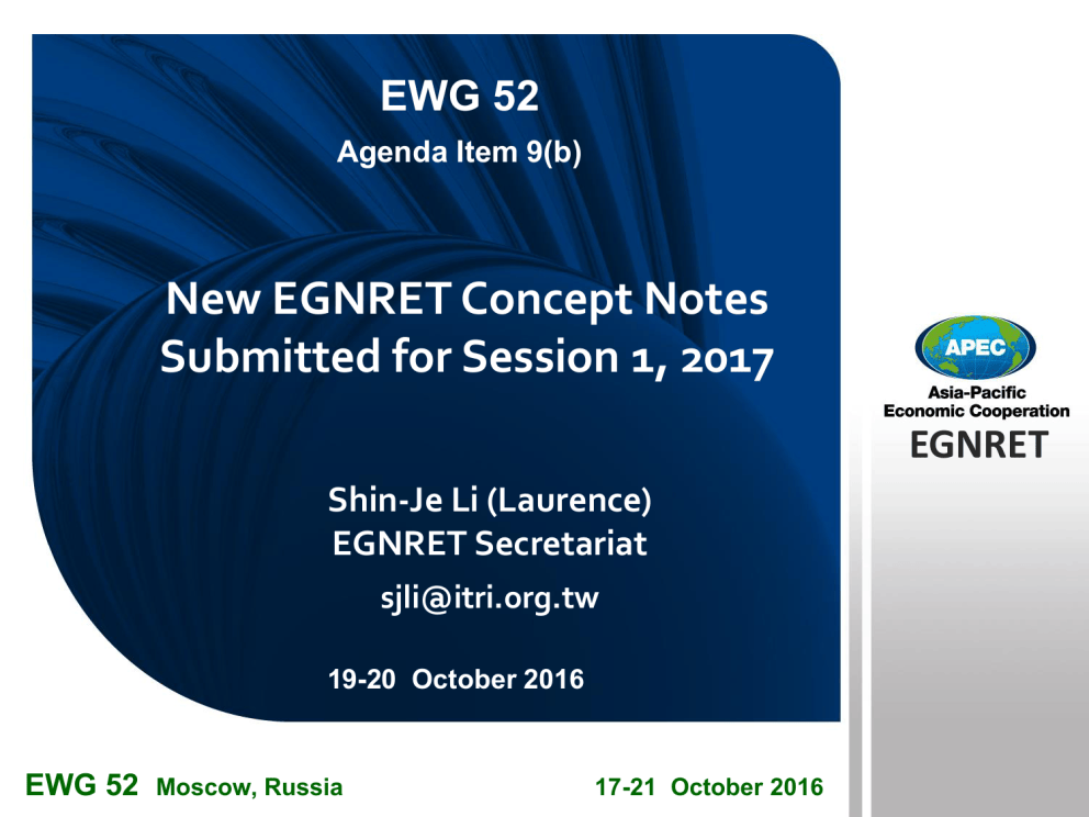 EWG 52 Agenda Item 9(b) New EGNRET Concept Notes Submitted for Session 1, 2017 EGNRET Shin-Je Li (Laurence) EGNRET Secretariat [email protected] 19-20 October 2016 EWG 40 Brunei Darussalam Moscow, Russia EWG 52 22-26 November, 2010 17-21 October 2016 1. Making the Case for Clean Energy Investments with LifeCycle Impact Assessments Proposing APEC economy USA Co-sponsoring APEC economies Canada; Hong Kong, China; Japan; Republic of Korea; Thailand The project will support the implementation and development of cleaner power generation technologies in APEC economies. Project summary This project will deliver a workshop addressing the environmental and health impacts across the lifespan of a power generation investment and introduce APEC economies to practical tools to assess, quantify, and communicate the impacts and costs of different power generation options. The project seeks to enable APEC economies to: - Formulate business cases for cleaner fossil-fuel and renewable energy investments; - Select emerging technologies for accelerated development; - Defend the health and environmental benefits of clean air and energy policies Page 2 EWG 52 Moscow, Russia 17-21 October 2016 EGNRET 2. Economic and Life Cycle Analysis of Solar Photovoltaic Systems in APEC Region Toward LowCarbon Society Proposing APEC Malaysia economy Co-sponsoring Republic of Korea; USA APEC economies The project team will be on-site investigated at least three case studies such as grid connected solar PV system for residential home, off-grid connected solar PV system at remote area and solar PV farm for power generation. Two rounds of workshops over two years will be conducted for in-depth discussion, sharing ideas, gathering information and developing the Project summary report and guideline of economic and LCA of solar PV system in these regions. The workshops will be attended by solar PV manufacturers, PV installers, financial institutions and related policy makers in APEC region. The tool of analysis used is SimaPro and Enco Invent database system. Page 3 EWG 52 Moscow, Russia 17-21 October 2016 EGNRET 3. APEC Peer Review on Low-Carbon Energy Policies (PRLCE) Phase 4 Proposing APEC Japan economy Co-sponsoring Malaysia; Papua New Guinea; The Philippines; Thailand APEC economies The PRLCE responds to the Energy Ministers’ instruction from their meeting in Fukui, Japan in 2010; to explore mechanisms to encourage APEC economies to set individual goals and action plans for introducing low-emission power sources. A peer review team comprised of experts on low-carbon energy supply policy from APEC member economies will review goals and policies to Project summary promote low-carbon energy supply. The review team will provide recommendations based on this and assist with effective policy making in this area as well as the effective formulation of action plans, etc. Low-emission power sources include renewable, nuclear and fossil fuel with carbon capture and storage. The scope of review will be decided depending on the host economy’s priorities. One PRLCE is planned in Papua New Guinea with a focus on hydro power generation in 2017. Page 4 EWG 52 Moscow, Russia 17-21 October 2016 EGNRET 4. Technical Analysis to Support Development and Deployment of Renewable Energies in APEC Region Proposing APEC People’s Republic of China economy Co-sponsoring Hong Kong, China; USA APEC economies This project is planning to provide more technical assistance on the deployment of renewable energy in a deeper way by doing technical analysis after a comprehensive summary and survey work. Comprehensive review on the previous works of EWG and relevant sub-fora will be done, to summarize and categorize information of technologies, policies, programs and experiences. Project summary Survey study on the RE roadmap based on various scenarios need to be carried out, and technical analysis will be done using modelling approach. Seminars and workshop will be held for information collecting and sharing. Training courses will be organized for technical capacity buildings to policy makers and relevant stakeholders. Page 5 EWG 52 Moscow, Russia 17-21 October 2016 EGNRET 5. Improving User-Side Clean Energy Consumption in the APEC Region by Utilizing Distributed Solar PV and Energy Storage Systems Proposing APEC economy People’s Republic of China Co-sponsoring Japan; Chinese Taipei APEC economies This project seeks to develop distributed “solar-plus-PV” models that will promote renewable energy growth and strengthen energy security and resilience in the APEC region. Project summary A workshop is scheduled for November 2017 in Beijing. The project will result in a final report describing suitable technologies, outlining business models and economic viability, and drafting policy recommendations. The project aims to inform stakeholders about the potential benefits of energy storage in distributed energy systems, and facilitate connections between policymakers, industry leaders, and researchers to promote understanding and deployment of distributed “solar-plusPV” models that support renewable energy penetration and sustainable development in the APEC region. Page 6 EWG 52 Moscow, Russia 17-21 October 2016 EGNRET Thank you for your attention! EGNRET website: http://www.egnret.ewg.apec.org/ Page 7 EWG 52 Moscow, Russia 17-21 October 2016 EGNRET