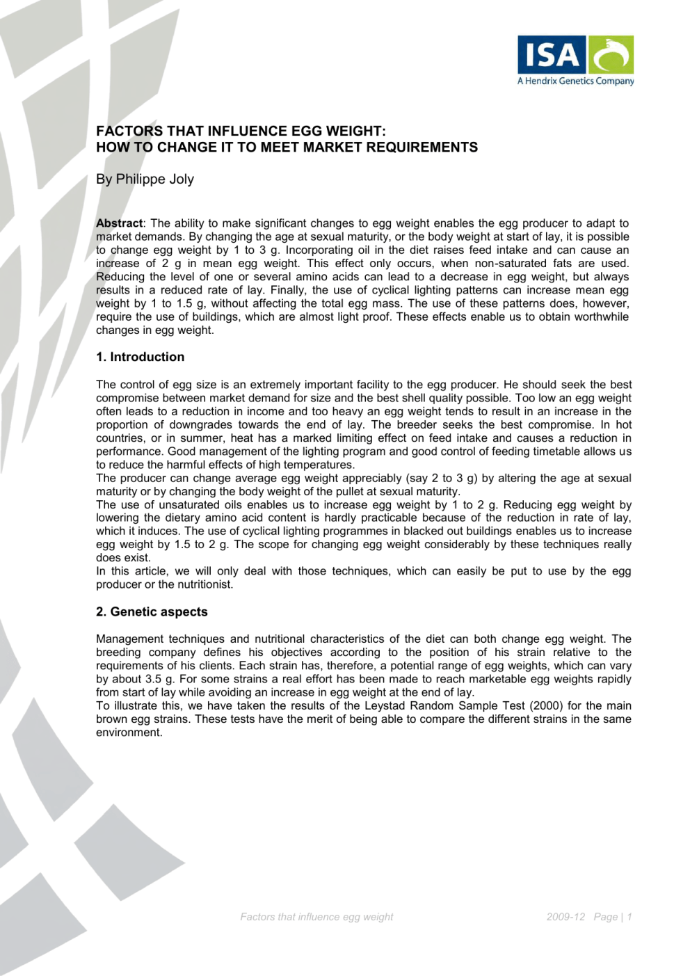 FACTORS THAT INFLUENCE EGG WEIGHT: HOW TO CHANGE IT TO MEET MARKET REQUIREMENTS By Philippe Joly Abstract: The ability to make significant changes to egg weight enables the egg producer to adapt to market demands. By changing the age at sexual maturity, or the body weight at start of lay, it is possible to change egg weight by 1 to 3 g. Incorporating oil in the diet raises feed intake and can cause an increase of 2 g in mean egg weight. This effect only occurs, when non-saturated fats are used. Reducing the level of one or several amino acids can lead to a decrease in egg weight, but always results in a reduced rate of lay. Finally, the use of cyclical lighting patterns can increase mean egg weight by 1 to 1.5 g, without affecting the total egg mass. The use of these patterns does, however, require the use of buildings, which are almost light proof. These effects enable us to obtain worthwhile changes in egg weight. 1. Introduction The control of egg size is an extremely important facility to the egg producer. He should seek the best compromise between market demand for size and the best shell quality possible. Too low an egg weight often leads to a reduction in income and too heavy an egg weight tends to result in an increase in the proportion of downgrades towards the end of lay. The breeder seeks the best compromise. In hot countries, or in summer, heat has a marked limiting effect on feed intake and causes a reduction in performance. Good management of the lighting program and good control of feeding timetable allows us to reduce the harmful effects of high temperatures. The producer can change average egg weight appreciably (say 2 to 3 g) by altering the age at sexual maturity or by changing the body weight of the pullet at sexual maturity. The use of unsaturated oils enables us to increase egg weight by 1 to 2 g. Reducing egg weight by lowering the dietary amino acid content is hardly practicable because of the reduction in rate of lay, which it induces. The use of cyclical lighting programmes in blacked out buildings enables us to increase egg weight by 1.5 to 2 g. The scope for changing egg weight considerably by these techniques really does exist. In this article, we will only deal with those techniques, which can easily be put to use by the egg producer or the nutritionist. 2. Genetic aspects Management techniques and nutritional characteristics of the diet can both change egg weight. The breeding company defines his objectives according to the position of his strain relative to the requirements of his clients. Each strain has, therefore, a potential range of egg weights, which can vary by about 3.5 g. For some strains a real effort has been made to reach marketable egg weights rapidly from start of lay while avoiding an increase in egg weight at the end of lay. To illustrate this, we have taken the results of the Leystad Random Sample Test (2000) for the main brown egg strains. These tests have the merit of being able to compare the different strains in the same environment. Factors that influence egg weight 2009-12 Page | 1 TABLE 1. Mean egg weights during different periods for the main Brown egg strains recorded in the Lelystad (RST 2000) Mean Period Period Difference Strain Weight 22 – 34 weeks 54 – 66 weeks in g A 60.94 57.83 63.37 + 5.54 B 61.27 57.70 64.13 + 6.43 C 62.05 58.93 64.58 + 5.65 D 62.61 59.43 65.23 + 5.80 E 62.64 58.57 65.93 + 7.36 F 63.29 59.83 65.90 + 6.17 G 64.31 60.50 67.50 + 7.00 3. Sexual maturity and bodyweight of pullet Variability in sexual maturity Sexual maturity changes according to variations in day length during the rearing period. With increasing day lengths, it is brought forward; with decreasing day lengths, it is retarded. Morris (1967) noticed that the difference in sexual maturity between spring and autumn depends on the amplitude of the variation in day length. TABLE 2. Differences in sexual maturity observed between springs and autumn under different latitudes Latitude Difference in sexual maturity 10 ° 3 days 30 ° 12 days 40 ° 18 days 50 ° 26 days 60 ° 41 days The purpose of lighting programmes is to control the age at start of lay and to avoid the influence of the variation in sexual maturity on performance (number and average weight of eggs). Under latitudes close to the equator, they are of less use. Sexual maturity The variation in sexual maturity is associated with considerable variations in the number of eggs produced as well as their average weight. This was studied in detail during the nineteen seventies, when lighting programmes were researched thoroughly. To illustrate these effects, we reproduce the results of trials carried out by Morris (1980) and Koutoulis (1997), who stimulated ISABROWN pullets at 8 weeks of age by increasing day length by 0, 4 and 8 hours. They obtained a change in mean egg weight of 3 g without changing the overall egg mass. Factors that influence egg weight 2009-12 Page | 2 TABLE 3. The influence of age at 50% lay on the performance of layers Age at Number Egg Weight Egg mass 50 % lay of eggs (g) g/d or kg 148 153 155 156 160 162 167 173 107.6 109.9 136.6 1 20 to 74 weeks Morris (1980) 272 264 268 269 266 264 263 260 1 59.2 60.4 60.1 60.4 60.8 61.4 61.9 62.5 Koutoulis (1997)2 61.73 61.42 64.82 342 340 318 2 to 72 weeks 42.6 42.2 42.6 43.1 42.7 42.9 43.1 43.0 Feed conversion ( Feed (g) / egg (g) ) 2.86 2.89 2.89 2.83 2.83 2.82 2.83 2.81 21.11 20.90 20.61 These investigations have shown that mean egg weight increases by 1 g, when sexual maturity is retarded by one week. Compensating for this, the number of eggs was reduced or increased by about 4.5 eggs for each change of one week in age at start of lay. By using appropriate techniques, the age at start of lay can be changed so as to produce eggs of a weight required by the market without affecting the total egg mass-produced. Instead of giving light stimulation as a function of age, we recommend that day length should only be increased, when the