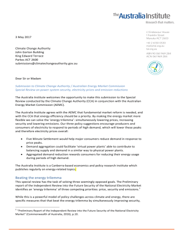 AustraliaInstitute The Research that matters. 3May2017 ClimateChangeAuthority JohnGortonBuilding KingEdwardTerrace ParkesACT2600 [email protected] DearSirorMadam SubmissiontoClimateChangeAuthority/AustralianEnergyMarketCommission SpecialReviewonpowersystemsecurity,electricitypricesandemissionreductions TheAustraliaInstitutewelcomestheopportunitytomakethissubmissiontotheSpecial ReviewconductedbytheClimateChangeAuthority(CCA)inconjunctionwiththeAustralian EnergyMarketCommission(AEMC). TheAustraliaInstituteagreeswiththeAEMCthatfundamentalmarketreformisneeded,and withtheCCAthatenergyefficiencyshouldbeapriority.Bymakingtheenergymarketmore flexiblewecansolvethe‘energytrilemma’:simultaneouslyloweringprices,increasing securityandloweringemissions.Ourthreepolicysuggestionsencourageproducersand consumersofelectricitytorespondtoperiodsofhighdemand,whichwilllowerthesepeaks andthereforeelectricitypricesoverall: • FiveMinuteSettlementwouldhelpmajorconsumersreducedemandinresponseto pricepeaks. • Demandaggregationcouldfacilitate‘virtualpowerplants’abletocontributeto balancingsupplyanddemandinasimilarwaytophysicalpowerplants. • Aggregateddemandreductionrewardsconsumersforreducingtheirenergyusage duringperiodsofhighdemand. TheAustraliaInstituteisaCanberra-basedeconomicsandpolicyresearchinstitutewhich publishesregularlyonenergy-relatedtopics. Beatingtheenergytrilemma Thisspecialreviewhasthetaskofsolvingthreeseeminglyopposedgoals.ThePreliminary reportoftheIndependentReviewintotheFutureSecurityoftheNationalElectricityMarket identifiesan‘energytrilemma’ofthreecompetingpriorities:price,securityandemissions.1 Whilethisisapowerfulmodelofpolicychallengesacrossclimateandenergy,thereare specificmeasuresthatthatbeattheenergytrilemmabysimultaneouslyimprovingsecurity, 1 “PreliminaryReportoftheIndependentReviewintotheFutureSecurityoftheNationalElectricity Market”(CommonwealthofAustralia,2016),p.10. L1 Endeavour House 1 Franklin Street Manuka ACT 2603 +61 2 6130 0530 [email protected] tai.org.au ABN 90 061 969 284 ACN 061 969 284 2 reducingpricesandcuttingemissions.Keyamongthemisenergyefficiency.Anyreductionin demand,particularlyattimeswhenelectricitypricesarehigh,benefitsboththeconsumer, whobuyslessofthecommodity,andallusers,whoseepricesdropacrossthemarket.It benefitsthesystemoperator,theAustralianEnergyMarketOperator,byimprovingsecurity andreliability.Ithelpsdistributionnetworkserviceproviders(DNSPs)byloweringstresson criticalnetworkelementsandallowingcostly‘goldplating’tobedeferredoravoided altogether. NewICTsystemsenabledramaticpeakmanagementservicestobeprovidedatminimalor negativecosttoAEMOandDSNPs.Akeyissueforpolicymakersandregulatorsisthatpeaks meanprofits.TheAustralianEnergyCouncilsubmissiontotheFiveMinuteRulechange admittedthisfact.2 HighpeakpricesforelectricityinAustraliacontributesignificantlytotheprofitabilityof incumbentgenerators.Thatfactpitstheinterestsofincumbentsagainstconsumersandalso companieswithnewtechnologiesandapproachesenteringthemarket,suchasMojoPower, Reposit,Greensync,WattwatchersandBuildingsAlive.AstheProductivityCommissionnoted in2013,‘inNewSouthWales,peakdemandeventsoccurringforlessthan40hoursperyear (orlessthan1percentofthetime)accountforaround25percentofretailelectricitybills.’ 3 SupportforAEMCandCCApositions TheAustraliaInstitutesupportstheCCA’semphasisonenergyefficiencydividendsandthe AEMC’sfocusontheneedforfundamentalmarketredesign.Marketreformthatencourages energyefficiencyandremovesbarrierstodecentralisedgenerationwilladdresstheenergy trilemma. AstheCCAstatedinits2015-16SpecialReviewthirdreport,energyefficiency‘offers significantemissionsreductionpotentialatlowcostornetsavings.’4Thisisthecentral technologicalopportunityforthecurrentspecialreview.Itisthisemissionsreduction opportunitythatrulereformscansecure. TheAEMC’srecentlypublishedDirectionsPaperontheFiveMinuteRulemakesclearthatthe electricitysectorisundergoingatechnologicaltransitionwhichrequiresreformofthe market. AstheAEMCnoted, itisincreasinglyimportantthattheNEMmarketdesignprovidestherightprice signals,asthiswillaffecttheincentivesfortheefficientuseofgenerationassets,the efficientconsumptionofelectricity,andefficientinvestmentingenerationand demand-sidetechnologies.5 2 KieranDonoghue,“FiveMinuteSettlement(ERC0201),”June16,2016,p.2. AustraliaandProductivityCommission,ElectricityNetworkRegulatoryFrameworks :Volume1,2013, p.16. 4 “ClimateChangeAuthoritySpecialReviewReportThree”(ClimateChangeAuthority,August2016), p.12. 5 “DirectionsPaper :FiveMinuteSettlement”(AustralianEnergyMarketCommission,April11,2017), p.i. 3 AustraliaInstitute The Research that matters. Thetransitionfromcentralised,baseloadgenerationtodistributed,variablerenewable generationisanunstoppabletechnologicalevolution.Thiswilltakeplacewhetherornotthe Commonwealthadoptsalong-termclimatepolicydirectionandsoneedstobeaddressedby ourenergymarketinstitutions. L1 Endeavour House 1 Franklin Street Manuka ACT 2603 Allocativeefficiencybenefitsandbarriers ABN 90 061 969 284 ACN 061 969 284 TheAEMChasmadeclearthatfastermarketsincreasethe‘allocative’dimensionof efficiency.6Largeloads(orlargenetworksofsmallaggregatedloads)canreducetheir demandwhenpricesarehigh,shiftingthisdemandtoperiodsoflowerprice.Thisaspectof efficiencyisaprimarilyeconomicphenomenonanddoesnotentailasignificantreductionin aggregate,long-termenergydemand.Butitcansignificantlyreducetheoverallcostof energybecauseitimprovestheallocationofresourcesandthebalanceofdemandand supply. TheCCAnotesthattherearemanybarrierstoenergyefficiency,includingopportunitycosts, skillsgapsandthe‘hasslefactor’forfirmsthatarenotintheenergybusinessandforwhom makingenergyefficiencydecisionsisdifficult.7TheCCAmakesclearthatinordertohelp breakdownthesebarriers,itisimportantforpoliciestoallowforaggregation,wherebythird partyserviceproviderswithexpertiseinenergyefficiencyareabletoimplementmanysmall projectsonbehalfofenergyendusers.ThisisoneofthestrongpointsoftheFiveMinute Ruleascur