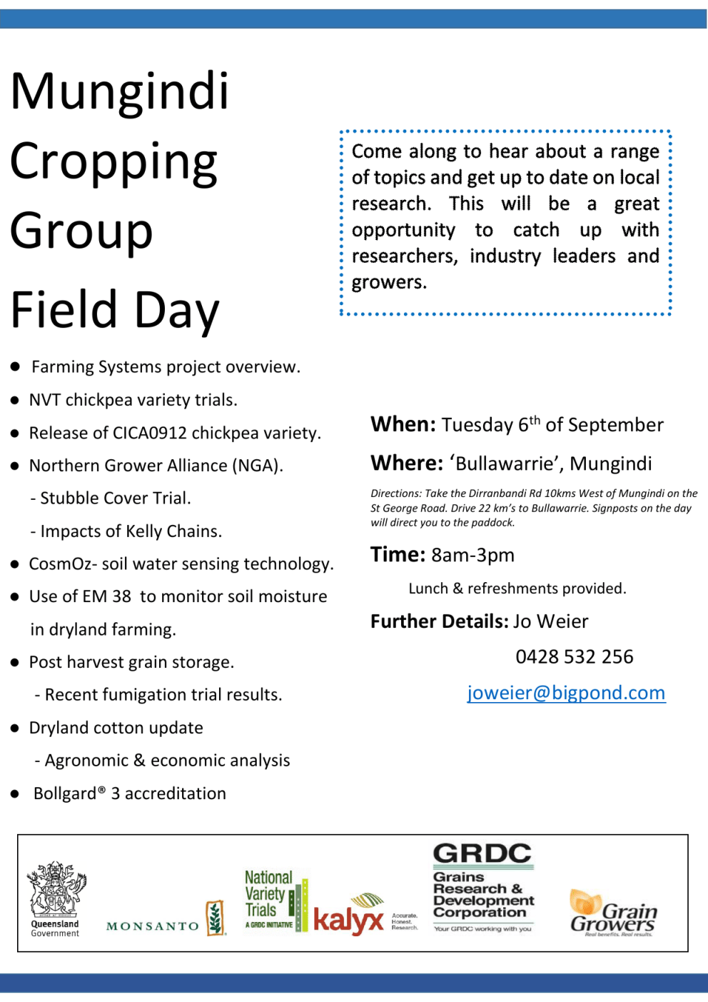 Mungindi Cropping Group Field Day ● Farming Systems project overview. ● NVT chickpea variety trials. ● Release of CICA0912 chickpea variety. When: Tuesday 6th of September ● Northern Grower Alliance (NGA). Where: ‘Bullawarrie’, Mungindi - Stubble Cover Trial. - Impacts of Kelly Chains. ● CosmOz- soil water sensing technology. ● Use of EM 38 to monitor soil moisture in dryland farming. ● Post harvest grain storage. - Recent fumigation trial results. ● Dryland cotton update - Agronomic & economic analysis ● Bollgard® 3 accreditation ● - Directions: Take the Dirranbandi Rd 10kms West of Mungindi on the St George Road. Drive 22 km’s to Bullawarrie. Signposts on the day will direct you to the paddock. Time: 8am-3pm Lunch & refreshments provided. Further Details: Jo Weier 0428 532 256 [email protected]