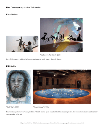 How Contemporary Artists Tell Stories Kara Walker "Darkytown Rebellion" (2001) Kara Walker uses traditional silhouette technique to retell history through fiction. Kiki Smith "Wolf Girl" (1999) "Constellation" (1996) Kiki Smith says that art is “a way to think." Smith creates open-ended art that has meaning to her. She hopes that others’ can find their own meaning in her art. Adapted from Art21, Inc. (2010). Stories & contemporary art. Retrieved from http://www.pbs.org/art21/series/seasontwo/stories.html