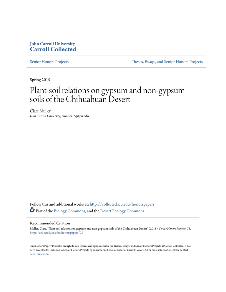John Carroll University Carroll Collected Senior Honors Projects Theses, Essays, and Senior Honors Projects Spring 2015 Plant-soil relations on gypsum and non-gypsum soils of the Chihuahuan Desert Clare Muller John Carroll University, [email protected] Follow this and additional works at: http://collected.jcu.edu/honorspapers Part of the Biology Commons, and the Desert Ecology Commons Recommended Citation Muller, Clare, "Plant-soil relations on gypsum and non-gypsum soils of the Chihuahuan Desert" (2015). Senior Honors Projects. 75. http://collected.jcu.edu/honorspapers/75 This Honors Paper/Project is brought to you for free and open access by the Theses, Essays, and Senior Honors Projects at Carroll Collected. It has been accepted for inclusion in Senior Honors Projects by an authorized administrator of Carroll Collected. For more information, please contact [email protected]. Muller 1 Clare Muller Plant-soil relations on gypsum and non-gypsum soils of the Chihuahuan Desert Introduction Soil chemistry is an important environmental filter driving the ecology of plants (Laliberte et al. 2014). Soil conditions can restrict establishment and distribution of plant species, leading to strong phenotypic selection for edaphically endemic plants—species that only grow on specific soil types. These plants are spatially limited to the distributions of a particular soil system and are highly specialized to their habitats (Anacker 2011). The patchy distributions of unusual soils, in combination with the highly specialized endemics that inhabit these regions, make them biodiversity hotspots (Escudero et al. 2014). Edaphic endemics contribute to a large portion of the world’s biodiversity despite their limited distribution (Damschen et al. 2011). Such communities are vulnerable to the effects of disturbance because unusual soils are spatially patchy and isolated, endemics are highly specialized, and the resources present in arid soil environments where such soils commonly exist are limited (Damschen et al. 2011). Soils rich in gypsum (CaSO42H2O) epitomize these biodiverse plant communities. Although gypsum deposits occur globally, gypsum soils are almost completely restricted to arid and semiarid regions, as evaporative demand creates capillary uplift of gypsum to surface soil layers, creating gypsum crusts; in more mesic or humid environments, water infiltration and percolation prevents gypsum crust development (Escudero et al. 2014, Parsons 1976). Compared to saline soils, gypsum’s solubility impacts plant species in a different way from soils high in soluble ions (Herrero and Porta 2000; Escudero et al. 2014). Because gypsum soils have a less negative osmotic potential than saline soils, ion toxicity is not as significant on gypsum Muller 2 soils as saline or sodic soils (Herrero and Porta 2000). In fact, gypsum can act as a dispersive agent in saline or sodic soils, minimizing ionic stress (Escudero et al. 2014). However, other characteristics of gypsum soils may limit plant nutrient availability. High sulfate may induce nutrient deficiencies due to ion competition at the root surface (Marschner 2012), and its high Ca/Mg ratio may limit availability of some macro- and micronutrients, due to precipitation and complexation with calcium ions (e.g., precipitation of insoluble Ca-P phases), and the potential for high Ca2+ to limit uptake of K+ and Mg2+ due to similarity in size and charge (Marschner 2012). Additionally, as gypsum concentration increases in soils, cation exchange capacity decreases, further limiting nutrient availability (Escudero et al. 2014, Castillejo et al. 2011). The effects of the unique soil properties of gypsum, compounded by the deficiency of nutrient and water resources of arid environments, present a challenge for plant establishment and success. Understanding the specific drivers of gypsum endemism is an area of focused research currently, particularly in Europe. Early work from the Mojave Desert suggested soil physical factors appeared to drive patterns of distribution and abundance of plants on and off gypsum soils more than differences in soil chemistry (Meyer 1986). In general, species able to penetrate the gypsum surface crust were able to grow and establish in these soils, although they also were capable of growing in non-gypsum soils. As a result, the author concluded that rather than chemical soil features, physical features were a main driver of plant distribution and abundance in these soils. However, drought-imposed nutrient deficiencies in these Mojave species may mask any gypsum-specific effects of soil chemistry on plant distribution and abundance (Parsons 1976), and therefore, this site may not be optimal for testing hypotheses regarding plant-soil chemical feedbacks. More current work from Europe suggests that gypsophiles are adapted to the unique chemistry of gypsum soils, as indicated by the unique leaf nutrient signatures in Muller 3 gypsophiles versus gypsovags (i.e., plants growing both on and off gypsum soils) (Palacio et al. 2007, 2014). In general, regionally dominant gypsophiles have higher concentrations of inorganic compounds than gypsovags, and in some cases accumulate calcium oxalate crystals. The unique leaf nutrient signatures of gypsophiles are strong evidence of physiological specialization in the gypsum flora of Spain. Although extensive work on the systematics of the Chihuahuan Desert gypsum flora has been conducted (Moore and Jansen 2007, Moore et al. 2014), no previous research, to our knowledge, has investigated the potential physiological adaptations of the gypsum flora of this region. The Chihuahuan Desert provides an excellent study system for questions of adaptation to gypsum soil. This area is known for the some of the largest outcrops of gypsum in North America (Parsons 1976). Additionally, summer monsoon precipitation reduces the strength of summer drought, potentially reducing the severity of drought-induced nutrient limita