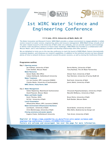 1st WIRC Water Science and Engineering Conference 13-14 July, 2016, University of Bath, Bath, UK The Water Innovation and Research Centre: WIRC@Bath provides a unique environment to engage globally in collaborative research on water science, engineering, policy and resource management. WIRC@Bath brings virtually all of the water related research at the University of Bath under one umbrella, and can provide expertise and knowledge to deliver multi-disciplinary solutions to future water challenges. WIRC@Bath was founded as a collaboration with Wessex Water, and is now looking to broaden and develop relationships with other partners. We are delighted to invite you to this two-day conference to mark the launch of WIRC@Bath, feature internationally renowned speakers, and showcase our research capabilities. In addition to the technical sessions we have allowed plenty of time to network & discuss research around the poster sessions, as well as during the Conference Dinner. Programme outline: Day 1: Opening session Jan Hofman, University of Bath Bernie Morley, University of Bath Colin Skellett, Wessex Water Tony Rachwal, The UK Water Partnership Water Resources Steven Wade, Met Office Alistair Hunt, University of Bath Gideon Wolfaardt, Stellenbosch University Paul Sherlock, University of Surrey/RedR UK Water Treatment Urs von Gunten, EPFL Lausanne/EAWAG Rod Scott, University of Bath Charles Banks, University of Southampton Jannis Wenk, University of Bath WIRC Dinner, Pump Room, Bath Day 2: Water Management Stefan Nijwening, Waterboard Vechtstromen Chrysoula Papacharalampou, University of Bath David Peacock, Wessex Water Marcelle McManus, University of Bath Water and Public Health Kevin Thomas, NIVA Bruce Petrie, University of Bath Ed Feil, University of Bath Ruth Barden, Wessex Water Lunch Presentation Alfred Johny Wüest, EPFL Lausanne/EAWAG Water Environment Infrastructure Resilience Lee Bryant, University of Bath David Butler, University of Exeter Chris Blenkinsopp, University of Bath Mike Wells, Biodiversity by Design Ltd Closing ceremony and poster awards Eugene Cloete, Stellenbosch University Tom Arnot, University of Bath Register at https://www.eventbrite.co.uk/e/first-wirc-water-science-andengineering-conference-tickets-25538961722#tickets Posters are welcome and encouraged. See over the page for more information. Phone: 555-555-5555 Fax: 555-555-5555 Email: [email protected] Poster Awards: We welcome the submission of posters from all delegates. There will be three poster sessions during the conference, and the best 3 posters will receive awards at the closing ceremony. Please register your poster at bathreg.onlinesurveys.ac.uk/1st-wirc-conference-poster-registration by 8th July 2016. Venue: The Edge, University of Bath, Bath, BA2 7AY, UK Travel Information: The University of Bath is located at the southeast edge of Bath. Both bus U1 and U18 link the city centre and the University. For directions and other travel information, please visit www.bath.ac.uk/travel-advice/ Accommodation: Bath is a very popular city to visit and offers a wide range of accommodation. VisitBath (visitbath.co.uk/ accommodation) has a good selection of hotels and guest houses. We advise you to book early as July can be a very busy time. Conference Dinner: The conference dinner will be held in the Pump Rooms, Bath, BA1 1LZ (www.romanbaths.co.uk/pump-roomrestaurant). The Pump Room Restaurant in Bath is one of the city’s most elegant places to enjoy stylish, modernBritish cuisine. The Pump Room is a Grade I listed historic building. Construction of the main block, built of Bath stone, was started in 1789 by Thomas Baldwin. Contact: [email protected] Register at https://www.eventbrite.co.uk/e/first-wirc-water-science-andengineering-conference-tickets-25538961722#tickets Phone: 555-555-5555 Fax: 555-555-5555 Email: [email protected]