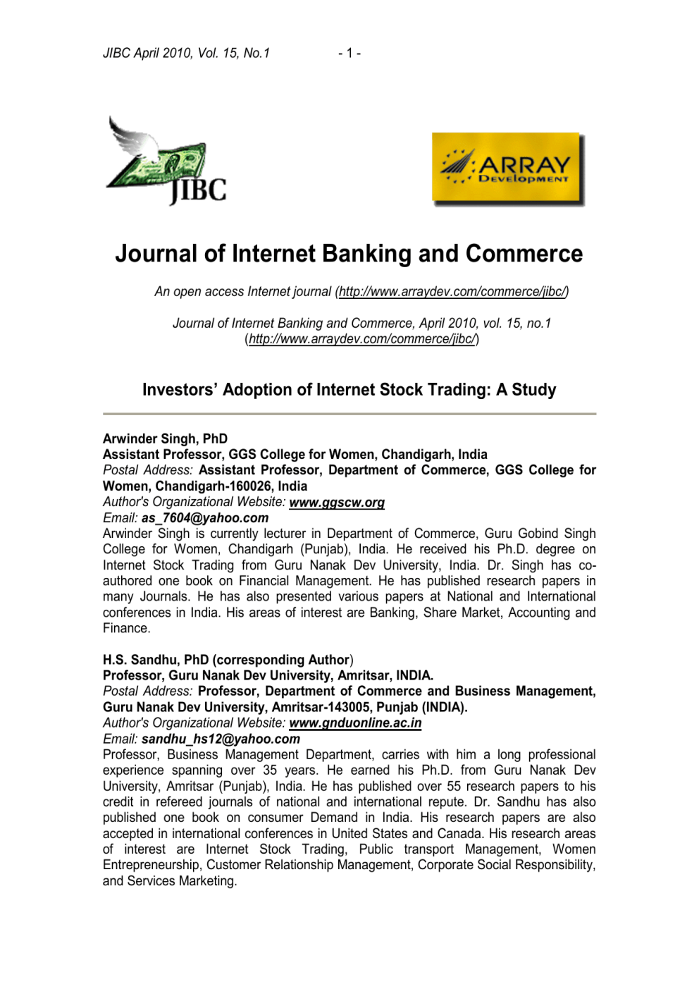 JIBC April 2010, Vol. 15, No.1 -1- Journal of Internet Banking and Commerce An open access Internet journal (http://www.arraydev.com/commerce/jibc/) Journal of Internet Banking and Commerce, April 2010, vol. 15, no.1 (http://www.arraydev.com/commerce/jibc/) Investors’ Adoption of Internet Stock Trading: A Study Arwinder Singh, PhD Assistant Professor, GGS College for Women, Chandigarh, India Postal Address: Assistant Professor, Department of Commerce, GGS College for Women, Chandigarh-160026, India Author's Organizational Website: www.ggscw.org Email: [email protected] Arwinder Singh is currently lecturer in Department of Commerce, Guru Gobind Singh College for Women, Chandigarh (Punjab), India. He received his Ph.D. degree on Internet Stock Trading from Guru Nanak Dev University, India. Dr. Singh has coauthored one book on Financial Management. He has published research papers in many Journals. He has also presented various papers at National and International conferences in India. His areas of interest are Banking, Share Market, Accounting and Finance. H.S. Sandhu, PhD (corresponding Author) Professor, Guru Nanak Dev University, Amritsar, INDIA. Postal Address: Professor, Department of Commerce and Business Management, Guru Nanak Dev University, Amritsar-143005, Punjab (INDIA). Author's Organizational Website: www.gnduonline.ac.in Email: [email protected] Professor, Business Management Department, carries with him a long professional experience spanning over 35 years. He earned his Ph.D. from Guru Nanak Dev University, Amritsar (Punjab), India. He has published over 55 research papers to his credit in refereed journals of national and international repute. Dr. Sandhu has also published one book on consumer Demand in India. His research papers are also accepted in international conferences in United States and Canada. His research areas of interest are Internet Stock Trading, Public transport Management, Women Entrepreneurship, Customer Relationship Management, Corporate Social Responsibility, and Services Marketing. JIBC April 2010, Vol. 15, No.1 -2- S.C. Kundu, PhD Professor, Guru Jambheshwar University of Science and Technology, Hisar, INDIA Postal Address: Professor, Haryana School of Business, Guru Jambheshwar University of Science and Technology, Hisar-125001, Haryana (INDIA). Author's Organizational Website: www.gju.ernet.in Email: [email protected] Haryana School of Business, has 24 years of experience in his credit. He received his Ph.D. degree from Kurukshetra University, India, on Japanese Human Resource Management. Dr. Kundu has authored four books. He has completed two major research projects funded by UGC, India. He has published papers on HRM, Entrepreneurship, Information Management, International Management, Consumer Behavior and Cross-cultural Management in journals like Human Resource Planning, Industrial Management and Data Systems, Asia Pacific Management Review, International Journal of Management and Enterprise Development, International Journal of Consumer Studies, etc. His research papers have also been accepted in international conferences held in Malaysia, Korea, Hong Kong (China), USA, Slovenia, Thailand, Australia, Spain and India. He is the member of EMERALD Publishing Group, UK. His areas of interest are Human Resource Management, Cross-Cultural Management, Strategic Management, Entrepreneurship, Information Management, and Consumer Behavior. Abstract The purpose of this paper was to examine whether investors who adopted Internet stock trading perceived differently from those of non-adopters. The primary data based on 299 investors (149 adopters and 150 non-adopters) were analyzed using advanced multivariate techniques like factor analysis and discriminant analysis besides percentages, means, and Z-test. Results indicated that attitude dimensions and demographic variables contributed significantly in classifying investors as adopters or non-adopters in Internet trading. As regards attitude dimensions, ‘variety of financial products and safety’ contributed significantly in discriminating between adopters and non-adopters of Internet trading followed by the factor such as ‘convenience and transparency’. As far as the demographics were concerned, the mature/older, experienced, and businessmen investors were less likely to use Internet stock trading as compared to young, inexperienced, and non-businessmen investors. Keywords: Internet stock trading; Investors; Attitude; Demographic variables; Discriminant analysis; India. © Singh, Sandhu & Kundu, 2010 INTRODUCTION Technological advances have influenced and facilitated the operations of business transactions. The recent technological advancement is the Internet technology that has transformed the entire business marketplace (Burt and Sparks, 2003). With the help of the Internet, we can communicate interactively and instantly over vast distances, receive a wide array of information, and conduct business from remote without human JIBC April 2010, Vol. 15, No.1 -3- assistance. Personal investing is one of the areas facilitated by Internet. The do-ityourself investing originated in 1970s as a result of the deregulation of the brokerage industry (Konana and Balasubramanian, 2005). However, due to the IT revolution, the on-line approach has helped individual investors to have better control on their investments (Looney and Chatterjee, 2002). With the proliferation of the Internet, more banks and stock brokerage firms are offering on-line financial services. Investors can gain access to various kinds of information on financial planning, e.g., real-time stock prices, portfolio management, etc. Increasingly, traders are attracted toward the on-line investing for advice and information (Farrell, 1999). The trade through Internet is executed and confirmed instantly (Wong, 2000). SIGNIFICANCE AND OBJECTIVES OF THE STUDY Internet stock trading in India is a new phenomenon. Indian Stock Markets’ Regulator, the 