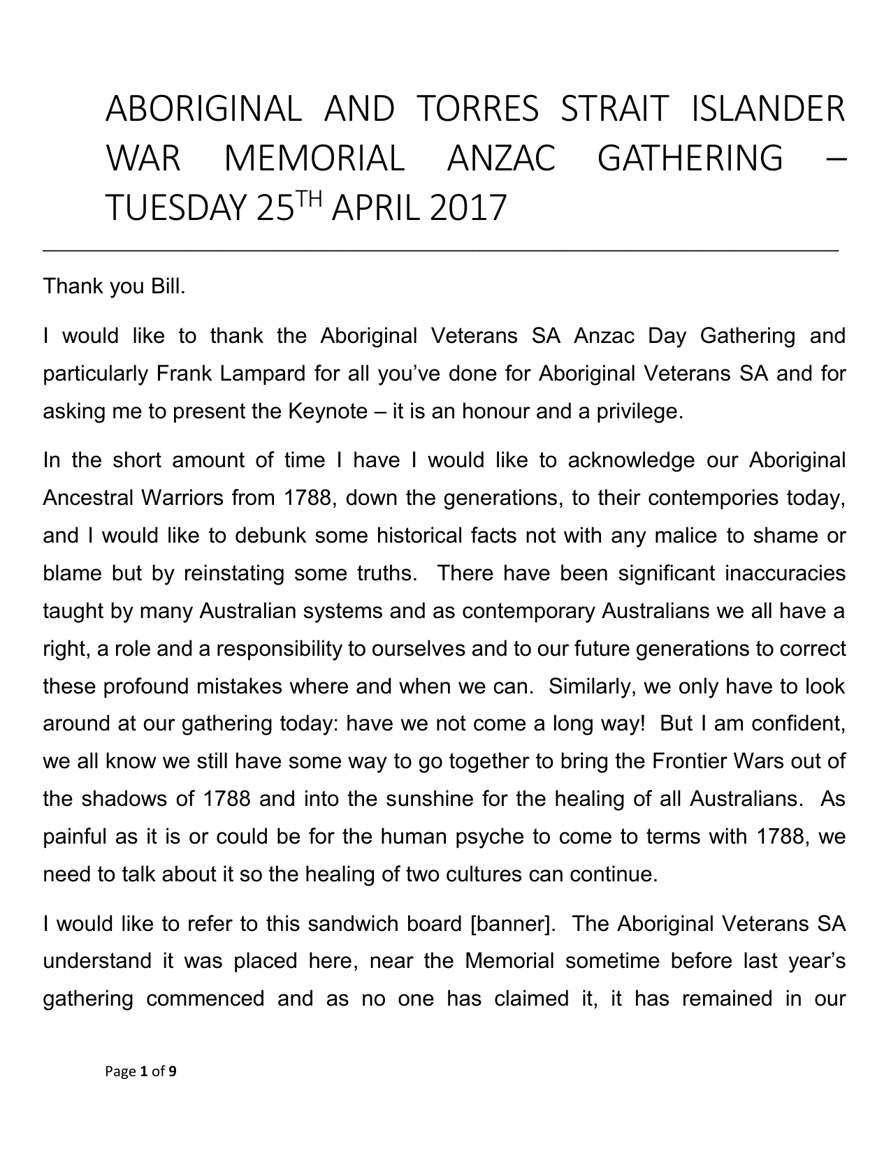 ABORIGINAL AND TORRES STRAIT ISLANDER WAR MEMORIAL ANZAC GATHERING – TUESDAY 25TH APRIL 2017 __________________________________________________________________________________ Thank you Bill. I would like to thank the Aboriginal Veterans SA Anzac Day Gathering and particularly Frank Lampard for all you’ve done for Aboriginal Veterans SA and for asking me to present the Keynote – it is an honour and a privilege. In the short amount of time I have I would like to acknowledge our Aboriginal Ancestral Warriors from 1788, down the generations, to their contempories today, and I would like to debunk some historical facts not with any malice to shame or blame but by reinstating some truths. There have been significant inaccuracies taught by many Australian systems and as contemporary Australians we all have a right, a role and a responsibility to ourselves and to our future generations to correct these profound mistakes where and when we can. Similarly, we only have to look around at our gathering today: have we not come a long way! But I am confident, we all know we still have some way to go together to bring the Frontier Wars out of the shadows of 1788 and into the sunshine for the healing of all Australians. As painful as it is or could be for the human psyche to come to terms with 1788, we need to talk about it so the healing of two cultures can continue. I would like to refer to this sandwich board [banner]. The Aboriginal Veterans SA understand it was placed here, near the Memorial sometime before last year’s gathering commenced and as no one has claimed it, it has remained in our Page 1 of 9 possession as a significant reminder that we must not forget the Frontier Wars! We think it’s also a reminder to tell us our Frontier Warriors always were and always will be our original wartime Warrior’s. The Board talks about the Frontier Wars beginning in 1788 through to1930’s. We encourage you to have a read in your own time but it is very graphic in highlighting the NSW’s Governor Lachlan MacQuarie’s annoucment in 1816. It says: ‘all Aborigines from Sydney onwards are to be made prisoners of war and if they resist they are to be shot and their bodies hung from trees in the most conspicous places near where they fall, so as to strike terror into the hearts of survivng natives’. The board also identifies massacres dating from 1816 – 1928 across NSW; WA; VIC; QLD. As a Griefologist, I remember about 23 years ago asking myself a question: what makes another human being commit such inhumane attrocities upon another human being and not have the human capacity to see, feel or hear the pain of that victim? I also remember realising I had a responsibility to stop ‘demonising’ the arrival of 1788 by not asking ‘what happened’ and instead asking ‘why it happended’. So as a Griefologist I hope you forgive me, for I always seek out, where possible, the other side to any story and in this context, our modern Australian history. So, being asked to present the Keynote Speech titled ‘Always Warriors’, came with its own healthy dose of fear and anxiety! Fear and anxiety because I thought, ‘How do I tell the two sides of a 229 year old story knowing ‘Always Warriors’ had to begin by acknowledging the Frontier Wars without malice, or shame or blame?, How do I tell ‘why did it happen’ from a place of truth, justice, compassion and humility?’ It was then the Ancestors reminded me: be still and listen as you write and we will guide you to ‘tell the story’ of our time being Ancestral Warriors during the Frontier Page 2 of 9 Wars and know we always were and always will be your Spiritual Ancestors yesterday, today and tomorrow. And so, I share this with you: For those who have not heard of the term ‘Frontier Wars’ it occurred in the 18th century, when 1788 ‘arrived’ causing what many refer to as the invasion/colonisation. When it ‘arrived’ in Sydney Harbour it brought the First, Second,Third and every fleet thereafter with its European infrastructure as business enterprises, Corporations, government officials and their justice system. The Frontier Wars is what brought our Ancestors into first contact with not just white people but an infrastructue they had never. Similarly, it had an inhumane justice system via the courts, prison and the police or Troopers as they were called back then, to control every aspect of a convict’s life. As a Griefologist, I recognise their suppressed unresolved grief, anger and rage would escalate into grief violence and inhumane atrocities not just when 1788 ‘arrived’ here but against other Indigenous peoples around the world. Inhumane atrocities came in the form of genocide and how this was implemented was to introduce three warfares to reduce the numbers of our Aboriginal ancestors. The first two warfares introduced are outright warfare, that is killings and massacres and germ warfare – small pox and other diseases. Outright warfare and germ warfare, was endured by many of our ancestral men, women and children who only had boomerangs, spears and nulla-nullas to fight for the rights to their land, families and culture. They lost against well-developed outright warfare because they had mastered the use of weaponry. Our Ancestral Warriors died in unimaginable numbers and endured unimaginable mental, emotional and physical pain and really should become our first category of ‘foot soldiers’. Page 3 of 9 From a place of truth, justice, compassion and humility Bruce Elder an Australian award-winning journalist and author of his book: 1‘Blood on the Wattle: Massacres and maltreatment of Aboriginal Australians in 1788’, goes on to say in his preface: 2 the massacres of Aboriginal people, painful and shameful as they are, should be as much a part of Australian history as the first fleet, the explorers, the gold rushes and the bush ranges.’ I thank you Bruce Elder for opening himself up to be shamed and criticised, p