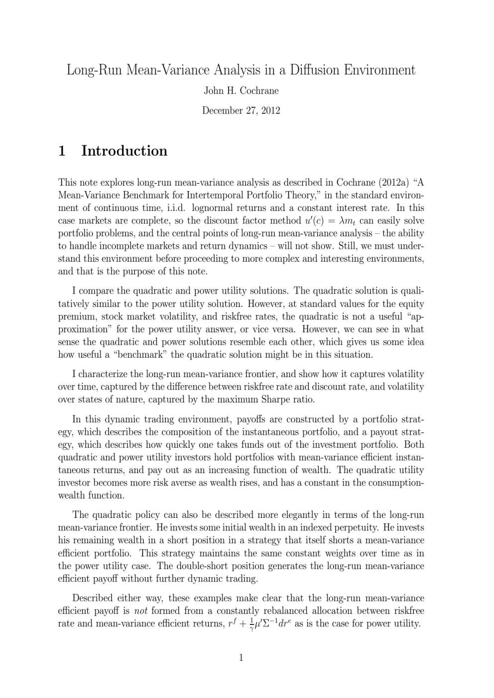 This note explores long-run mean-variance analysis as described in Cochrane (2012a) “A