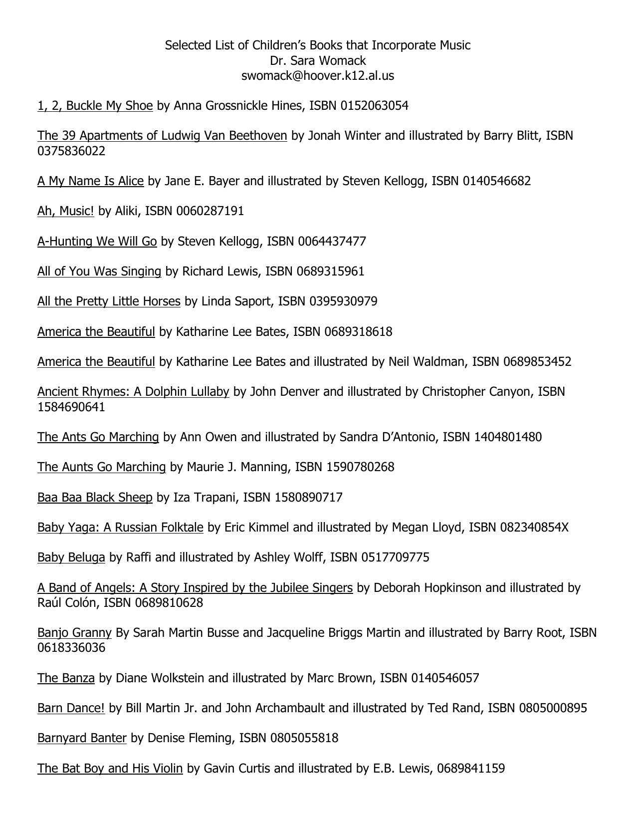 Selected List of Children’s Books that Incorporate Music Dr. Sara Womack [email protected] 1, 2, Buckle My Shoe by Anna Grossnickle Hines, ISBN 0152063054 The 39 Apartments of Ludwig Van Beethoven by Jonah Winter and illustrated by Barry Blitt, ISBN 0375836022 A My Name Is Alice by Jane E. Bayer and illustrated by Steven Kellogg, ISBN 0140546682 Ah, Music! by Aliki, ISBN 0060287191 A-Hunting We Will Go by Steven Kellogg, ISBN 0064437477 All of You Was Singing by Richard Lewis, ISBN 0689315961 All the Pretty Little Horses by Linda Saport, ISBN 0395930979 America the Beautiful by Katharine Lee Bates, ISBN 0689318618 America the Beautiful by Katharine Lee Bates and illustrated by Neil Waldman, ISBN 0689853452 Ancient Rhymes: A Dolphin Lullaby by John Denver and illustrated by Christopher Canyon, ISBN 1584690641 The Ants Go Marching by Ann Owen and illustrated by Sandra D’Antonio, ISBN 1404801480 The Aunts Go Marching by Maurie J. Manning, ISBN 1590780268 Baa Baa Black Sheep by Iza Trapani, ISBN 1580890717 Baby Yaga: A Russian Folktale by Eric Kimmel and illustrated by Megan Lloyd, ISBN 082340854X Baby Beluga by Raffi and illustrated by Ashley Wolff, ISBN 0517709775 A Band of Angels: A Story Inspired by the Jubilee Singers by Deborah Hopkinson and illustrated by Raúl Colón, ISBN 0689810628 Banjo Granny By Sarah Martin Busse and Jacqueline Briggs Martin and illustrated by Barry Root, ISBN 0618336036 The Banza by Diane Wolkstein and illustrated by Marc Brown, ISBN 0140546057 Barn Dance! by Bill Martin Jr. and John Archambault and illustrated by Ted Rand, ISBN 0805000895 Barnyard Banter by Denise Fleming, ISBN 0805055818 The Bat Boy and His Violin by Gavin Curtis and illustrated by E.B. Lewis, 0689841159 The Bear: An American Folk Song by Kenneth Spengler, ISBN 1590341902 Beethoven Lives Upstairs by Barbara Nichol and illustrated by Scott Cameron, ISBN 0531068285 Ben’s Trumpet by Rachel Isadora, ISBN 0688109888 Berlioz the Bear by Jan Brett, ISBN 0698113993 Bling Blang by Woody Guthrie and illustrated by Vladimir Radunsky, ISBN 076360769X Brahms by Ann Rachlin and illustrated by Susan Helland, ISBN 8574160784 The Bravest Flute: A Story of Courage in the Mayan Tradition by Ann Grifalconi, ISBN 0316328782 The Bremen Town Musicians by the Brothers Grimm and illustrated by Pamela Baldwin Ford, ISBN 0805047905 Buffalo Girls by Bobbette McCarthy, ISBN 0517565684 Cadillac by Charles Temple and illustrated by Lynne Lockhart, ISBN 0399226540 Caps for Sale by Esphyr Slobodkina, ISBN 0064431439 Carnival of the Animals: Poems Inspired by Saint-Saëns' Music by Judith Chernaik and illustrated by Satoshi Kitamura, ISBN 0763629601 Carnival of the Animals by John Lithgow and illustrated by Boris Kulikov, ISBN 0689873433 Carnival of the Animals by Barrie Carson Turner, ISBN 0805061800 Carnival of the Animals: Classical Music for Kids by Barrie Carson Turner and illustrated by Sue Williams, ISBN 0805061802 Cat Goes Fiddle-I-Fee by Paul Galdone, ISBN 08991977051 The Cello of Mr. O by Jane Cutler, ISBN 0525461191 Charlie Parker Played Bebop by Chris Raschka, ISBN 0531070956 A Cheerful Note for Jack by Arlene Boehm, ISBN 1570980810 Chicken Joy on Redbean Road: A Bayou Country Romp by Jacqueline Briggs Martin and illustrated by Melissa Sweet, ISBN 0618507590 The Completed Hickory Dickory Dock by Jim Sylesworth and illustrated by Eileen Christelow, ISBN 0689718624 Crash! Bang! Boom! by Peter Spier, ISBN 0385067801 Crocodile Beat by G. Jorgenson, ISBN 0027480100 Cumbayah illustrated by Floyd Cooper, ISBN 0688135439 Dancing Drum: A Cherokee Legend by Terri Cohlene and illustrated by Charles Reasoner, ISBN 0816723621 Deck the Hall: A Traditional Carol illustrated by Sylvia Long, ISBN 0811828212 Dinosaur Roar by Paul and Henrietta Strickland, ISBN 0140568080 Do Re Mi: If You Can Read Music, Thank Guido D’Arezzo by Susan Roth, 0618465729 Do Your Ears Hang Low?: A Love Story illustrated by Caroline Church, ISBN 0439128714 Don’t Wake Up Mama by Eileen Christelow, ISBN 0395764793 Don’t Worry, Be Happy by Bobby McFerrin, ISBN 0941807517 Down by the Bay by Raffi and illustrated by Nadine Bernard Westcott, ISBN 0517800586 Down by the Station by Will Hillenbrand, ISBN 0152018042 Dreamsong by Alice McLerran and illustrated by Valery Vasiliev, ISBN 0831743573 Duke Ellington by Andrea Davis Pinkney and illustrated by Brian Pinkney, ISBN 0786821507 Earthsong by Sally Rodgers, ISBN 0525458735 The Eensy-Weensy Spider by Mary Ann Hoberman and illustrated by Nadine Bernard Westcott, ISBN 0316363308 Ella Fitzgerald: The Tale of a Vocal Virtuosa by Andrea Pinkney and illustrated by Brian Pinkney, ISBN 0786805686 Ernie Dances to the Didgeridoo by Alison Lester, ISBN 0618104429 The Farewell Symphony by Anna Harwell Celenza, ISBN 1570914060 The Farmer in the Dell by Mary Maki Rae, ISBN 0670818534 A Farmyard Song by Christopher Manson, ISBN 1558581693 Fiddle-i-fee by Santiago Cohen, ISBN 1593540205 Fiddle-i-fee by Will Hillenbrand, ISBN 0152019456 Fiddle-i-fee by Melissa Sweet, ISBN 0316758612 The First Song Ever Sung by Laura Krauss Melmed, ISBN 0140554572 Fishes by Brian Wildsmith, ISBN 0192721518 Five Green and Speckled Frogs by Priscilla Burris, ISBN 0439354899 Five Little Ducks by Raffi and illustrated by Jose Aruego and Ariane Dewey, ISBN 0517800578 Five Little Monkeys Jumping on the Bed by Eileen Christelow, ISBN 0395557011 Five Little Monkeys Sitting in a Tree by Eileen Christelow, ISBN 0395664136 Follow the Drinking Gourd by Jeanette Winter, ISBN 0679819975 The Fox Went Out on a Chilly Night: An Old Song illustrated by Peter Spier, ISBN 0440408296 Frog Went A-Courtin’ by John Langstaff, ISBN 0156339005 Froggie Went A-Courtin’ by Iza Trapani, ISBN 1580890288 Froggie Went A-Courting: An Old Tale with a New Twist by Marjorie Priceman, ISBN 0316712272 Froggy Plays in the Band by Jonathan London and illustrated by Frank Remkiewicz, ISBN 0670035327 From a Distance by Julie Gold and illustrated by Jane Ray, ISBN 0525458727