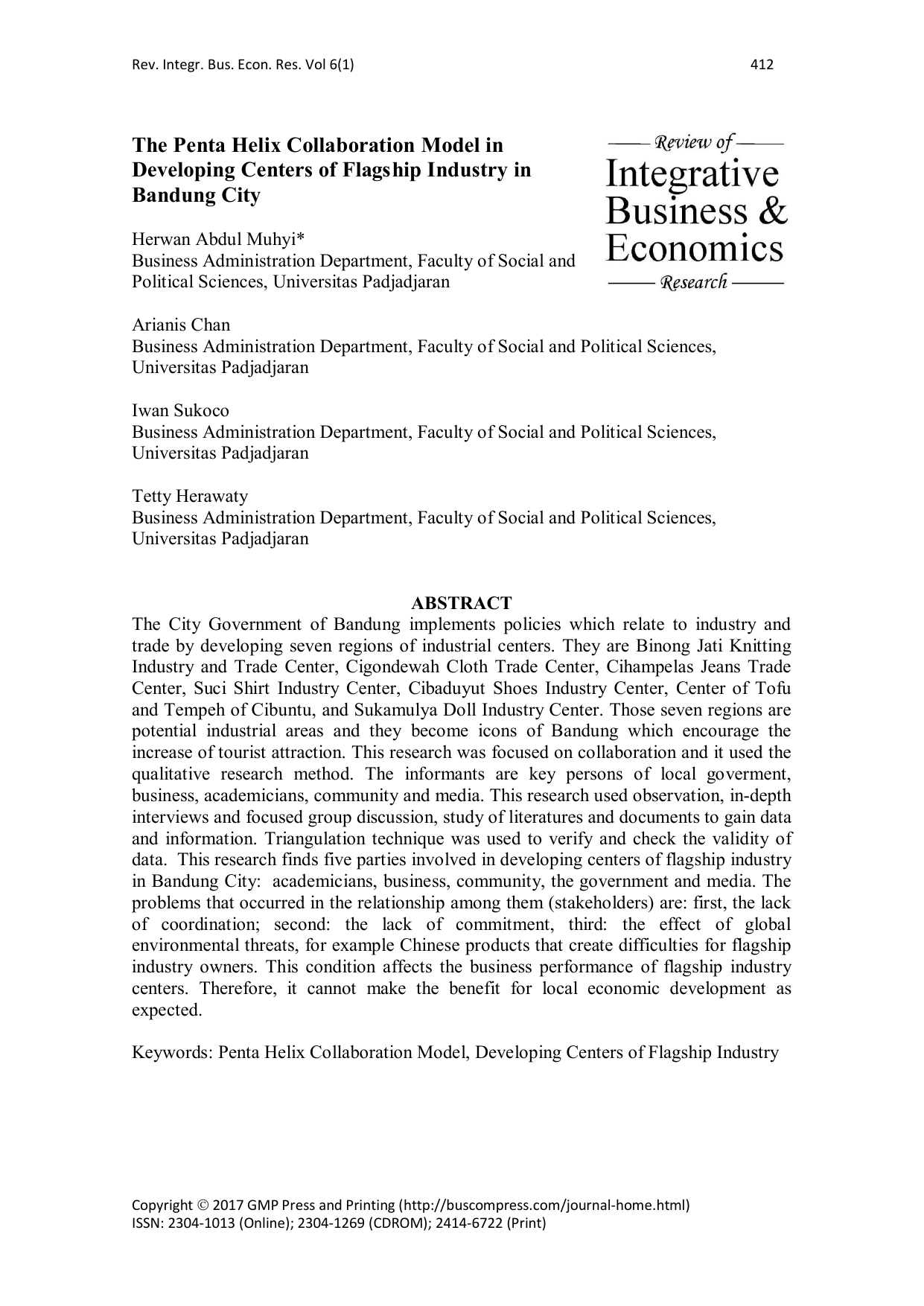 Rev. Integr. Bus. Econ. Res. Vol 6(1) 412 The Penta Helix Collaboration Model in Developing Centers of Flagship Industry in Bandung City Herwan Abdul Muhyi* Business Administration Department, Faculty of Social and Political Sciences, Universitas Padjadjaran Arianis Chan Business Administration Department, Faculty of Social and Political Sciences, Universitas Padjadjaran Iwan Sukoco Business Administration Department, Faculty of Social and Political Sciences, Universitas Padjadjaran Tetty Herawaty Business Administration Department, Faculty of Social and Political Sciences, Universitas Padjadjaran ABSTRACT The City Government of Bandung implements policies which relate to industry and trade by developing seven regions of industrial centers. They are Binong Jati Knitting Industry and Trade Center, Cigondewah Cloth Trade Center, Cihampelas Jeans Trade Center, Suci Shirt Industry Center, Cibaduyut Shoes Industry Center, Center of Tofu and Tempeh of Cibuntu, and Sukamulya Doll Industry Center. Those seven regions are potential industrial areas and they become icons of Bandung which encourage the increase of tourist attraction. This research was focused on collaboration and it used the qualitative research method. The informants are key persons of local goverment, business, academicians, community and media. This research used observation, in-depth interviews and focused group discussion, study of literatures and documents to gain data and information. Triangulation technique was used to verify and check the validity of data. This research finds five parties involved in developing centers of flagship industry in Bandung City: academicians, business, community, the government and media. The problems that occurred in the relationship among them (stakeholders) are: first, the lack of coordination; second: the lack of commitment, third: the effect of global environmental threats, for example Chinese products that create difficulties for flagship industry owners. This condition affects the business performance of flagship industry centers. Therefore, it cannot make the benefit for local economic development as expected. Keywords: Penta Helix Collaboration Model, Developing Centers of Flagship Industry Copyright 2017 GMP Press and Printing (http://buscompress.com/journal-home.html) ISSN: 2304-1013 (Online); 2304-1269 (CDROM); 2414-6722 (Print) Rev. Integr. Bus. Econ. Res. Vol 6(1) 413 I. INTRODUCTION Bandung City has seven industrial centers. They are Binongjati Knitting Industry and Trade Center, Cigondewah Cloth Trade Center, Cihampelas Jeans Trade Center, Suci Shirt Industry Center, Cibaduyut Shoes Industry Center, Center of Tofu and Tempeh Cibuntu and Sukamulya Dool Industry Center. Those industrial centers are potential sources for improving business activity and local income of Bandung City. Based on the research, there are five stakeholders in developing centers of flagship industry in Bandung City. Therefore, this collaboration is called penta helix. The term penta helix is often heard in seminars or discussions. It focuses on developing entrepreneurship or small and medium enterprises by academicians, business, community, government and media. Stakeholders are defined as every group or individual that influences or is influenced by organizational objective achievement (Freeman, 1984). The existing condition of relationship among stakeholders is still divided. Therefore, the impact of collaboration is not optimal in developing centers of flagship industry in Bandung City. The problems of collaboration in this case are lack of coordination and lack of commitment among stakeholders. The example is coordination between the government and industrial community in designing the training program. Sometimes, in some programs the content of training is irrelevant to the needs. Communication among the parties is not effective enough for a partnership process among stakeholders. The role of each party in this partnership is described in this pre-observation and early interview. Academicians in Bandung City have a role as the advisor and they facilitate the development from scientific and knowledge perspectives. Ideas and methods from academicians contribute to the government’s policy making process. Business is an entity which conducts the business process in creating value added and maintains sustained growth. Community has a significant role in improving centers of industry. Community is a facility for businessmen in developing and strengthening business entities. The government is a regulator and catalyst in developing centers of flagship industry. Media is a channel of industry to promote and make brand image. II. LITERATURE REVIEW The ‘Penta-Helix Model’ is based on five stakeholder types: businesses, public administration, local residents, the knowledge sector and capital. The model is very useful for multi stakeholder problem areas where stakeholders represent a range of interests on a site or problem. Penta helix (Lindmark, Sturesson & Roos, 2009: 24) is an extension of the triple helix strategy by involving various elements of the community or non-profit institutions in order to realize the innovation. Through synergistic collaboration it is expected to realize an innovation that is supported by a variety of resources that interact synergistically. Academicians are knowledge resources. They have concepts, theories in developing business to gain sustainable competitive advantage. Community is the people who have same interest and relevant to business that developed. Government is one of staheholders who has regulation and reponsibility in developing business. Business is an Copyright 2017 GMP Press and Printing (http://buscompress.com/journal-home.html) ISSN: 2304-1013 (Online); 2304-1269 (CDROM); 2414-6722 (Print) Rev. Integr. Bus. Econ. Res. Vol 6(1) 414 entity which has the activity in processing goods or services to be valuable. Meanwhile, media is the stakeholder that has more infor