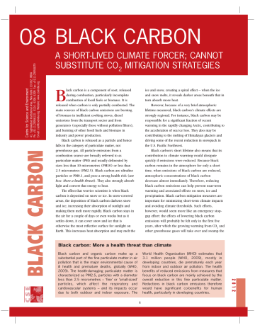 BLACK CARBON 41, Tughlakabad Institutional Area, New Delhi 110 062, INDIA Ph: +91-11-29956110 - 5124 - 6394- 6399 Fax: +91-11-29955879 E-mail: [email protected] Website: www.cseindia.org Centre for Science and Environment 08 BLACK CARBON A SHORT-LIVED CLIMATE FORCER; CANNOT SUBSTITUTE CO2 MITIGATION STRATEGIES lack carbon is a component of soot, released during combustion, particularly incomplete combustion of fossil fuels or biomass. It is released when carbon is only partially combusted. The main sources of black carbon emissions are burning of biomass in inefficient cooking stoves, diesel emissions from the transport sector and from generators (especially those without pollution filters), and burning of other fossil fuels and biomass in industry and power production. Black carbon is released as a particle and hence falls in the category of particulate matter, not greenhouse gas. All particle emissions from a combustion source are broadly referred to as particulate matter (PM) and usually delineated by sizes less than 10 micrometres (PM10) or less than 2.5 micrometres (PM2.5). Black carbon are ultrafine particles or PM0.1, and pose a strong health risk (see box: More a health threat). They also strongly absorb light and convert that energy to heat. The effect that worries scientists is when black carbon is deposited on snow or ice. In snow-covered areas, the deposition of black carbon darkens snow and ice, increasing their absorption of sunlight and making them melt more rapidly. Black carbon stays in the air for a couple of days or even weeks but as it settles down, it can cover snow and ice that is otherwise the most reflective surface for sunlight on Earth. This increases heat absorption and may melt the ice and snow, creating a spiral effect – when the ice and snow melts, it reveals darker areas beneath that in turn absorb more heat. However, because of a very brief atmospheric lifetime measured, black carbon’s climate effects are strongly regional. For instance, black carbon may be responsible for a significant fraction of recent warming in the rapidly changing Arctic, contributing to the acceleration of sea ice loss. They also may be contributing to the melting of Himalayan glaciers and driving some of the recent reduction in snowpack in the U.S. Pacific Northwest. Black carbon’s short lifetime also means that its contribution to climate warming would dissipate quickly if emissions were reduced. Because black carbon remains in the atmosphere for only a short time, when emissions of black carbon are reduced, atmospheric concentrations of black carbon decrease almost immediately. Therefore, reducing black carbon emissions can help prevent near-term warming and associated effects on snow, ice and precipitation. Black carbon mitigation measures are important for minimizing short-term climate impacts and avoiding climate thresholds. Such efforts, however, would seem more like an emergency stopgap effort: the effects of lowering black carbon emissions will probably be felt only in the first five years, after which the growing warming from CO2 and other greenhouse gases will take over and swamp the B Black carbon: More a health threat than climate 1 2 0 1 2 World Health Organization (WHO) estimates that 3.1 million people (WHO, 2009), mostly in developing countries, die prematurely each year from indoor and outdoor air pollution. The health benefits of reduced emissions from measures that focus on black carbon are mainly achieved by the overall reduction in this fine particulate matter. Reductions in black carbon emissions therefore would have significant co-benefits for human health, particularly in developing countries. Black carbon and organic carbon make up a substantial part of the fine particulate matter in air pollution that is the major environmental cause of ill health and premature deaths, globally (WHO, 2009). The health-damaging particulate matter is characterized as PM2.5, particles with a diameter less than 2.5 micrometres – ‘fine’ or ‘small-sized’ particles, which affect the respiratory and cardiovascular systems – and its impacts occur due to both outdoor and indoor exposure. The BLACK CARBON 41, Tughlakabad Institutional Area, New Delhi 110 062, INDIA Ph: +91-11-29956110 - 5124 - 6394- 6399 Fax: +91-11-29955879 E-mail: [email protected] Website: www.cseindia.org Centre for Science and Environment 08 Black carbon, short-lived v carbon dioxide, long-lived Comparing the impact of short-lived climate forcers (SLCF) such as black carbon to that of carbon dioxide (CO2) on global temperatures over the long term is difficult because of the difference in the atmospheric lifetimes of the two kinds of substances. SLCFs have short lifetimes and mainly affect the near-term temperature in the first few decades after being emitted, while CO2 has a much longer lifetime and, once emitted, continues to have a major influence on the global temperature for centuries. Put another way, the shorter atmospheric lifetimes of SLCFs means that their reductions in any particular year will have a much smaller effect on global warming over the long run as compared to reducing CO2 or other long-lived greenhouse gases. gains. Because such reductions are likely to only make a modest contribution to longer-term climate goals, they must be viewed as a strategy that complements but does not replace carbon dioxide emission reductions. It is clear that deep and immediate carbon dioxide reductions are required to protect long-term climate. Besides, our understanding of the impact of aerosols on climate is not as good as our understanding of the impact of greenhouse gases, such as CO2, on the atmosphere. This is because radiative properties of aerosols vary widely and also have large temporal and spatial variations. In addition, there is a complex interaction between natural aerosols, such as dust and salt, and anthropogenic aerosols such as black carbon, organic carbon and sulphate. Despite