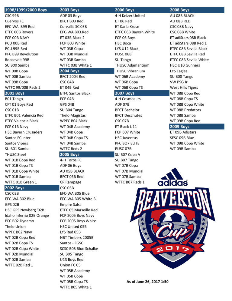 1998/1999/2000 Boys 2003 Boys 2006 Boys 2008 Boys CSC 99B Cuervos FC EFC-WA B99 Red ETFC 00B Rovers FCP 00B NAVY PCU 00B Red PCU 99B Red PFC B99 Revolution Roosevelt 99B SU B00 Samba WT 00B Copa WT 00B Samba WT 99B Copa WTFC 99/00B Reds 2 ADF 03 Boys BFCT B03 Red Corvallis SC 03B EFC-WA B03 Red ET 03B Black 2 FCP B03 White WT 03B Copa WT 03B Mundial WT 03B Samba WTFC 03B White 1 4-H Keizer United ET 06 Red ET Karla Kruse ETFC 06B Bayern White FCP 06 Boys HSC Boca LYS U12 Black PUSC 06B SU Tango THUSC Adamantium THUSC Vibranium WT 06B Academy WT 06B Copa WT 06B Copa TS AU 08B BLACK AU 08B RED CSC 08B Navy CSC 08B White ET adiStars 08B Black ET adiStars 08B Red 1 ETFC 08B Sevilla Black ETFC 08B Sevilla Red ETFC 08B Sevilla White HSC U10 Gunners LYS Eagles SU B08 Tango VW PSG Jr. West Hills Tigers WT 08B Copa Red WT 08B Copa TS WT 08B Copa White WT 08B Predators WT 08B Samba WT 09B Copa Red 2001 Boys B01 Tango CFT 01 Boys Red CSC 01B ETFC B01 Valencia Red ETFC Valencia Black FCP 01B Navy HSC Bayern Crusaders Santos FC Inter Santos Vipers SU B01 Samba THUSC Steel WT 01B Copa Red WT 01B Copa TS WT 01B Copa White WT 01B Samba WTFC 01B Green 1 2002 Boys CSC 02B EFC-WA B02 Blue GPS 02B HSC GPS Newberg '02B Idaho Inferno 02B Orange PFC B02 Dynamo Thelo Union WPFC B02 Navy WT 02B Copa Red WT 02B Copa TS WT 02B Copa White WT 02B Mundial WT 02B Samba WTFC 02B Red 1 2004 Boys BFCT 2004 Red CSC 04B ET 04B Red ETFC Santos Black FCP 04B GPS 04B SU B04 Tango Thelo Magistas WPFC B04 Black WT 04B Academy WT 04B Copa WT 04B Copa TS WT 04B Samba WTFC Reds 2 2005 Boys 4-H Toros FC ADF 06 Boys AU 05B BLACK BFCT 05B Red CR Rampage CSC 05B EFC-WA B05 Blue EFC-WA B05 White B Empire Salsa ETFC 05 Marseille Red FCP 2005 Boys Navy FCP 2005 Boys White HSC United 05B LYS Red 05B NBT Timbers 2005B Santos - FGSC SCSC B05 Blue Schalke SU B05 Tango U13 Boys Red Union FC 05 WT 05B Academy WT 05B Copa WT 05B Copa TS WTFC B05 White 1 2007 Boys 4-H Cosmos Jrs ADF 07B BFCT Bachelor BFCT Deschutes CSC 07B ET Black U11 FCP B07 White HSC Juventus PFC BO7 ELITE PUSC 07B SU B07 Copa A SU B07 Tango WT 07B Copa WT 07B Mundial WT 07B Samba WTFC B07 Reds 1 As of June 26, 2017 1:50 2009 Boys ET 09B Adistars SESC 09B Blue WT 09B Copa White WT 09B Samba