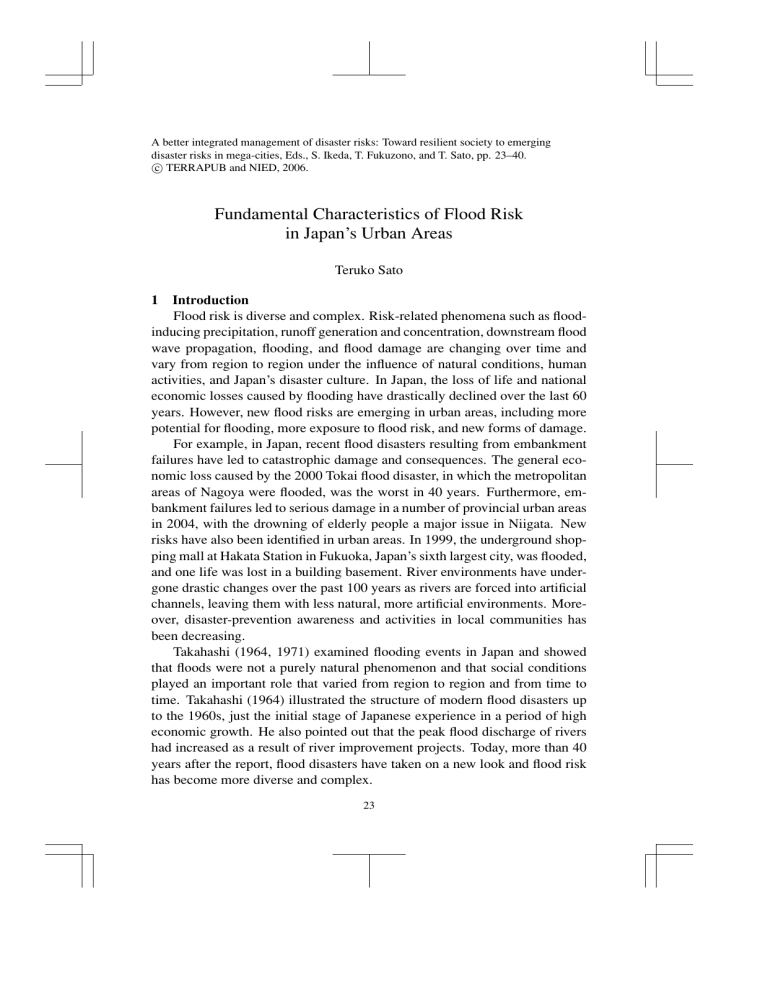 A better integrated management of disaster risks: Toward resilient society to emerging disaster risks in mega-cities, Eds., S. Ikeda, T. Fukuzono, and T. Sato, pp. 23–40. c TERRAPUB and NIED, 2006. Fundamental Characteristics of Flood Risk in Japan’s Urban Areas Teruko Sato 1 Introduction Flood risk is diverse and complex. Risk-related phenomena such as floodinducing precipitation, runoff generation and concentration, downstream flood wave propagation, flooding, and flood damage are changing over time and vary from region to region under the influence of natural conditions, human activities, and Japan’s disaster culture. In Japan, the loss of life and national economic losses caused by flooding have drastically declined over the last 60 years. However, new flood risks are emerging in urban areas, including more potential for flooding, more exposure to flood risk, and new forms of damage. For example, in Japan, recent flood disasters resulting from embankment failures have led to catastrophic damage and consequences. The general economic loss caused by the 2000 Tokai flood disaster, in which the metropolitan areas of Nagoya were flooded, was the worst in 40 years. Furthermore, embankment failures led to serious damage in a number of provincial urban areas in 2004, with the drowning of elderly people a major issue in Niigata. New risks have also been identified in urban areas. In 1999, the underground shopping mall at Hakata Station in Fukuoka, Japan’s sixth largest city, was flooded, and one life was lost in a building basement. River environments have undergone drastic changes over the past 100 years as rivers are forced into artificial channels, leaving them with less natural, more artificial environments. Moreover, disaster-prevention awareness and activities in local communities has been decreasing. Takahashi (1964, 1971) examined flooding events in Japan and showed that floods were not a purely natural phenomenon and that social conditions played an important role that varied from region to region and from time to time. Takahashi (1964) illustrated the structure of modern flood disasters up to the 1960s, just the initial stage of Japanese experience in a period of high economic growth. He also pointed out that the peak flood discharge of rivers had increased as a result of river improvement projects. Today, more than 40 years after the report, flood disasters have taken on a new look and flood risk has become more diverse and complex. 23 24 T. Sato Natural Dimension Landforms, geology, vegetation, climate, rainfall, river basin, etc. Hazard(Natural & Human dimensions) Precipitation Human Dimension Hazard Management Reduce the intensity and frequency of flood hazard. Manage spatial distribution of flood hazard Runoff generation Runoff concentration Flood wave propagation in Channel Social & economical systems and conditions, infrastructure, culture, human resources, land use' Resilience of the Society Embankment failure etc. Inundation to flood risk (by Resident, Local communities, and Governments) Exposure Management Exposure (population, assets, infrastructure, environmentalassets, eco system, etc.) Reduce vulnerability to flood risk Damage Management Emergency management before and after events Damage Reduce direct , indirect damages LPHC damage Deterioration of river environments, eco systems, Landscape, soil & water cycle etc. Fig. 1. Causal structure of flood risk. This paper describes the recent structural changes in flood risk characteristics for urban areas in Japan using the results of flood-disaster investigations into the 2000 Tokai urban flood disaster which occurred in one of the metropolitan areas in Japan and the 2004 Niigata flood disaster which occurred in provincial urban areas (Sato, 2002; Sato et al., 2006). The paper reviews existing knowledge in the fields of geography and river engineering and uses the causal structure of flood risk to describe the characteristics of flood risk. 2 Causal Structure of Flood Risk The causal structure of flood risk is shown in Fig. 1. Flood risk has four components: Hazard, Exposure, Damage, and Social Resilience to flood risk. All four components are subject to both natural and artificial environments that vary over time as social and economic conditions and human activities evolved. The components are defined as follows; 1) Hazard is an external natural force that has the potential to cause flood damage. Precipitation is the primary external factor. The scale and pat- Fundamental Characteristics of Flood Risk in Japan’s Urban Areas 25 tern of precipitation and its distribution in time and space in a basin are major factors that determine the magnitude and characteristics of the flood hazard. The flood hazard is transformed, as shown at the far right of Fig. 1, as precipitation runoff concentrates in river channels and flood waves propagate down the river channels. Ultimately, inundation occurs. Because these phenomena occur on or near the surface of the Earth, where human activities take place, flood hazards have local characteristics that are affected by geology, topography, vegetation, and land use in the river basin. 2) Exposure refers to the socio-cultural units that are exposed to flooding, such as populations, assets, environmental resources, biological resources, lifelines, social functions, etc. 3) Damage is the deterioration or loss of functionality of units exposed to flooding. This includes not only direct damage but also indirect damage to the social, economic, and natural environments. 4) Social Resilience to flood risks is the ability of society to withstand the hazard as a result of efforts in disaster risk management. 3 Characteristics of the Recent Flood Risk in Japan 3.1 Flood hazards One of the characteristics of flood risk in Japan is the significant qualitative and quantitative changes in the flood hazard resulting from human activities such as flood control measures, a trend that grows stronger du