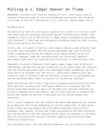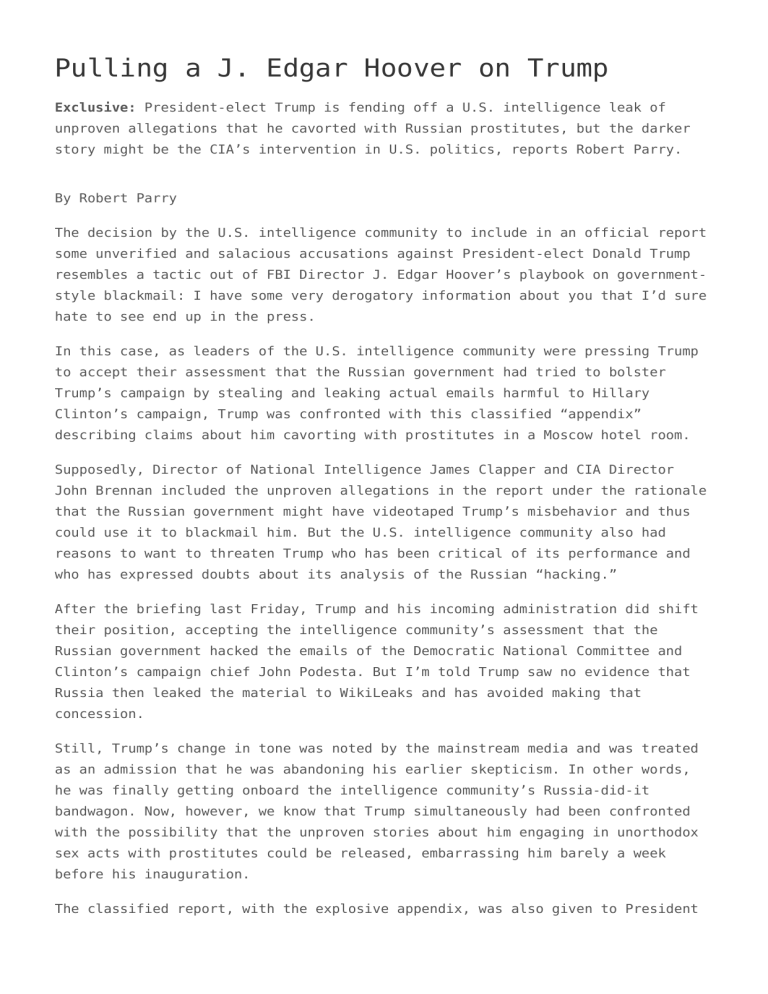 Pulling a J. Edgar Hoover on Trump Exclusive: President-elect Trump is fending off a U.S. intelligence leak of unproven allegations that he cavorted with Russian prostitutes, but the darker story might be the CIA’s intervention in U.S. politics, reports Robert Parry. By Robert Parry The decision by the U.S. intelligence community to include in an official report some unverified and salacious accusations against President-elect Donald Trump resembles a tactic out of FBI Director J. Edgar Hoover’s playbook on governmentstyle blackmail: I have some very derogatory information about you that I’d sure hate to see end up in the press. In this case, as leaders of the U.S. intelligence community were pressing Trump to accept their assessment that the Russian government had tried to bolster Trump’s campaign by stealing and leaking actual emails harmful to Hillary Clinton’s campaign, Trump was confronted with this classified “appendix” describing claims about him cavorting with prostitutes in a Moscow hotel room. Supposedly, Director of National Intelligence James Clapper and CIA Director John Brennan included the unproven allegations in the report under the rationale that the Russian government might have videotaped Trump’s misbehavior and thus could use it to blackmail him. But the U.S. intelligence community also had reasons to want to threaten Trump who has been critical of its performance and who has expressed doubts about its analysis of the Russian “hacking.” After the briefing last Friday, Trump and his incoming administration did shift their position, accepting the intelligence community’s assessment that the Russian government hacked the emails of the Democratic National Committee and Clinton’s campaign chief John Podesta. But I’m told Trump saw no evidence that Russia then leaked the material to WikiLeaks and has avoided making that concession. Still, Trump’s change in tone was noted by the mainstream media and was treated as an admission that he was abandoning his earlier skepticism. In other words, he was finally getting onboard the intelligence community’s Russia-did-it bandwagon. Now, however, we know that Trump simultaneously had been confronted with the possibility that the unproven stories about him engaging in unorthodox sex acts with prostitutes could be released, embarrassing him barely a week before his inauguration. The classified report, with the explosive appendix, was also given to President Obama and the so-called “Gang of Eight,” bipartisan senior members of Congress responsible for oversight of the intelligence community, which increased chances that the Trump accusations would be leaked to the press, which indeed did happen. Circulating Rumors The stories about Russian intelligence supposedly filming Trump in a high-end Moscow hotel with prostitutes have been circulating around Washington for months. I was briefed about them by a Hillary Clinton associate who was clearly hopeful that the accusations would be released before the election and thus further damage Trump’s chances. But the alleged video never seemed to surface and the claims had all the earmarks of a campaign dirty trick. However, now the tales of illicit frolic have been elevated to another level. They have been inserted into an official U.S. intelligence report, the details of which were leaked first to CNN and then to other mainstream U.S. news media outlets. Trump has denounced the story as “fake news” and it is certainly true that the juicy details – reportedly assembled by a former British MI-6 spy named Christopher Steele – have yet to check out. But the placement of the rumors in a U.S. government document gave the mainstream media an excuse to publicize the material. It’s also allowed the media to again trot out the Russian word “kompromat” as if the Russians invented the game of assembling derogatory information about someone and then using it to discredit or blackmail the person. In American history, legendary FBI Director J. Edgar Hoover was infamous for using his agency to develop negative information on a political figure and then letting the person know that the FBI had the dirt and certainly would not want it to become public – if only the person would do what the FBI wanted, whether that was to reappoint Hoover to another term or to boost the FBI’s budget or – in the infamous case of civil rights leader Martin Luther King – perhaps to commit suicide. However, in this case, it is not even known whether the Russians have any dirt on Trump. It could just be rumors concocted in the middle of a hard-fought campaign, first among Republicans battling Trump for the nomination (this opposition research was reportedly initiated by backers of Sen. Marco Rubio in the GOP race) before being picked up by Clinton supporters for use in the general election. Still, perhaps the more troubling issue is whether the U.S. intelligence community has entered a new phase of politicization in which its leadership feels that it has the responsibility to weed out “unfit” contenders for the presidency. During the general election campaign, a well-placed intelligence source told me that the intelligence community disdained both Clinton and Trump and hoped to discredit both of them with the hope that a more “acceptable” person could move into the White House for the next four years. Hurting Both Candidates Though I was skeptical of that information, it did turn out that FBI Director James Comey, one of the top officials in the intelligence community, badly damaged Clinton’s campaign by deeming her handling of her emails as Secretary of State “extremely careless” but deciding not to prosecute her – and then in the last week of the campaign briefly reopening and then re-closing the investigation. Then, after the election, President Obama’s CIA began leaking allegations that Russian President Vladimir Putin had orchestrated the hacking of Democrati