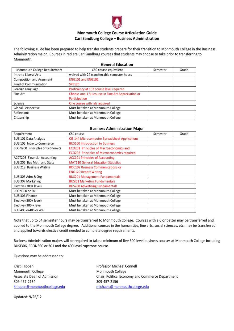 Monmouth College Course Articulation Guide Carl Sandburg College – Business Administration The following guide has been prepared to help transfer students prepare for their transition to Monmouth College in the Business Administration major. Courses in red are Carl Sandburg courses that students may choose to take prior to transferring to Monmouth. General Education Monmouth College Requirement Intro to Liberal Arts Composition and Argument Fund of Communication Foreign Language Fine Art Science Global Perspective Reflections Citizenship CSC course equivalent waived with 24 transferrable semester hours ENG101 and ENG102 SPE120 Proficiency at 102 course level required Choose one 3 SH course in Fine Art Appreciation or Participation One course with lab required Must be taken at Monmouth College Must be taken at Monmouth College Must be taken at Monmouth College Semester Grade Semester Grade Business Administration Major Requirement BUSI101 Data Analysis BUSI105 Intro to Commerce ECON200 Principles of Economics ACCT203 Financial Accounting BUSI205 Bus Math and Stats BUSI218 Business Writing BUSI305 Adm & Org BUSI307 Marketing Elective (300+ level) ECON300 or 301 BUSI306 Finance Elective (300+ level) Elective (300 + level BUSI405 or406 or 409 CSC course CIS 144 Microcomputer Spreadsheet Applications BUS100 Introduction to Business ECO201 Principles of Macroeconomics and ECO202 Principles of Microeconomics required ACC101 Principles of Accounting MAT110 General Education Statistics BOC102 Business Communications or ENG120 Report Writing BUS201 Management Fundamentals BUSI01 Marketing Fundamentals BUS200 Advertising Fundamentals Must be taken at Monmouth College Must be taken at Monmouth College Must be taken at Monmouth College Must be taken at Monmouth College Must be taken at Monmouth College Note that up to 64 semester hours may be transferred to Monmouth College. Courses with a C or better may be transferred and applied to the Monmouth College degree. Additional courses in the humanities, fine arts, social sciences, etc. may be transferred and applied towards elective credit needed to complete degree requirements. Business Administration majors will be required to take a minimum of five 300 level business courses at Monmouth College including BUSI306, ECON300 or 301 and the 400 level capstone course. Questions may be addressed to: Kristi Hippen Monmouth College Associate Dean of Admission 309-457-2134 [email protected] Updated: 9/26/12 Professor Michael Connell Monmouth College Chair, Political Economy and Commerce Department 309-457-2156 [email protected]