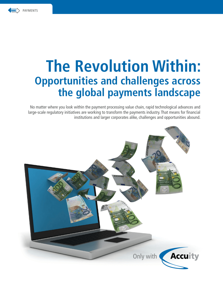 PAYMENTS The Revolution Within: Opportunities and challenges across the global payments landscape No matter where you look within the payment processing value chain, rapid technological advances and large-scale regulatory initiatives are working to transform the payments industry. That means for financial institutions and larger corporates alike, challenges and opportunities abound. Only with Few industries today are undergoing a more rapid and transformational change than the global payments industry. Once viewed as a staid yet fundamental component of most banks’ core mission, today payments are being looked at with a fresh eye by participants all along the value chain. And for good reason. Payments and other transaction services, such cash management, card issuing and credit financing, are critical to the economic health and customer relationships of most banks and many large corporates. In fact, payment transactions are the backbone of the world economy, accounting for 325 billion transactions worldwide.1 Yet, in some ways, this piece of the business has been neglected over the years, looked at primarily as little more than a way to ensure low but steady margins and necessary liquidity. Today, however, the game is changing. For one, the cost of payment processing can be considerable, with cash, the most common payment method, also the most expensive and least secure. At the same time, the global recession and technological advances have elevated payments processing to the top of priority lists for banks, corporates and entrepreneurs alike, all eager to find greater efficiencies, better ways of doing business and new markets to serve. Recent regulations and governmental initiatives, such as the Single Euro Payments Area (SEPA) and the Payments Service Directive (PSD) in Europe, and recent NACHA rule changes addressing mobile payments in the United States, are further rewriting the rules for payments. And consumer demand for newer, more convenient yet still secure payment mechanisms are driving visionaries and established players alike to develop new solutions. Together, these forces are working in concert to reshape the entire payments landscape across the globe. But for all the opportunity that awaits, challenges abound. With historically low margins and high costs, payments processing is a not market for the weak or faint-hearted. Throw in recessionary pressures, increased regulation, rapid advances in technology and new market participants, and it’s clear the competitive landscape has fundamentally changed. As a result, banks and corporates will have to commit considerable effort and resources on operations that were once taken for granted, and be at the top of their game to meet the challenge of rising innovation. At the same time, identifying a trusted partner with expertise in the payments arena can help navigate tomorrow’s landscape and be a key to managing the payment revolution. 1 1 Figure extrapolated from historical data. The Revolution Within: Opportunities and challenges across the global payments landscape | Accuity ©2010 Accuity, Inc. All rights reserved. Proprietary & Confidential The End of Cash? From Paper to Electrons In recent years, talk has heated up about the coming of a “cashless society,” one built on a range of mobile, electronic and alternate payment systems designed to do away with cash as a means of payment altogether. And it’s true that cash, as a basis for transactions, is under unprecedented pressure of late. The European Commission, for example, has calculated that the total costs of all payment methods, including cash, cheques and payment cards, to equal 2 to 3 per cent of a country’s GDP, with two-thirds of the total cost due to cash. Take e-money, for example. While mechanisms such as direct deposit and Electronic Funds Transfer (EFT) have been in operation for years, a new generation of providers is looking to upend the current system by bypassing banks and other intermediaries altogether. One of the largest and most noticeable of these is PayPal, the micropayment system best known as the payment mechanism of choice for online marketplace eBay. Similarly a pan-European study by McKinsey & Company estimates that society spends around €200 per person per year to cover the costs of cash, while the Dutch Central Bank calculates a figure of €300 per family, per year. Cash is also inherently insecure, vulnerable to counterfeiting and the lifeblood of underground economies of countries around the world. While predictions calling for the end of cash have been around for decades, however, they have yet to be proven correct. Instead, the market today is demanding a new paradigm be built alongside the current infrastructure that offers consumers, corporates and service providers a range of choices in convenience, security and cost beyond simple cash or credit cards. This new paradigm—or series of paradigms, each driven by a different technological platform and market segment—is fast moving and fragmented, and presents serious challenges to the way banks and larger corporates currently do business. In 2009, the company opened up its platform to developers, essentially offering anyone the opportunity to build an application that used PayPal as its payment provider. Within a few months, thousands of developers had created a host of new payment services, such as a Japanese software developer that added a “quick pay” button linked to Paypal on its application to help people comparison shop, and a call-center outsourcing firm that built an automated invoicing, time-tracking and payment system for its clients based on PayPal. Other examples of innovative e-money solutions are multiplying. Twitter co-founder Jack Dorsey is touting Square, a candy-sized device that lets anyone accept physical credit card payments through a smartphone without a credit card reader. Obopay, which has received funding from Nokia, allows phone owners to transfer 