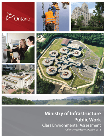 Ministry of Infrastructure Public Work Class Environmental Assessment 2012 Office Consolidation Pursuant to the Environmental Assessment Act: The Class Environmental Assessment process for Management Board Secretariat & Ontario Realty Corporation was approved by the Lieutenant Governor in Council, Orderin-Council No 913/2004 on April 28, 2004; Minor amendments to the Class Environmental Assessment process for Management Board Secretariat & Ontario Realty Corporation were approved by the Director, Environmental Assessment and Approvals Branch (Ministry of the Environment) on September 11, 2008; and Minor amendments to the Ministry of Energy and Infrastructure Class Environmental Assessment process for Realty Activities Other Than Electricity Projects were approved by the Director, Environmental Approvals Branch (Ministry of the Environment) on October 31, 2012. The above noted approvals can be found in Appendix 10 – Class EA Approvals EXECUTIVE SUMMARY INTRODUCTION The Environmental Assessment Act (EAA) provides for the "protection, conservation, and wise management" of the environment in Ontario. Part II.1 of the EAA sets out requirements for the approval of Class Environmental Assessments (Class EAs). An approved Class EA permits a group of projects (undertakings) in the defined class to proceed without the need for an assessment under Part II of the EAA, provided they proceed in accordance with the Class EA. This Ministry of Infrastructure Public Work Class EA (PW Class EA) sets out how the Ministry of Infrastructure (MOI) and the Ontario Infrastructure and Lands Corporation (IO) propose to meet EAA requirements. The Ontario Minister of the Environment (the Minister) has approved this Class EA pursuant to Section 9(1) of the EAA. MINISTRY OF INFRASTRUCTURE (THE PROPONENT) AND ITS AGENCY On August 18, 2010, the Ministry of Energy and Infrastructure was divided into two separate ministries, the Ministry of Infrastructure (MOI) and the Ministry of Energy. The Ministry of Infrastructure Act, 2011 (MOI Act) was proclaimed on June 6, 2011. On the same day, the Ontario Infrastructure and Lands Corporations Act, 2011 (OILC Act) was proclaimed merging the Ontario Realty Corporation, Infrastructure Ontario and the Stadium Corporation of Ontario into a single, new operational enterprise agency, the Ontario Infrastructure and Lands Corporation (IO). IO will continue to deliver realty and infrastructure services and projects, including negotiating and contracting with the private sector for a range of land, construction and property maintenance and realty transaction services. IO will continue the work of the prior three agencies that have been merged in accordance with the new governing legislation. Regulation 334 made pursuant to the Environmental Assessment Act (EAA) was amended to clarify the continued application of the EAA to the public work activities of MOI and IO while exempting other activities of IO. In this PW Class EA, “public work” has the meaning as set out in Section 1 of the MOI Act. The regulatory amendments simply clarify the status quo application of the EAA, providing that undertakings of MOI or its agency related to public work will continue to be subject to the EAA while other non-public work undertakings, which are currently not subject to the EAA, would continue to be exempt. This Class EA is focused only on realty activities and public work projects undertaken by MOI or its agency. The proponent for this Class EA is MOI. MOI or IO, expressly working on behalf of the Minister of MOI (MOI/IO) may carry out and be the proponent of an undertaking to which the Class EA applies. Should another agency be given responsibility by the Minister of Infrastructure for undertaking or carrying out public work projects for MOI, then this Class EA would apply to that agency as a proponent. ENVIRONMENTAL ASSESSMENT LEVELS OR CATEGORIES MOI has a diverse range of responsibilities and undertakings. Not all undertakings require the same level of environmental assessment (EA). To accommodate the entire range of undertakings, this PW Class EA Ministry of Infrastructure Public Work Class EA Executive Summary Page i defines four different levels or "categories" of EA, as follows: • Category A is applied to undertakings that are minor in scale and have minimal or no adverse environmental effects and requires no EA of the undertaking. • Category B (Consultation and Documentation Report) is a screening process applied to undertakings that have some potential for adverse environmental effects. These effects are well understood from a technical perspective, are minor in nature, and mitigation is also well understood. • Category C (Environmental Study Report) is a comprehensive EA process that is applied to undertakings that have the potential for significant environmental effects and must proceed under the full planning and documentation procedures. The environmental effects are assessed and mitigation, monitoring and public consultation are documented in a detailed Environmental Study Report (ESR). • Category D (Individual EA) is applied to those undertakings that have the potential for significant and undetermined environmental effects. Although the Class EA is used to identify the need for an Individual EA, the process for carrying out an Individual EA is beyond the scope of this document. A detailed description of each category, including the methodology to be followed, is provided in Sections 3.0 to 6.0. THE CLASS EA METHODOLOGY Each of the undertakings described in this PW Class EA document is supported by procedures, which allow MOI/IO to comply with the requirements of the EAA. Although there are several EA Categories, each with its own methodology, the first four steps of the PW Class EA methodology are common to all EA Category methodologies, and are referred to as the EA Category Selection Process. Further details are provided in Section 2.0. The section also provides two key c
