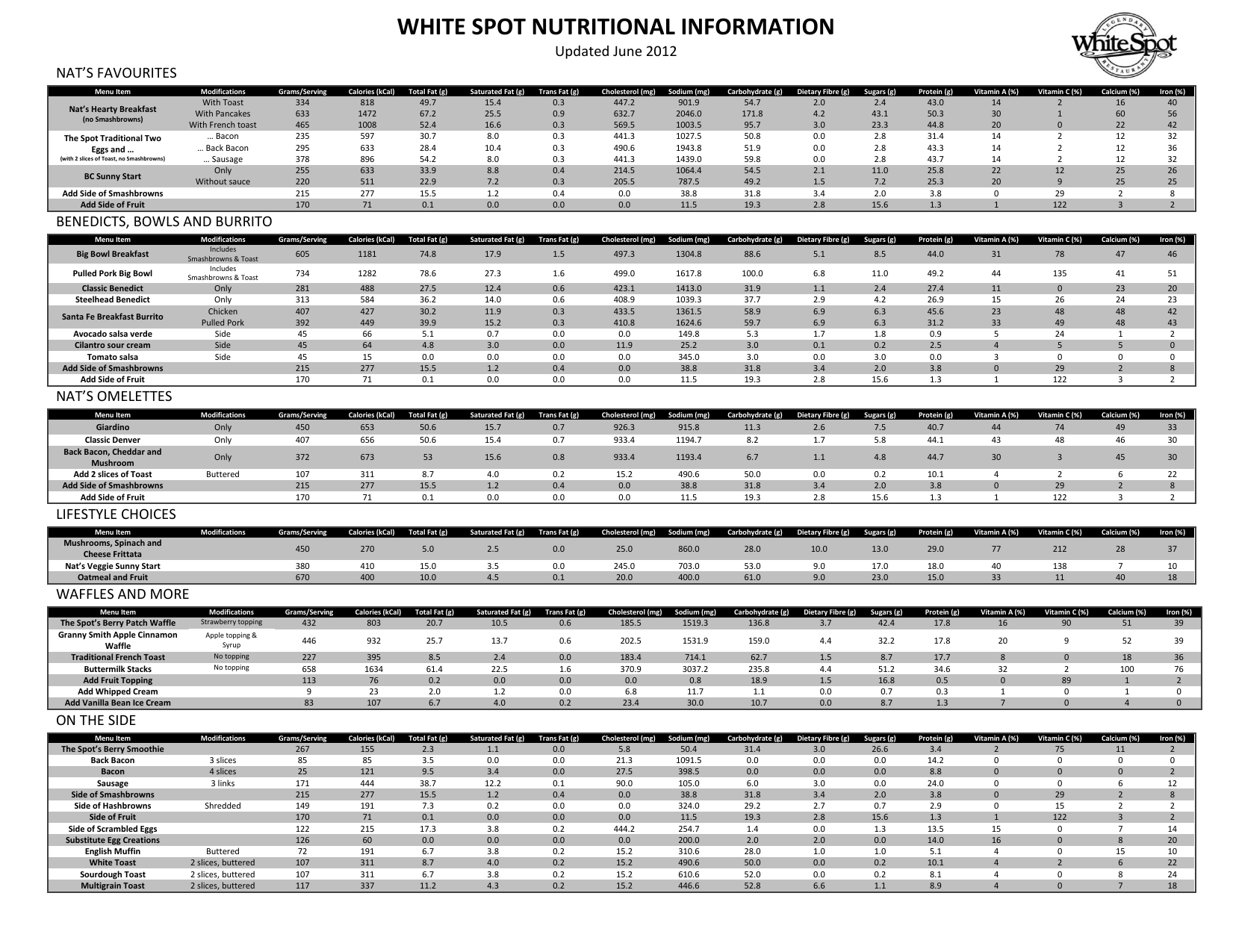 WHITE SPOT NUTRITIONAL INFORMATION Updated June 2012 NAT’S FAVOURITES Menu Item Nat’s Hearty Breakfast (no Smashbrowns) The Spot Traditional Two Eggs and … (with 2 slices of Toast, no Smashbrowns) BC Sunny Start Modifications Grams/Serving With Toast With Pancakes With French toast … Bacon … Back Bacon … Sausage Only Without sauce 334 633 465 235 295 378 255 220 215 170 Add Side of Smashbrowns Add Side of Fruit Calories (kCal) 818 1472 1008 597 633 896 633 511 277 71 Total Fat (g) 49.7 67.2 52.4 30.7 28.4 54.2 33.9 22.9 15.5 0.1 Saturated Fat (g) 15.4 25.5 16.6 8.0 10.4 8.0 8.8 7.2 1.2 0.0 Trans Fat (g) 0.3 0.9 0.3 0.3 0.3 0.3 0.4 0.3 0.4 0.0 Cholesterol (mg) 447.2 632.7 569.5 441.3 490.6 441.3 214.5 205.5 0.0 0.0 Sodium (mg) 901.9 2046.0 1003.5 1027.5 1943.8 1439.0 1064.4 787.5 38.8 11.5 Carbohydrate (g) 54.7 171.8 95.7 50.8 51.9 59.8 54.5 49.2 31.8 19.3 Dietary Fibre (g) 2.0 4.2 3.0 0.0 0.0 0.0 2.1 1.5 3.4 2.8 Sugars (g) Protein (g) Vitamin A (%) Vitamin C (%) Calcium (%) Iron (%) 2.4 43.1 23.3 2.8 2.8 2.8 11.0 7.2 2.0 15.6 43.0 50.3 44.8 31.4 43.3 43.7 25.8 25.3 3.8 1.3 14 30 20 14 14 14 22 20 0 1 2 1 0 2 2 2 12 9 29 122 16 60 22 12 12 12 25 25 2 3 40 56 42 32 36 32 26 25 8 2 BENEDICTS, BOWLS AND BURRITO Menu Item Sugars (g) Protein (g) Vitamin A (%) Vitamin C (%) Calcium (%) Iron (%) 605 1181 74.8 17.9 1.5 497.3 1304.8 88.6 5.1 8.5 44.0 31 78 47 46 734 1282 78.6 27.3 1.6 499.0 1617.8 100.0 6.8 11.0 49.2 44 135 41 51 Only Only Chicken Pulled Pork Side Side Side 281 313 407 392 45 45 45 215 170 488 584 427 449 66 64 15 277 71 27.5 36.2 30.2 39.9 5.1 4.8 0.0 15.5 0.1 12.4 14.0 11.9 15.2 0.7 3.0 0.0 1.2 0.0 0.6 0.6 0.3 0.3 0.0 0.0 0.0 0.4 0.0 423.1 408.9 433.5 410.8 0.0 11.9 0.0 0.0 0.0 1413.0 1039.3 1361.5 1624.6 149.8 25.2 345.0 38.8 11.5 31.9 37.7 58.9 59.7 5.3 3.0 3.0 31.8 19.3 1.1 2.9 6.9 6.9 1.7 0.1 0.0 3.4 2.8 2.4 4.2 6.3 6.3 1.8 0.2 3.0 2.0 15.6 27.4 26.9 45.6 31.2 0.9 2.5 0.0 3.8 1.3 11 15 23 33 5 4 3 0 1 0 26 48 49 24 5 0 29 122 23 24 48 48 1 5 0 2 3 20 23 42 43 2 0 0 8 2 Menu Item Modifications Grams/Serving Giardino Classic Denver Back Bacon, Cheddar and Mushroom Add 2 slices of Toast Add Side of Smashbrowns Add Side of Fruit Only Only 450 407 653 656 Big Bowl Breakfast Pulled Pork Big Bowl Modifications Includes Smashbrowns & Toast Includes Smashbrowns & Toast Grams/Serving Classic Benedict Steelhead Benedict Santa Fe Breakfast Burrito Avocado salsa verde Cilantro sour cream Tomato salsa Add Side of Smashbrowns Add Side of Fruit Calories (kCal) Total Fat (g) Saturated Fat (g) Trans Fat (g) Cholesterol (mg) Sodium (mg) Carbohydrate (g) Dietary Fibre (g) NAT’S OMELETTES Calories (kCal) Total Fat (g) Saturated Fat (g) Trans Fat (g) Cholesterol (mg) Sodium (mg) 50.6 50.6 15.7 15.4 0.7 0.7 926.3 933.4 915.8 1194.7 Carbohydrate (g) Sugars (g) Protein (g) Vitamin A (%) Vitamin C (%) Calcium (%) Iron (%) 11.3 8.2 Dietary Fibre (g) 2.6 1.7 7.5 5.8 40.7 44.1 44 43 74 48 49 46 33 30 Only 372 673 53 15.6 0.8 933.4 1193.4 6.7 1.1 4.8 44.7 30 3 45 30 Buttered 107 215 170 311 277 71 8.7 15.5 0.1 4.0 1.2 0.0 0.2 0.4 0.0 15.2 0.0 0.0 490.6 38.8 11.5 50.0 31.8 19.3 0.0 3.4 2.8 0.2 2.0 15.6 10.1 3.8 1.3 4 0 1 2 29 122 6 2 3 22 8 2 Modifications Grams/Serving LIFESTYLE CHOICES Menu Item Mushrooms, Spinach and Cheese Frittata Nat’s Veggie Sunny Start Oatmeal and Fruit Sugars (g) Protein (g) Vitamin A (%) Vitamin C (%) Calcium (%) Iron (%) 450 Calories (kCal) 270 Total Fat (g) 5.0 Saturated Fat (g) 2.5 Trans Fat (g) 0.0 Cholesterol (mg) 25.0 Sodium (mg) 860.0 Carbohydrate (g) 28.0 Dietary Fibre (g) 10.0 13.0 29.0 77 212 28 37 380 670 410 400 15.0 10.0 3.5 4.5 0.0 0.1 245.0 20.0 703.0 400.0 53.0 61.0 9.0 9.0 17.0 23.0 18.0 15.0 40 33 138 11 7 40 10 18 WAFFLES AND MORE Menu Item The Spot’s Berry Patch Waffle Granny Smith Apple Cinnamon Waffle Traditional French Toast Buttermilk Stacks Add Fruit Topping Add Whipped Cream Add Vanilla Bean Ice Cream Modifications Strawberry topping Apple topping & Syrup No topping No topping Grams/Serving Sugars (g) Protein (g) Vitamin A (%) Vitamin C (%) Calcium (%) Iron (%) 432 Calories (kCal) 803 Total Fat (g) 20.7 Saturated Fat (g) 10.5 Trans Fat (g) 0.6 Cholesterol (mg) 185.5 Sodium (mg) 1519.3 Carbohydrate (g) 136.8 Dietary Fibre (g) 3.7 42.4 17.8 16 90 51 39 446 932 25.7 13.7 0.6 202.5 1531.9 159.0 4.4 32.2 17.8 20 9 52 39 227 658 113 9 83 395 1634 76 23 107 8.5 61.4 0.2 2.0 6.7 2.4 22.5 0.0 1.2 4.0 0.0 1.6 0.0 0.0 0.2 183.4 370.9 0.0 6.8 23.4 714.1 3037.2 0.8 11.7 30.0 62.7 235.8 18.9 1.1 10.7 1.5 4.4 1.5 0.0 0.0 8.7 51.2 16.8 0.7 8.7 17.7 34.6 0.5 0.3 1.3 8 32 0 1 7 0 2 89 0 0 18 100 1 1 4 36 76 2 0 0 ON THE SIDE Menu Item The Spot’s Berry Smoothie Back Bacon Bacon Sausage Side of Smashbrowns Side of Hashbrowns Side of Fruit Side of Scrambled Eggs Substitute Egg Creations English Muffin White Toast Sourdough Toast Multigrain Toast Modifications 3 slices 4 slices 3 links Shredded Buttered 2 slices, buttered 2 slices, buttered 2 slices, buttered Grams/Serving 267 85 25 171 215 149 170 122 126 72 107 107 117 Calories (kCal) 155 85 121 444 277 191 71 215 60 191 311 311 337 Total Fat (g) 2.3 3.5 9.5 38.7 15.5 7.3 0.1 17.3 0.0 6.7 8.7 6.7 11.2 Saturated Fat (g) 1.1 0.0 3.4 12.2 1.2 0.2 0.0 3.8 0.0 3.8 4.0 3.8 4.3 Trans Fat (g) 0.0 0.0 0.0 0.1 0.4 0.0 0.0 0.2 0.0 0.2 0.2 0.2 0.2 Cholesterol (mg) 5.8 21.3 27.5 90.0 0.0 0.0 0.0 444.2 0.0 15.2 15.2 15.2 15.2 Sodium (mg) 50.4 1091.5 398.5 105.0 38.8 324.0 11.5 254.7 200.0 310.6 490.6 610.6 446.6 Carbohydrate (g) 31.4 0.0 0.0 6.0 31.8 29.2 19.3 1.4 2.0 28.0 50.0 52.0 52.8 Dietary Fibre (g) 3.0 0.0 0.0 3.0 3.4 2.7 2.8 0.0 2.0 1.0 0.0 0.0 6.6 Sugars (g) Protein (g) Vitamin A (%) Vitamin C (%) Calcium (%) Iron (%) 26.6 0.0 0.0 0.0 2.0 0.7 15.6 1.3 0.0 1.0 0.2 0.2 1.1 3.4 14.2 8.8 24.0 3.8 2.9 1.3 13.5 14.0 5.1 10.1 8.1 8.9 2 0 0 0 0 0 1 15 16 4 4 4 4 75 0 0 0 29 15 122 0 0 0 2 0 0 11 0 0 6 2 2 3 7 8 15 6 8 7 2 0 2 12 8 2 2 14 20 10 22 24 18 WHITE SPOT NUTRITIONAL INFORMATION Updated June 2012 STARTERS Me