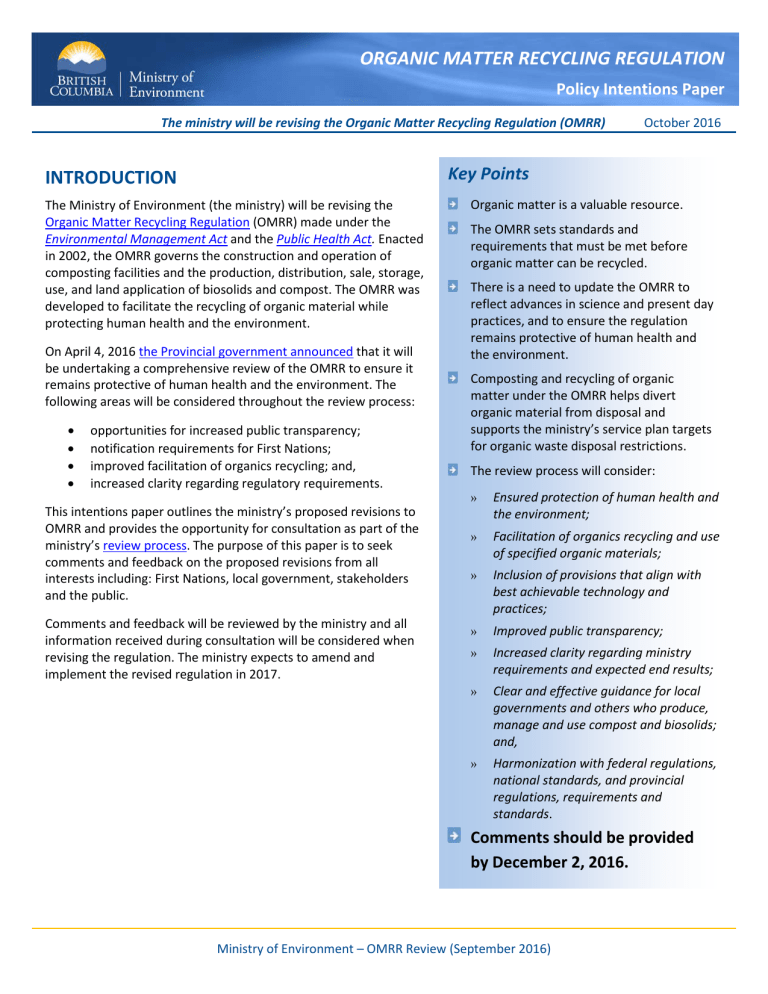 ORGANIC MATTER RECYCLING REGULATION Policy Intentions Paper The ministry will be revising the Organic Matter Recycling Regulation (OMRR) Key Points INTRODUCTION The Ministry of Environment (the ministry) will be revising the Organic Matter Recycling Regulation (OMRR) made under the Environmental Management Act and the Public Health Act. Enacted in 2002, the OMRR governs the construction and operation of composting facilities and the production, distribution, sale, storage, use, and land application of biosolids and compost. The OMRR was developed to facilitate the recycling of organic material while protecting human health and the environment. On April 4, 2016 the Provincial government announced that it will be undertaking a comprehensive review of the OMRR to ensure it remains protective of human health and the environment. The following areas will be considered throughout the review process: • • • • October 2016 opportunities for increased public transparency; notification requirements for First Nations; improved facilitation of organics recycling; and, increased clarity regarding regulatory requirements. This intentions paper outlines the ministry’s proposed revisions to OMRR and provides the opportunity for consultation as part of the ministry’s review process. The purpose of this paper is to seek comments and feedback on the proposed revisions from all interests including: First Nations, local government, stakeholders and the public. Comments and feedback will be reviewed by the ministry and all information received during consultation will be considered when revising the regulation. The ministry expects to amend and implement the revised regulation in 2017. Organic matter is a valuable resource. The OMRR sets standards and requirements that must be met before organic matter can be recycled. There is a need to update the OMRR to reflect advances in science and present day practices, and to ensure the regulation remains protective of human health and the environment. Composting and recycling of organic matter under the OMRR helps divert organic material from disposal and supports the ministry’s service plan targets for organic waste disposal restrictions. The review process will consider: » Ensured protection of human health and the environment; » Facilitation of organics recycling and use of specified organic materials; » Inclusion of provisions that align with best achievable technology and practices; » Improved public transparency; » Increased clarity regarding ministry requirements and expected end results; » Clear and effective guidance for local governments and others who produce, manage and use compost and biosolids; and, » Harmonization with federal regulations, national standards, and provincial regulations, requirements and standards. Comments should be provided by December 2, 2016. Ministry of Environment – OMRR Review (September 2016) Page | 2 Organic Matter Recycling Regulation (OMRR) – Policy Intentions Paper Contents of this Intentions Paper INTRODUCTION BACKGROUND INFORMATION Management and Recycling of Organic Matter Ministry Service Plan Targets Waste and Climate Action in British Columbia 2006 AND 2011 INTENTIONS PAPERS PROPOSED OMRR REVISIONS 1. Organic Matter Suitable for Composting 1.1. Clean wood from any source 1.2. Domestic composting toilet sludge 1.3. Paper and cardboard 1.4. Compostable plastic 2. Composting Facilities 2.1. Best practices 2.2. Plans, reports and other requirements 3. Land Application and Distribution of Managed Organic Matter 3.1. Addition of new standards 3.2. Land application 3.3. Mine site reclamations and landfill closures 4. Notification under OMRR 4.1. Notification requirements 4.1.1. Composting facilities 4.1.2. Land application 4.2. Notification of First Nations 5. Sampling, Monitoring and Record Keeping 5.1. Sampling and monitoring requirements 5.2. Record keeping requirements 6. Updates to Technical Standards 6.1. Consistency of schedules with other national standards and regulations 6.2. Consistency with the Contaminated Sites Regulation 6.3. Consistency with the Agricultural Waste Control Regulation 7. Additional Housekeeping Changes DEVELOPMENT OF GUIDANCE ASSURING COMPLIANCE IMPLEMENTATION PROVIDING FEEDBACK Ministry of Environment – OMRR Review (September 2016) Page | 3 Organic Matter Recycling Regulation (OMRR) – Policy Intentions Paper BACKGROUND INFORMATION • Management and Recycling of Organic Matter Organic matter can originate from plants, animals or humans, as well as from residential, commercial, institutional, or industrial sources. Examples of organic matter include: food scraps, grass clippings, and animal and human waste. A feature of organic matter is that it is biodegradable. Organic matter can be recycled to create products for beneficial uses. The OMRR was designed to enable organic matter to be recycled while protecting human health and the environment. Ministry Service Plan Targets Amendments to the OMRR foster organic waste recycling and support the ministry’s service plan. The current service plan targets include performance measures for organic waste disposal restrictions and best achievable technology practices. These targets are summarized below: • Organic waste represents up to 40% of all waste currently sent for disposal. The ministry continues to work toward the long-term target of 75% of BC’s population being covered by organic waste disposal restrictions by 2020. Restrictions to organic disposal will divert more organic waste to alternative management options, including activities under the provisions of the OMRR. • The ministry routinely reviews its policies, regulations, fees and fines to ensure they include best available information, and best achievable technology and practices. The ministry leads these efforts by incorporating world-leading approaches and best achievable technologies into environmental guidelines, policies and regulations; and, by engagi