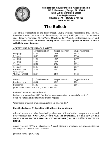 Hillsborough County Medical Association, Inc. 606 S. Boulevard, Tampa, FL 33606 Elke Lubin, Managing Editor [email protected] 813/253-0471 ~ 813/253-3737 fax www.HCMA.net The Bulletin The official publication of the Hillsborough County Medical Association, Inc. (HCMA). Published 6 times per year – circulation is approximately 1,450 per issue. The six issues are: January/February, March/April, May/June, July/August, September/October, and November/December. First time display advertisers are required to submit a check with their advertisement. ADVERTISING RATES: BLACK & WHITE 1x/per insertion Full page $495 2/3 page $398 1/2 page $336 1/3 page $267 1/4 page $237 1/6 page $193 Business Card $105 3x/per insertion $469 $372 $319 $246 $216 $186 $95 6x/per insertion $442 $336 $300 $221 $194 $167 $85 *Full pg INSERT $495 $440 horizontal only $550 Covers: 1x/per insertion 3x/per insertion Inside covers $601 $567 Back cover $638 $601 (Back cover dimensions = 7 1/2” w x 7 5/8” h) 6x/per insertion $531 $584 Preferred location: 10% additional Full cover sponsorship: $825 (ask Bulletin representative for more information) Color Ad Rates and Inserts: Quoted upon request *inserts are provided by customer; rate is for color or B&W Classified ad rate: $10 per line with a three-line minimum Ads and inserts are to be furnished by advertiser. All production charges are extra and non-commissioned. COPY AND LAYOUT MUST BE SUBMITTED BY THE 25TH OF THE MONTH PRIOR TO THE LEAD PUBLICATION MONTH (EX: APRIL 25TH FOR MAY/JUNE ISSUE). Above rates are NET to all advertisers. No cash discounts are given. Agency commissions are not provided for in the above rates. (Bulletin Rates – July 2011)