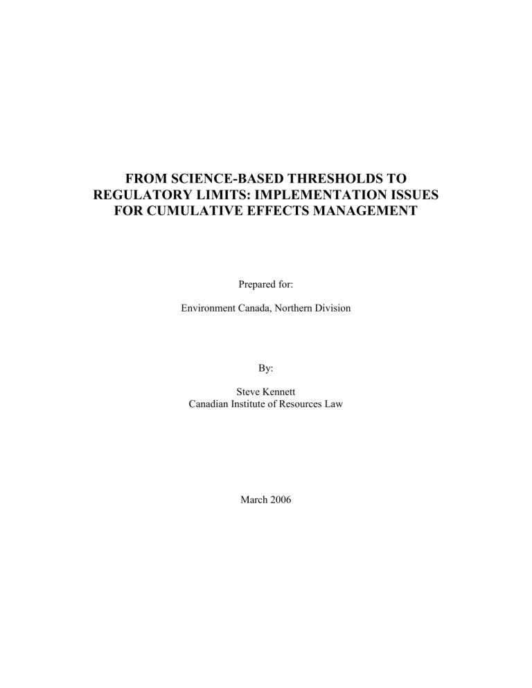 FROM SCIENCE-BASED THRESHOLDS TO REGULATORY LIMITS: IMPLEMENTATION ISSUES FOR CUMULATIVE EFFECTS MANAGEMENT Prepared for: Environment Canada, Northern Division By: Steve Kennett Canadian Institute of Resources Law March 2006 Table of Contents 1 Introduction................................................................................................................ 1 2 The Implementation Challenge.................................................................................. 1 3 Limits in Principle...................................................................................................... 5 3.1 Distinguishing thresholds from limits............................................................... 6 3.2 Acceptance of the need for limits ..................................................................... 6 3.3 Limits and trade-offs......................................................................................... 7 3.4 Collective versus individual limits.................................................................... 9 3.5 Rationing ‘free’ goods ...................................................................................... 9 3.6 Implementation through a cumulative effects framework ................................ 9 4 Establishing Limits through Planning...................................................................... 11 4.1 The role of planning in cumulative effects management................................ 11 4.2 Science and social choice................................................................................ 12 4.3 The planning process – an analogy with the parents’ dilemma ...................... 13 4.4 Intensity limits and trade-offs in planning ...................................................... 15 4.5 Planning as a component of integrated resource management ....................... 16 5 Implementing Limits in Practice.............................................................................. 16 5.1 Aggregation and integration of individual decisions ...................................... 16 5.2 Trade-offs in practice...................................................................................... 17 5.3 Permanent or long-lasting impact sources ...................................................... 18 5.4 Regulatory responses to allocation issues....................................................... 19 5.5 Cap-and-trade allowance systems................................................................... 20 6 Conclusion ............................................................................................................... 21 7 References................................................................................................................ 22 1 Introduction Implementation has received remarkably little attention in the published papers and consultants’ reports dealing with the use of thresholds to assess and manage cumulative environmental effects. Without effective implementation, however, the best science in the world will not change the way we manage human uses of land and resources. This paper focuses on implementation. The analysis builds on the excellent overview of the theory and practice of thresholds provided by Terry Antoniuk’s background paper.1 Terry shows that considerable work has already been accomplished in the NWT and elsewhere on the identification of indicators and thresholds for cumulative effects management. He also highlights some of the decision-making processes that are available for putting threshold-based approaches into practice. The record of success in moving from theory to practice is not, however, particularly impressive. An important theme running through several of the examples discussed in Terry’s paper is that initiatives to develop and apply thresholds – particularly land-use thresholds – have tended to encounter obstacles at the implementation stage. The objective here is to identify some of the key issues that should be confronted directly in order to implement a threshold-based approach to cumulative effects management. This way of framing the objective is important, because the challenge is not simply to implement thresholds once they have been identified. In fact, ‘thresholds’ as that term is often used cannot be implemented because they take the form of information, not decisions. Decision-makers use information, but they implement decisions. Bridging the gap between the generation of information about thresholds and the making and implementing of decisions regarding land and resource use requires a shift in both terminology and analysis. In particular, this paper suggests that implementation requires a serious analysis of limits, trade-offs, and specific decision-making processes. The following discussion focuses primarily on issues and options in these three areas. The starting point is a summary of Terry’s brief but significant comments about obstacles to implementing thresholds. The paper then focuses on challenges and opportunities for incorporating information about thresholds into actual decisions regarding the use of land and resources. This discussion is divided into three sections: (1) the acceptance of limits in principle; (2) the establishment of limits through planning; and (3) the implementation of limits in practice. 2 The Implementation Challenge Terry’s paper and extensive reference list show that the development of thresholds for environmental management has received considerable attention in recent years, especially in northern Canada. In particular, much effort has been and continues to be devoted to the science of thresholds – the identification of indicators and doseresponse relationships in order to understand relationships between levels of human activity and environmental change. As Terry shows, many of the tools and decision1 Salmo Consulting Inc. February 2006. “Developing and Implementing Thresholds in the Northwes