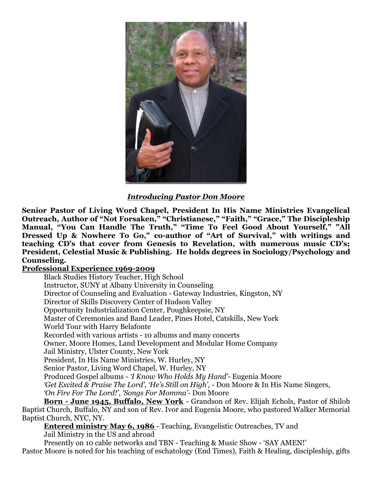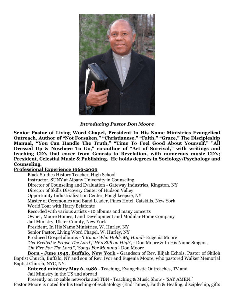 Introducing Pastor Don Moore Senior Pastor of Living Word Chapel, President In His Name Ministries Evangelical Outreach, Author of “Not Forsaken,” “Christianese,” “Faith,” “Grace,” The Discipleship Manual, “You Can Handle The Truth,” “Time To Feel Good About Yourself,” "All Dressed Up & Nowhere To Go," co-author of “Art of Survival,” with writings and teaching CD’s that cover from Genesis to Revelation, with numerous music CD’s; President, Celestial Music & Publishing. He holds degrees in Sociology/Psychology and Counseling. Professional Experience 1969-2009 Black Studies History Teacher, High School Instructor, SUNY at Albany University in Counseling Director of Counseling and Evaluation - Gateway Industries, Kingston, NY Director of Skills Discovery Center of Hudson Valley Opportunity Industrialization Center, Poughkeepsie, NY Master of Ceremonies and Band Leader, Pines Hotel, Catskills, New York World Tour with Harry Belafonte Recorded with various artists - 10 albums and many concerts Owner, Moore Homes, Land Development and Modular Home Company Jail Ministry, Ulster County, New York President, In His Name Ministries, W. Hurley, NY Senior Pastor, Living Word Chapel, W. Hurley, NY Produced Gospel albums - ‘I Know Who Holds My Hand’- Eugenia Moore ‘Get Excited & Praise The Lord’, ‘He’s Still on High’, - Don Moore & In His Name Singers, ‘On Fire For The Lord!’, ‘Songs For Momma’- Don Moore Born - June 1945, Buffalo, New York - Grandson of Rev. Elijah Echols, Pastor of Shiloh Baptist Church, Buffalo, NY and son of Rev. Ivor and Eugenia Moore, who pastored Walker Memorial Baptist Church, NYC, NY. Entered ministry May 6, 1986 - Teaching, Evangelistic Outreaches, TV and Jail Ministry in the US and abroad Presently on 10 cable networks and TBN - Teaching & Music Show - ‘SAY AMEN!’ Pastor Moore is noted for his teaching of eschatology (End Times), Faith & Healing, discipleship, gifts of the Spirit and worship. Pastor Moore’s national and international ministry provides training and support for churches and orphanages in India, Russia, Ghana, Uganda and Haiti, Florida, Cohoes, NY. His anointing has taken him to Europe, Russia, Africa, India and the Caribbean, preaching and teaching pastors and laymen as well. Member of International Council of Community Churches, Evangelical Association of the Hudson Valley, Network of Local Churches, Ulster County Religious Council, NAACP Educated - Gary, Indiana and Bronx, New York Bachelor’s Degree - Bowling Green State University Master’s Degree - Bowling Green State University Degrees in Sociology, Counseling Obviously I have been blessed with many gifts and talents, to the glory of God. Respectfully submitted, Don Moore Living Word Chapel - 1555 Route 28A - W. Hurley, NY 12491 845 - 338 - 9305 - fax 845 - 684 - 7045 www.pastordonmoore.org [email protected] www.thelivingwordchapel.com