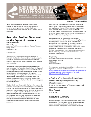 Issue no. 7, November 2016 This is the sixth edition of the NTPS Professionals Newsletter. We hope to receive contributions from members working within the NTPS in the future. To contribute articles or letters to this Newsletter, please see below. White Paper on Developing Australian Position Statement on the Export of Livestock Only exporters licensed by the Australian Government Department of Agriculture Fisheries and Forestry (DAFF) can legally export livestock from Australia. Exporters are accountable to the Australian Government for the outcomes of each consignment. AQIS must be satisfied that importing country requirements are met before issuing a health certificate and export permit. 1 Introduction Livestock sourced for export must also meet all requirements under relevant state and territory legislation, including animal welfare Acts. State and territory governments are responsible for ensuring that these requirements are met. Areas of state and territory responsibilities include animal health and welfare, vehicle registration and operation, licensing and operation of facilities and equipment where appropriate, occupational health and safety, and environmental protection and operation of companies. The Australian Position Statement on the Export of Livestock (the Position Statement) has been developed as part of the Australian Government’s response to the Livestock Export Review (Keniry Review1) of the livestock export industry. Prepared by: Australian Government Department of Agriculture, Fisheries and Forestry GPO Box 858 Canberra ACT 2601 The Position Statement provides a framework for the development of the Australian Standards for the Export of Livestock2 (the Standards). Development of the Standards followed guiding principles and defined outcomes for the livestock export industry, as agreed through the consultative process employed to finalise the Standards. The Standards represent the basic animal health and welfare requirements for the conduct of the livestock export industry, which the Australian Government expects the industry to meet. The statement can be downloaded from the Department of Agriculture, Fisheries and Forestry at: http://www.agriculture.gov.au/SiteCollectionDocuments/a nimal-plant/animal-welfare/standards/version23/australian-standards-v2.3.pdf Date of publication: April 2011 Australian Position Statement for the Export of Livestock first published November 2006 The Standards are referenced in the Australian Meat and Livestock Industry (Export Licensing) Regulations 1998 and the Export Control (Animals) Order 2004, which came into effect on 1 December 2004. These Australian Government laws cover only the exporter, Australian Quarantine and Inspection Service (AQIS)-accredited veterinarians, the registration of premises, and processes relating to the livestock export trade. The Standards are relevant throughout the livestock export chain and should be reflected in relevant industry quality assurance (QA) programs. A Review of the Potential Occupational Health and Safety Implications of Nanotechnology for the Department of Employment and Workplace Relations Final Report July 2006 Executive Summary Nanotechnologies and nanoparticles occur at the level of 0.000000001 metres and it is difficult to fully appreciate these remarkably small scales. The distinctive and oftentimes unique properties which are observed with nanoparticles have been proposed to revolutionise manufacturing and consuming in the future - much as the industrial revolution did in the late 18th and early 19th centuries. Only the future will confirm if these expectations will be realised. In the intervening period, however, there will be large increases in the production, distribution and handling of nanoparticles. Various health and materials science specialists have expressed concern that the unique properties which have made nanoparticles attractive to industry may also have untoward effects on human and environmental health. The calls for proactive steps to be taken to characterise any hazardous properties of nanoparticles have come from both industry and the public arena. These calls for action have been evident not only from overseas but also from within Australia. Nanoparticles - with names such as fullerenes (“buckyballs”), nanotubes and quantum dots - will contribute to such diverse areas of manufacture as electronics, aerospace and transport engineering, textiles, food and beverage, energy and the environment. At this early stage the potential applications of nanoparticles seem to be limited only by the imagination. Although difficult to predict the long term commercial potential for carbon nanotubes, quantum dots and their derivatives appear to be the most promising. As a result preferential emphasis should be given to assessing the health and environmental effects of these types of nanoparticles. The occupational health and safety effects of engineered nanoscale particles are mostly unknown. This can be attributed to the relatively recent development of the nanotechnology sector and, as a result, the lack of available information on human exposures and working conditions. As a consequence our abilities to accurately predict the impact of nanoparticle exposures on worker health are limited at this time. In particular our abilities to measure nanoparticles in the workplace (or more generally) are limited by current technologies. Nanotechnology presents us with new challenges as the properties of nanoparticles now depend on size and shape as much as the more conventional factors of chemical structure and composition. The measurement of these additional attributes will be necessary to accurately assess nanoparticle concentrations in the workplace. In addition, the capability of the human body to recognise and appropriately respond to these tiny entities is essentially unknown at the moment. Findings from animal and in vitro test systems have provided some valuable information an