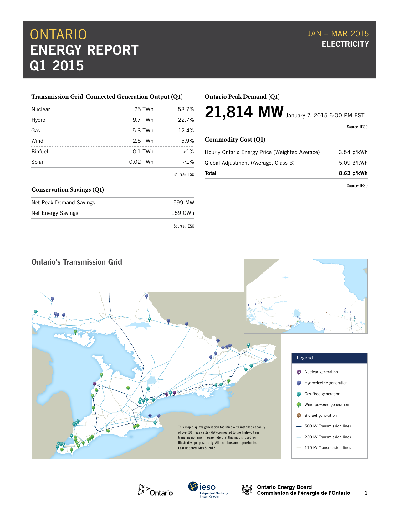 ONTARIO ENERGY REPORT Q1 2015 JAN – MAR 2015 ELECTRICITY Transmission Grid-Connected Generation Output (Q1) Ontario Peak Demand (Q1) Nuclear 25 TWh 58.7% Hydro 9.7 TWh 22.7% 21,814 MW Gas 5.3 TWh 12.4% Wind 2.5 TWh 5.9% Biofuel 0.1 TWh <1% Hourly Ontario Energy Price (Weighted Average) 3.54 ¢/kWh 0.02 TWh <1% Global Adjustment (Average, Class B) 5.09 ¢/kWh Total 8.63 ¢/kWh Solar Source: IESO January 7, 2015 6:00 PM EST Source: IESO Commodity Cost (Q1) Source: IESO Conservation Savings (Q1) Net Peak Demand Savings Net Energy Savings 599 MW 159 GWh Source: IESO Ontario’s Transmission Grid Legend Nuclear generation Hydroelectric generation Gas-fired generation Wind-powered generation Biofuel generation This map displays generation facilities with installed capacity of over 20 megawatts (MW) connected to the high-voltage transmission grid. Please note that this map is used for illustrative purposes only. All locations are approximate. Last updated: May 8, 2015 500 kV Transmission lines 230 kV Transmission lines 115 kV Transmission lines 1 Ontario Energy Report Q1 2015 – Electricity January – March 2015 For the first quarter of 2015, Ontario experienced overall demand that was typical for the province in winter, and strong generator output. Demand for Ontario electricity increased as a result of cold weather in the United States and a lower Canadian dollar, providing many opportunities for generators to derive revenues from selling energy to neighbouring jurisdictions. Nuclear and wind generation achieved record monthly outputs, and new solar facilities also came online early in 2015, increasing the contribution by solar to the high-voltage grid. Overall demand in Ontario continued to remain flat, in part due to the successful implementation of conservation initiatives and the restructuring of the economy, and the system continued to benefit from solid capacity and energy margins. The period of robust supply provides an opportunity to review existing procurements and identify opportunities for enhancements, while ensuring that any commitments for new supply reflect the system need, and maintain one of the cleanest fleets in North America. Electricity Supply Monthly Energy Grid Output by Fuel Type (MWh) Ontario’s bulk electricity grid has a diverse supply mix, featuring baseload generators that provide energy 24 hours a day and variable generators as well as flexible generators that change output quickly. The chart below sets out single month-end values of output to the grid, by fuel type, from October 2013 to March 2015. The chart illustrates how generator availability, demand for electricity and price can lead to month-to-month variances. Nuclear generator output was at record high levels in January and exceeded January levels in March. Grid-connected wind hit new records for output, as newly installed facilities continued to come online. Solar generation also took on new significance in supplying power, as the first solar facilities connected to the transmission grid. 15,000,000 12,000,000 MWh 9,000,000 6,000,000 3,000,000 0 OCT 2013 NOV 2013 Nuclear DEC 2013 JAN 2014 Hydro FEB 2014 MAR 2014 APR 2014 Coal MAY 2014 Gas JUN 2014 JUL 2014 Wind AUG 2014 SEP 2014 OCT 2014 NOV 2014 DEC 2014 JAN 2015 FEB 2015 MAR 2015 Source: IESO Note: Nominal grid-connected solar and biofuel output not shown. The data shown above is sourced from an IESO report, available at http://reports.ieso.ca/public/GenOutputbyFuelMonthly/PUB_ GenOutputbyFuelMonthly.xml. The report uses settlement data to provide information for all self-schedulers, intermittent and dispatchable Ontario generators registered as a Market Participant. The report – which includes all transmission grid-connected generators, plus generators that are embedded and Market Participant registered – is published monthly following the Physical Settlement calendar. 2 Ontario Energy Report Q1 2015 – Electricity January – March 2015 Imports and Exports Ontario is connected to a large, stable network of transmission systems across North America, which supports system reliability and economic efficiency. Imports compete against domestic generation to provide energy at the best possible price and to support the province’s needs during periods of high demand. Ontario also exports energy when prices are higher which helps to bring in revenue that helps offset other system and infrastructure costs and can help maintain system reliability during times of surplus generation. Ontario imports and exports power across 26 interties with two provinces and three states. While Ontario is electrically interconnected with Manitoba, Michigan, Minnesota, New York and Quebec, the interties allow for electricity trade in transactions that can reach across eastern North America, contributing to a more diversified and competitive pool of supply. Imports Q1 Exports Q1 Quebec 74.9% New York 38.6% Michigan 9.3% Michigan 38.5% New York 7.9% Quebec 19.3% Manitoba 7.6% Manitoba 2.8% Minnesota <1% Minnesota <1% Q1 GWh Manitoba Michigan Minnesota New York Quebec Total Imports 114.06 138.92 5.45 117.68 1,120.99 1,497.10 Exports 187.03 2,561.16 49.06 2,567.65 1,280.36 6,645.26 Source: IESO Note: Numbers may not add up to source totals due to rounding. Installed Capacity Connected to Transmission Grid Changes to installed grid capacity in this quarter highlight the continuing process of renewal in Ontario’s electricity sector. While nuclear, hydroelectric and natural gas production accounted for the vast majority of bulk supply, new wind, biofuel and solar generators continued to connect to the transmission grid. New Facilities Registered in Q1 The following projects have completed commissioning and the market entry process and are included in current installed grid-connected generation capacity data: • Adelaide (Landon) Wind Power – 40 MW • Bruce Power (nuclear plant upgrade) – 31 MW • Dufferin Wind Power – 91.3 MW • Goshen Wind Energy Center – 102