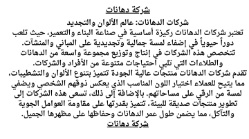 شركة دهانات شركات الدهانات :عالم األلوان والتجديد تعتبر شركات الدهانات ركيزة أساسية في صناعة البناء والتعمير ،حيث تلعب دورًا حيويًا في إضفاء لمسة جمالية وتجديدية على المباني والمنشآت. تتخصص هذه الشركات في إنتاج وتوزيع مجموعة واسعة من الدهانات والطالءات التي تلبي احتياجات متنوعة من األفراد والشركات. تقدم شركات الدهانات منتجات عالية الجودة تتميز بتنوع األلوان والتشطيبات، مما يتيح للعمالء اختيار اللون المناسب الذي يعكس ذوقهم الشخصي ويضفي لمسة من الرقي على مساحاتهم .باإلضافة إلى ذلك ،تسعى هذه الشركات إلى تطوير منتجات صديقة للبيئة ،تتميز بقدرتها على مقاومة العوامل الجوية والتآكل ،مما يضمن طول عمر الدهانات وحفاظها على مظهرها الجميل. شركة دهانات