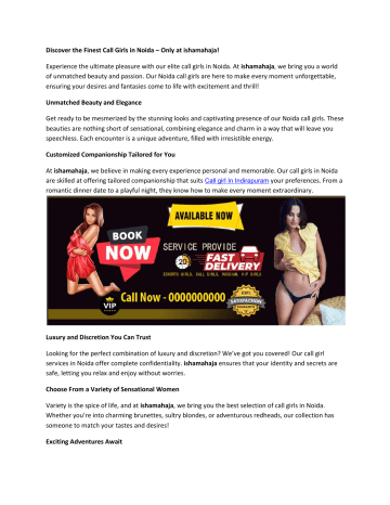 Discover the Finest Call Girls in Noida – Only at ishamahaja! Experience the ultimate pleasure with our elite call girls in Noida. At ishamahaja, we bring you a world of unmatched beauty and passion. Our Noida call girls are here to make every moment unforgettable, ensuring your desires and fantasies come to life with excitement and thrill! Unmatched Beauty and Elegance Get ready to be mesmerized by the stunning looks and captivating presence of our Noida call girls. These beauties are nothing short of sensational, combining elegance and charm in a way that will leave you speechless. Each encounter is a unique adventure, filled with irresistible energy. Customized Companionship Tailored for You At ishamahaja, we believe in making every experience personal and memorable. Our call girls in Noida are skilled at offering tailored companionship that suits Call girl In Indirapuram your preferences. From a romantic dinner date to a playful night, they know how to make every moment extraordinary. Luxury and Discretion You Can Trust Looking for the perfect combination of luxury and discretion? We’ve got you covered! Our call girl services in Noida offer complete confidentiality. ishamahaja ensures that your identity and secrets are safe, letting you relax and enjoy without worries. Choose From a Variety of Sensational Women Variety is the spice of life, and at ishamahaja, we bring you the best selection of call girls in Noida. Whether you’re into charming brunettes, sultry blondes, or adventurous redheads, our collection has someone to match your tastes and desires! Exciting Adventures Await Ready for an adventure? Our call girls in Noida will take you on a thrilling journey of passion and pleasure. Every moment spent together will be filled with excitement, laughter, and memorable surprises that will make you crave more. Sophistication and Class Our Noida call girls bring an air of sophistication to every Call Girls Service In Indirapuram meeting. They are well-educated, articulate, and elegant, making them the perfect companions for formal events, parties, or intimate gatherings. ishamahaja promises you the classiest experiences! 24/7 Availability for Your Convenience Need a companion at an unexpected hour? Worry not! Our services are available 24/7 to cater to your needs. We understand that desires can strike at any time, and ishamahaja is always here to make your fantasies come true, day or night. Effortless Booking Process Booking your dream companion has never been easier! With ishamahaja, we provide a seamless and simple booking experience. Just select your preferred Noida call girl, and our team will handle the rest. Get ready for an unforgettable rendezvous! Memorable Dates Like Never Before Turn your ordinary days into extraordinary adventures with our call girls in Noida. Whether it’s a candlelit dinner or an exciting city tour, our companions will ensure that your date is filled with charm and delight, leaving you with lasting memories. Passion and Playfulness Combined Experience the perfect balance of passion and playfulness! Our Noida call girls are experts in making every moment thrilling. At ishamahaja, we believe in making you feel alive with heart-pounding excitement and genuine, playful chemistry. Sensational Experiences for Your Wildest Dreams Dare to dream big? With our call girls in Noida, you can experience everything you’ve ever fantasized about. ishamahaja makes your wildest dreams Greater noida Call girl a reality, turning them into breathtaking moments that leave you breathless. Genuine Connections and Authentic Encounters At ishamahaja, we go beyond just providing beautiful companions. We focus on building genuine connections and authentic encounters, ensuring that your time with our Noida call girls is filled with real emotions, warmth, and delightful intimacy. Top-Notch Safety and Security Your safety is our top priority! We maintain the highest standards of safety and security for all our clients. ishamahaja takes every measure to ensure a risk-free, comfortable, and enjoyable experience, letting you focus on having fun! Exclusive VIP Services for Special Clients Want to feel like a VIP? We offer exclusive services for our premium clients, delivering the ultimate luxury experience. Our Noida call girls are trained to provide world-class treatment, making you feel special and pampered from the moment you meet. Romantic Escapes and Getaways Escape the mundane and dive into a world of romance with our Noida call girls. Whether it’s a weekend retreat or a spontaneous getaway, ishamahaja ensures that your romantic escapade is filled with passion and adventure. Unleash Your Inner Fantasies Have a fantasy you’ve always wanted to explore? Our Noida call girls are here to fulfill your deepest desires. With ishamahaja, you can let your imagination run wild, knowing that we’re here to turn your dreams into reality! Discover a New Level of Pleasure Prepare to be amazed as our call girls in Noida introduce you to a whole new level of pleasure. ishamahaja offers experiences that are designed to satisfy every craving, leaving you feeling completely satisfied and wanting more. Flawless Companions for Every Occasion Our Noida call girls are perfect for any occasion. Be it a business event, a casual outing, or a night of passion, ishamahaja provides companions who can effortlessly blend into your world, enhancing every moment with their charm. Unforgettable Nights of Seduction Get ready for nights filled with seduction and mystery! Our call girls in Noida know exactly how to captivate and excite, ensuring that your night is packed with playful fun and enticing allure. ishamahaja promises experiences that you’ll never forget. Stay Updated with ishamahaja Always stay connected and updated with the latest from ishamahaja. We’re dedicated to bringing you the best call girl services in Noida, continuously improving and ensuring you have access to the most thrilling and