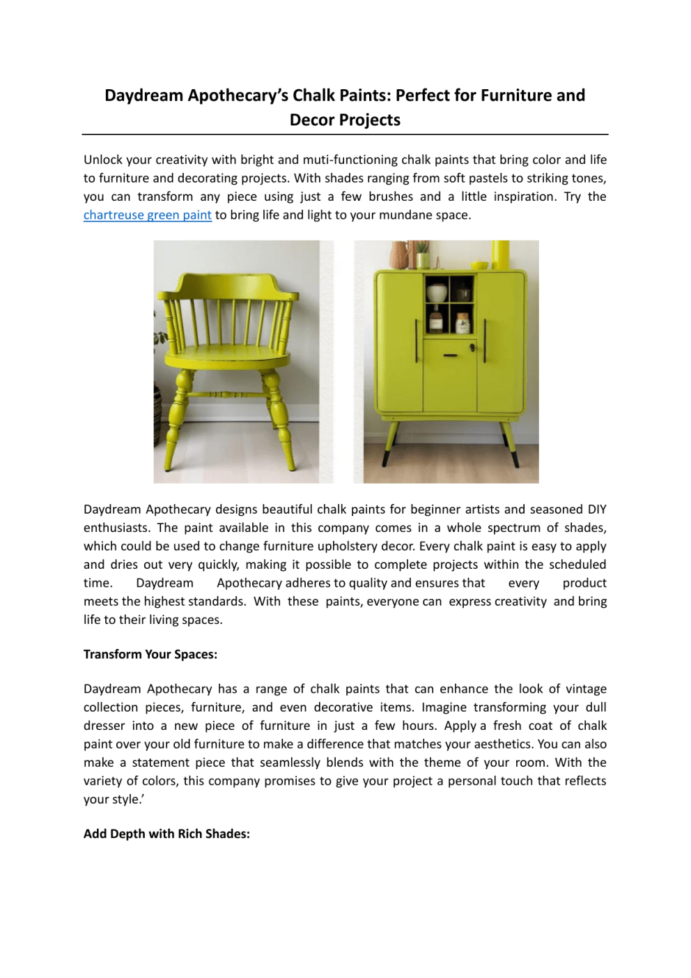 Daydream Apothecary’s Chalk Paints: Perfect for Furniture and Decor Projects Unlock your creativity with bright and muti-functioning chalk paints that bring color and life to furniture and decorating projects. With shades ranging from soft pastels to striking tones, you can transform any piece using just a few brushes and a little inspiration. Try the chartreuse green paint to bring life and light to your mundane space. Daydream Apothecary designs beautiful chalk paints for beginner artists and seasoned DIY enthusiasts. The paint available in this company comes in a whole spectrum of shades, which could be used to change furniture upholstery decor. Every chalk paint is easy to apply and dries out very quickly, making it possible to complete projects within the scheduled time. Daydream Apothecary adheres to quality and ensures that every product meets the highest standards. With these paints, everyone can express creativity and bring life to their living spaces. Transform Your Spaces: Daydream Apothecary has a range of chalk paints that can enhance the look of vintage collection pieces, furniture, and even decorative items. Imagine transforming your dull dresser into a new piece of furniture in just a few hours. Apply a fresh coat of chalk paint over your old furniture to make a difference that matches your aesthetics. You can also make a statement piece that seamlessly blends with the theme of your room. With the variety of colors, this company promises to give your project a personal touch that reflects your style.’ Add Depth with Rich Shades: If you want to add some richness to your next project, consider using burgundy chalk paint. This rich shade can provide much depth and sophistication to any piece of furniture. Think of a striking side table in a luxurious shade of burgundy, which is eye-catching and makes people stop to compliment it. Daydream Apothecary has chalk paints that blend well on diverse surfaces. Enjoy a rich texture that glides on nicely with little preparation work. You can use these chalk paints to do massive makeovers or add little decorative touches. The possibilities are endless and limited only to your imagination. Make Timeless Appeal: For people wishing to have a touch of elegance and a timeless look, the perfect solution is chalk paints from Daydream Apothecary. For an incredibly rustic or farmhouse feel, brown chalk paint furniture would be best. The earthy tone creates a warm feel and always harmonizes with most styles. It is suitable for traditional and modern building aesthetics. Embrace your creativity and transform your space with unique chalk paints. For more information, visit https://daydreamapothecarypaint.com/. Original Source: https://bit.ly/41f2X60