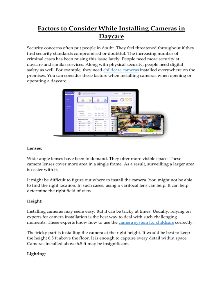 Factors to Consider While Installing Cameras in Daycare Security concerns often put people in doubt. They feel threatened throughout if they find security standards compromised or doubtful. The increasing number of criminal cases has been raising this issue lately. People need more security at daycare and similar services. Along with physical security, people need digital safety as well. For example, they need childcare cameras installed everywhere on the premises. You can consider these factors when installing cameras when opening or operating a daycare. Lenses: Wide-angle lenses have been in demand. They offer more visible space. These camera lenses cover more area in a single frame. As a result, surveilling a larger area is easier with it. It might be difficult to figure out where to install the camera. You might not be able to find the right location. In such cases, using a varifocal lens can help. It can help determine the right field of view. Height: Installing cameras may seem easy. But it can be tricky at times. Usually, relying on experts for camera installation is the best way to deal with such challenging moments. These experts know how to use the camera system for childcare correctly. The tricky part is installing the camera at the right height. It would be best to keep the height 6.5 ft above the floor. It is enough to capture every detail within space. Cameras installed above 6.5 ft may be insignificant. Lighting: Installing cameras at the right place is crucial. It is necessary to keep the camera units aware of direct sunlight. Harsh light sources can also impact image quality. Therefore, choosing the appropriate position makes a substantial difference. Otherwise, images and footage captured by these cameras would make no sense. Choose a space that is not highly affected by light. It would be better to find a corner that can cleanly record everything. Expert camera installers can easily determine the right position for these cameras. Hence, high safety standards can be established in the daycare for consistent digital security. About ZOOMiN LIVE: ZOOMiN LIVE can help you with childcare camera installations, allowing childcare and daycare services to share live-stream videos with families. The daycare cameras capture clear footage that anyone with access can check and see what their child is up to. The best part is that families can access these live streams through any device, from smartphones to personal computers. Check out more at https://www.zoominlive.com/ Original Source: https://bit.ly/4dOgHat