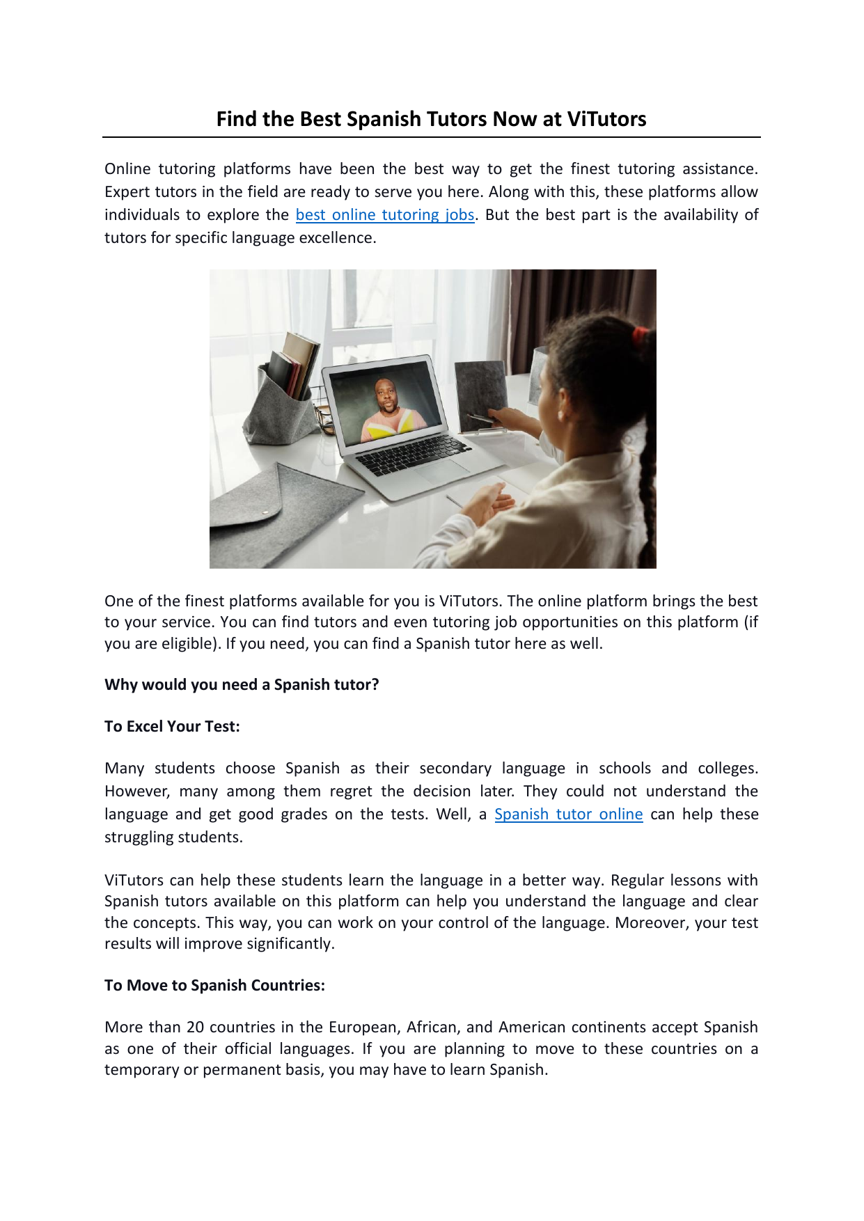 Find the Best Spanish Tutors Now at ViTutors Online tutoring platforms have been the best way to get the finest tutoring assistance. Expert tutors in the field are ready to serve you here. Along with this, these platforms allow individuals to explore the best online tutoring jobs. But the best part is the availability of tutors for specific language excellence. One of the finest platforms available for you is ViTutors. The online platform brings the best to your service. You can find tutors and even tutoring job opportunities on this platform (if you are eligible). If you need, you can find a Spanish tutor here as well. Why would you need a Spanish tutor? To Excel Your Test: Many students choose Spanish as their secondary language in schools and colleges. However, many among them regret the decision later. They could not understand the language and get good grades on the tests. Well, a Spanish tutor online can help these struggling students. ViTutors can help these students learn the language in a better way. Regular lessons with Spanish tutors available on this platform can help you understand the language and clear the concepts. This way, you can work on your control of the language. Moreover, your test results will improve significantly. To Move to Spanish Countries: More than 20 countries in the European, African, and American continents accept Spanish as one of their official languages. If you are planning to move to these countries on a temporary or permanent basis, you may have to learn Spanish. ViTutors can play a crucial role here. The Spanish tutors from this platform can tutor you. They can help you read, write, and speak Spanish correctly. This way, it will be easier for you to communicate and interact with individuals in these countries. So, make sure to try this out. General Interest: Many people love to explore languages. They love to learn the vividness of every language. The knowledge of languages helps these individuals have better acceptance of different ways of speaking. As a result, their literature knowledge is on the next level. The best online Spanish tutors can help you understand Spanish faster. You can find these tutors easily at ViTutors. The online platform has Spanish experts with years of experience and familiarity with the language. They can help you learn the language faster and make sure that you understand the difference between Spanish and other languages. So, make sure to try it out. Find out more at https://vitutors.com/. Original Source: https://bit.ly/4g7axEh