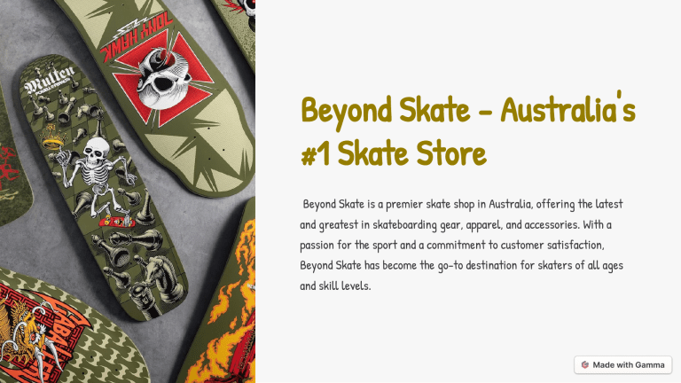 Beyond Skate - Australia's #1 Skate Store Beyond Skate is a premier skate shop in Australia, offering the latest and greatest in skateboarding gear, apparel, and accessories. With a passion for the sport and a commitment to customer satisfaction, Beyond Skate has become the go-to destination for skaters of all ages and skill levels. Our Mission and Values 1 Inspire Passion 2 Exceptional Service 3 Quality Products We are dedicated to fostering Our knowledgeable staff We curate a diverse selection a love for skateboar1ding and provides personalized of high-quality skateboards, creating a vibrant attention and expertise to apparel, and accessories community of enthusiasts. ensure each customer has a from the industry's top memorable shopping brands. experience. Our Products and Services Skateboards Apparel Services From beginner-friendly cruisers to Stay stylish and comfortable on Our on-site workshop offers expert advanced pro models, we have the and off the board with our exclusive skateboard repair, custom builds, perfect skateboard for every rider. line of skate-inspired clothing and and personalized setup services. accessories. Our Customer Experience Knowledgeable Staff 1 Our passionate team of skaters provides personalized guidance and expertise to ensure each customer finds the perfect gear. Interactive Showroom 2 Customers can test out skateboards and gear in our dedicated indoor skate park, ensuring a perfect fit and feel. Unparalleled Service 3 From in-store workshops to online ordering and delivery, we strive to exceed expectations at every touchpoint. Our Competitive Advantage Industry Expertise Curated Selection Our founder and team have decades of experience in We meticulously curate our product offerings to the skateboarding industry, ensuring we stay at the provide customers with the highest-quality, most forefront of trends and innovations. sought-after skate gear and apparel. Community Involvement Exceptional Value Beyond Skate actively supports local skate events, Our competitive pricing and loyalty programs ensure competitions, and community initiatives, fostering our customers receive the best value for their strong relationships with our customers. money. Contact Us Phone Email Visit Us 0438 917 841 [email protected] 345 Charles Street , North Perth, WA, 6006