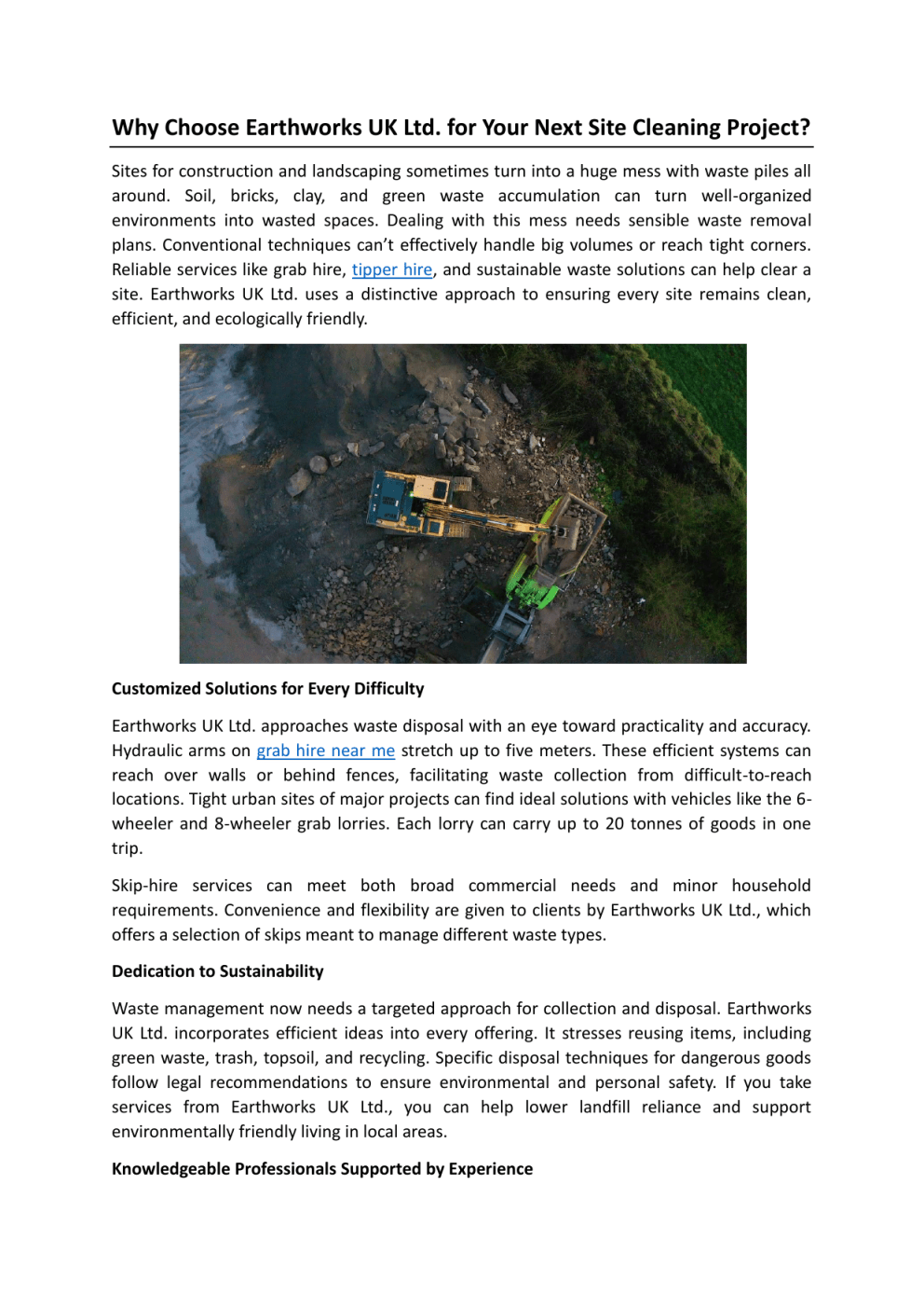 Why Choose Earthworks UK Ltd. for Your Next Site Cleaning Project? Sites for construction and landscaping sometimes turn into a huge mess with waste piles all around. Soil, bricks, clay, and green waste accumulation can turn well-organized environments into wasted spaces. Dealing with this mess needs sensible waste removal plans. Conventional techniques can’t effectively handle big volumes or reach tight corners. Reliable services like grab hire, tipper hire, and sustainable waste solutions can help clear a site. Earthworks UK Ltd. uses a distinctive approach to ensuring every site remains clean, efficient, and ecologically friendly. Customized Solutions for Every Difficulty Earthworks UK Ltd. approaches waste disposal with an eye toward practicality and accuracy. Hydraulic arms on grab hire near me stretch up to five meters. These efficient systems can reach over walls or behind fences, facilitating waste collection from difficult-to-reach locations. Tight urban sites of major projects can find ideal solutions with vehicles like the 6wheeler and 8-wheeler grab lorries. Each lorry can carry up to 20 tonnes of goods in one trip. Skip-hire services can meet both broad commercial needs and minor household requirements. Convenience and flexibility are given to clients by Earthworks UK Ltd., which offers a selection of skips meant to manage different waste types. Dedication to Sustainability Waste management now needs a targeted approach for collection and disposal. Earthworks UK Ltd. incorporates efficient ideas into every offering. It stresses reusing items, including green waste, trash, topsoil, and recycling. Specific disposal techniques for dangerous goods follow legal recommendations to ensure environmental and personal safety. If you take services from Earthworks UK Ltd., you can help lower landfill reliance and support environmentally friendly living in local areas. Knowledgeable Professionals Supported by Experience One of the main factors that distinguishes Earthworks UK Ltd. is its group of competent operators. Its operators are experts in precisely handling vehicles through limited areas. The staff has years of expertise and promises consistent, flawless service. The company's standing rests on dependability, confidence, and flexibility. Every project gets individual attention within its service. The Perfect Partner Combining knowledge, technology, and sustainability, Earthworks UK Ltd. addresses waste issues squarely. It removes inefficiencies, reduces environmental impact, and offers each customer a customized solution. This company's creative ideas and environmental consciousness redefine site cleaning. Choose Earthworks UK Ltd. for dependable tipper hire near me, so that waste management is done right. Get in touch with reliable https://www.earthworksuk.co.uk/ Original Source: https://bit.ly/49ruVh3 tipper hire service providers by visiting