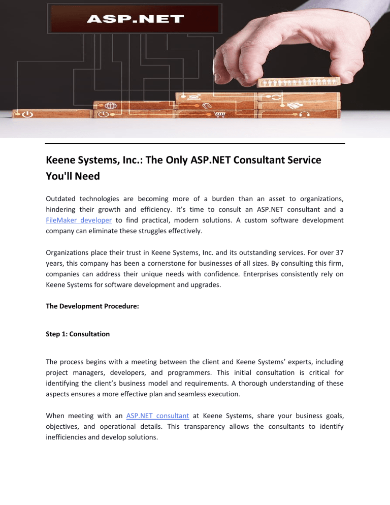 Keene Systems, Inc.: The Only ASP.NET Consultant Service You'll Need Outdated technologies are becoming more of a burden than an asset to organizations, hindering their growth and efficiency. It’s time to consult an ASP.NET consultant and a FileMaker developer to find practical, modern solutions. A custom software development company can eliminate these struggles effectively. Organizations place their trust in Keene Systems, Inc. and its outstanding services. For over 37 years, this company has been a cornerstone for businesses of all sizes. By consulting this firm, companies can address their unique needs with confidence. Enterprises consistently rely on Keene Systems for software development and upgrades. The Development Procedure: Step 1: Consultation The process begins with a meeting between the client and Keene Systems’ experts, including project managers, developers, and programmers. This initial consultation is critical for identifying the client’s business model and requirements. A thorough understanding of these aspects ensures a more effective plan and seamless execution. When meeting with an ASP.NET consultant at Keene Systems, share your business goals, objectives, and operational details. This transparency allows the consultants to identify inefficiencies and develop solutions. Step 2: Planning and Strategizing The insights gained during the consultation guide the next steps, including internal discussions, planning, and strategizing. The development team at Keene Systems designs software solutions tailored to fit the organization’s existing structure. This step is pivotal in ensuring smooth execution during subsequent phases. Keene Systems takes a meticulous approach to planning and strategizing. The team considers every potential challenge a business might face in its industry, addressing these concerns at the planning stage to prevent complications later. This approach ensures the software solution remains relevant and effective for years. Step 3: Development and Deployment The development phase involves collaboration among ASP programmer, UI/UX developers, and testers. The objective is to create and deploy the software solution as quickly as possible, allowing the client to begin reaping its benefits sooner. Keene Systems specializes in developing web applications designed for both employee and customer use. These applications streamline daily operations, improve consistency, and eliminate errors. By adopting these innovative solutions, your organization can enhance efficiency, modernize its processes, and gain a competitive edge in the market. Conclusion Keene Systems offers the expertise and resources to revolutionize your business operations. From consultation to deployment, every step is handled with precision and professionalism. Take your organization to the next level by partnering with Keene Systems today! Find out more at https://www.KeeneSystems.com Original Source: https://bit.ly/3Pb73F5