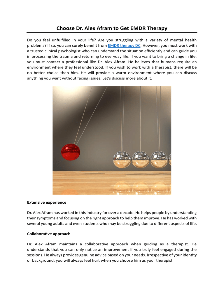 Choose Dr. Alex Afram to Get EMDR Therapy Do you feel unfulfilled in your life? Are you struggling with a variety of mental health problems? If so, you can surely benefit from EMDR therapy DC. However, you must work with a trusted clinical psychologist who can understand the situation efficiently and can guide you in processing the trauma and returning to everyday life. If you want to bring a change in life, you must contact a professional like Dr. Alex Afram. He believes that humans require an environment where they feel understood. If you wish to work with a therapist, there will be no better choice than him. He will provide a warm environment where you can discuss anything you want without facing issues. Let’s discuss more about it. Extensive experience Dr. Alex Afram has worked in this industry for over a decade. He helps people by understanding their symptoms and focusing on the right approach to help them improve. He has worked with several young adults and even students who may be struggling due to different aspects of life. Collaborative approach Dr. Alex Afram maintains a collaborative approach when guiding as a therapist. He understands that you can only notice an improvement if you truly feel engaged during the sessions. He always provides genuine advice based on your needs. Irrespective of your identity or background, you will always feel hurt when you choose him as your therapist. EMDR therapy Whenever someone has a traumatic experience in life, it will be processed differently. Whenever you notice a threat in the environment, you would want to protect yourself. Such experiences can be traumatic. However, processing these experiences and moving back to your normal life may be difficult. Dr. Alex Afram can guide you through EMDR therapy Washington DC. This therapy will help ensure you do not immediately get into a fight or flight mode whenever there are triggers about the traumatic experience. Hence, you will not struggle with negative emotions when facing such triggers. EMDR therapy is a unique approach. It is different from traditional methods since the process involves less explaining. Hence, if you have experienced a trauma that you want to move on from, this therapy by Dr. Alex Afram would be a suitable choice for you. It will help you in your healing journey. If you are looking for couples therapy DC solutions, you can connect with Dr. Alex Afram. He will provide you with the perfect assistance. To get more details, visit https://dralexafram.com/ Original Source: https://bit.ly/3Dx45YV