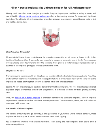 All-on-4 Dental Implants: The Ultimate Solution for Full-Arch Restoration Missing teeth can affect more than just your smile. They can impact your confidence, ability to speak, and overall health. All on 4 dental implants Melbourne offers a life-changing solution for those with significant tooth loss. The ultimate full-arch restoration procedure provides a permanent, natural-looking smile in just one visit to a dental clinic. What Are All-on-4 Implants? All-on-4 dental implants are revolutionary for replacing a complete set of upper or lower teeth. Unlike traditional implants, All-on-4 uses only four implants to support a complete row of teeth. The procedure involves placing these four implants into the jawbone. Once placed, a custom-designed prosthetic arch is attached to the implants, giving you a full set of functional teeth. Why Choose All-on-4? There are several reasons why All-on-4 implants are considered the best solution for many patients. First, they are faster than traditional implant methods. Most patients have their new teeth fitted on the same day as the implants are placed, allowing them to leave the dental office with a full set of teeth. Second, All-on-4 implants require less bone density than traditional implants. The four implants are positioned at precise angles to maximize contact with the jawbone. It eliminates the need for bone grafting in many cases. Third, the cost all on 4 dental implants is affordable compared to traditional implants. All-on-4 implants require fewer appointments than traditional implant procedures. They are durable, stable, and built to last for many years with proper care. The Benefits of All-on-4 Implants The benefits of four implants go beyond just the appearance of your smile. Unlike removal dentures, these implants are fixed in place. It means no more worries about teeth slipping. You can eat your favourite foods without restriction. These strong and stable implants allow you to enjoy a wider variety of foods. Because they are anchored into the jawbone, these four implants help prevent bone loss, and they are familiar with missing teeth. The prosthetic arch attached to the implants is custom-designed to match the appearance of natural teeth, ensuring your smile looks natural. So, the procedure is suitable, but it’s essential to consult with the best cosmetic dentist Melbourne to determine if you’re a good candidate. All-on-4 dental implants are changing the way people restore their smiles. If you’re looking for a permanent way to restore your smile, this treatment could be your ultimate option. Schedule your appointment with the best dentist at https://drhelen.com.au/ Original source: https://bit.ly/49YrOgQ
