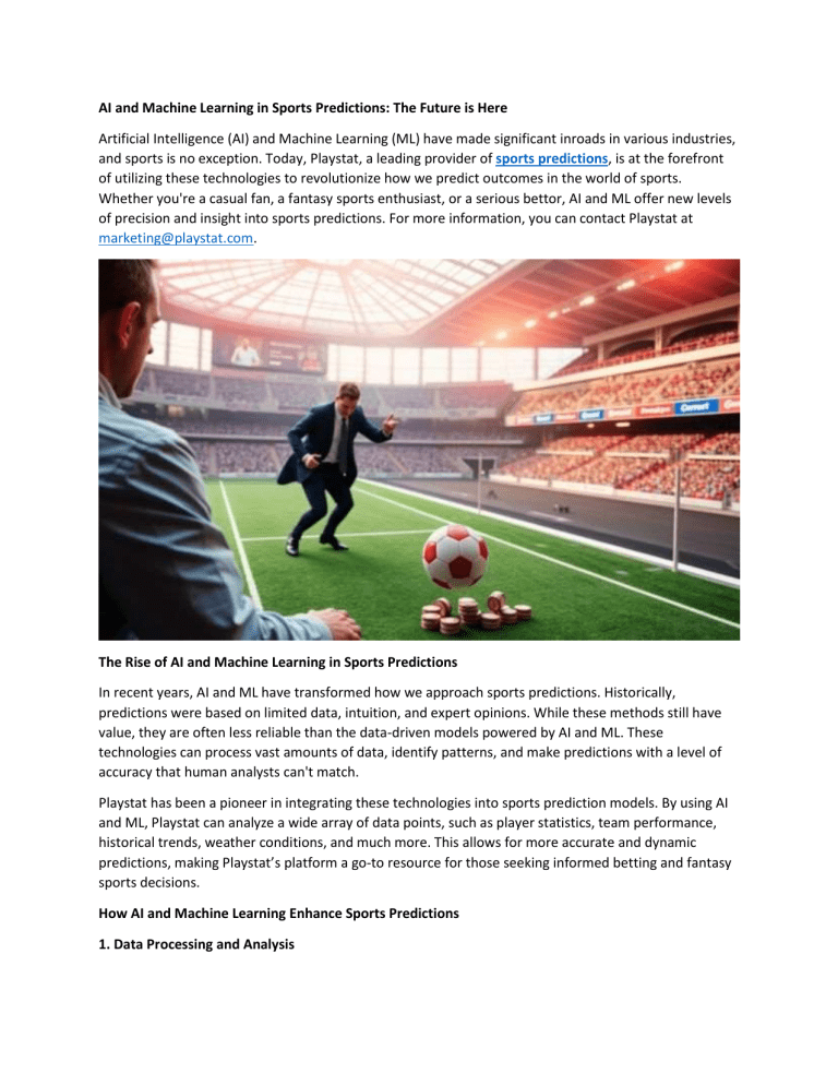 AI and Machine Learning in Sports Predictions: The Future is Here Artificial Intelligence (AI) and Machine Learning (ML) have made significant inroads in various industries, and sports is no exception. Today, Playstat, a leading provider of sports predictions, is at the forefront of utilizing these technologies to revolutionize how we predict outcomes in the world of sports. Whether you're a casual fan, a fantasy sports enthusiast, or a serious bettor, AI and ML offer new levels of precision and insight into sports predictions. For more information, you can contact Playstat at [email protected]. The Rise of AI and Machine Learning in Sports Predictions In recent years, AI and ML have transformed how we approach sports predictions. Historically, predictions were based on limited data, intuition, and expert opinions. While these methods still have value, they are often less reliable than the data-driven models powered by AI and ML. These technologies can process vast amounts of data, identify patterns, and make predictions with a level of accuracy that human analysts can't match. Playstat has been a pioneer in integrating these technologies into sports prediction models. By using AI and ML, Playstat can analyze a wide array of data points, such as player statistics, team performance, historical trends, weather conditions, and much more. This allows for more accurate and dynamic predictions, making Playstat’s platform a go-to resource for those seeking informed betting and fantasy sports decisions. How AI and Machine Learning Enhance Sports Predictions 1. Data Processing and Analysis One of the main benefits of AI and ML is their ability to process large volumes of data quickly and efficiently. In sports predictions, data is crucial. It encompasses everything from a player's past performance to environmental factors like weather and even social sentiment analysis. AI algorithms can process this data and identify patterns that human analysts might overlook. For example, Playstat’s platform uses advanced machine learning models to analyze thousands of data points from previous matches to predict the outcome of future games. The more data the system collects, the more accurate the predictions become over time, making AI and ML essential tools in the field of sports analytics. 2. Predictive Modeling AI and ML use predictive modeling to forecast future events based on historical data. In sports, this could mean predicting the winner of a match, the performance of an individual player, or the likelihood of a specific outcome, like a certain number of goals or points scored. Machine learning models are trained on historical data, learning from past games, and refining their predictions as new data is introduced. As more data is gathered, these models can make predictions with greater accuracy. This is particularly valuable in fast-paced, data-heavy sports such as football, basketball, and tennis, where outcomes can be influenced by many variables. 3. Real-Time Analysis and Adjustments One of the most exciting developments in sports predictions powered by AI is real-time analysis. AI can continuously monitor games in progress and update predictions based on live data. For instance, Playstat’s platform can track real-time player stats, injuries, and game dynamics, adjusting predictions as the game unfolds. This allows fans, bettors, and analysts to get up-to-the-minute insights and adjust their strategies accordingly. This feature is particularly useful for live betting, where odds change rapidly, and the ability to make real-time decisions can have a significant impact on the outcome. AI's capacity for dynamic, real-time analysis offers a huge advantage over traditional prediction models that only update after a game has concluded. 4. Improved Accuracy Through Machine Learning The power of machine learning lies in its ability to improve over time. As ML models are exposed to more data, they can adjust their algorithms and become better at predicting outcomes. Playstat’s use of machine learning means that their predictions become more accurate with every match played and every data point added. For example, if a player performs exceptionally well or underperforms in a match, the machine learning model can learn from these new data points and refine its predictions for future events. This continuous learning process makes AI and ML incredibly effective tools for sports predictions, especially when factoring in the unpredictable nature of sports. The Future of AI and Machine Learning in Sports Predictions As AI and machine learning continue to evolve, so too will their role in sports predictions. The future promises even more advanced prediction models and tools that will provide deeper insights into the world of sports. Here are some potential developments on the horizon: 1. Enhanced Personalization AI can analyze individual preferences and betting patterns to provide personalized predictions and recommendations. For example, Playstat could offer tailored insights based on your past betting behavior, the sports you follow, and the teams you support. This level of customization would make predictions even more relevant and useful to individual users. 2. Virtual and Augmented Reality (VR/AR) Integration In the near future, VR and AR could be integrated with AI and machine learning to provide immersive sports experiences. These technologies could allow fans to visualize predictions in real-time or watch simulations of games, giving them a better understanding of the outcomes. 3. Greater Use of Social Media Data Social media platforms are a treasure trove of data that can influence sports predictions. AI could analyze fan sentiment and player interactions on social media to refine predictions further. For instance, if a player is rumored to be injured or a team is experiencing internal conflict, these insights could affect the odds or predictions. Playstat could integrate social media sentiment a
