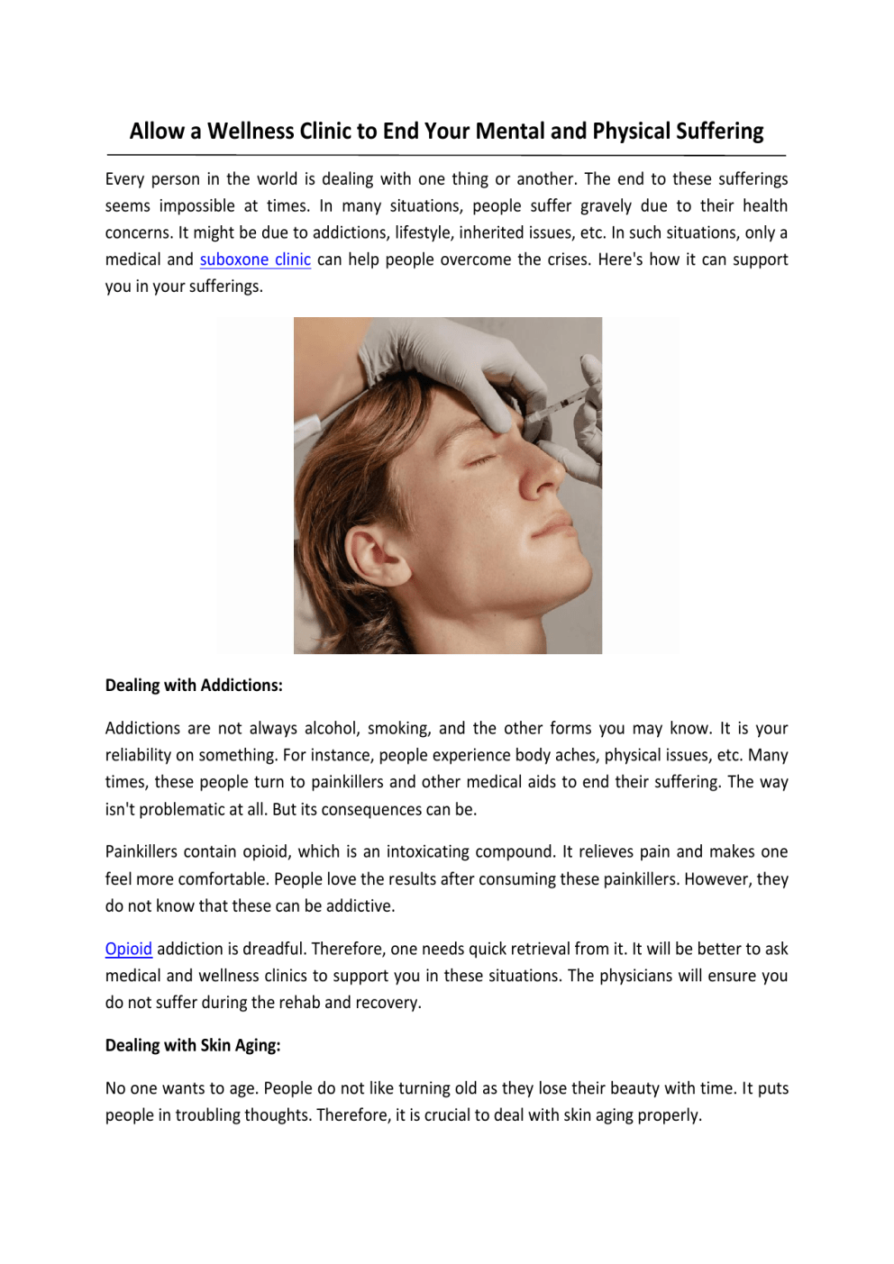 Allow a Wellness Clinic to End Your Mental and Physical Suffering Every person in the world is dealing with one thing or another. The end to these sufferings seems impossible at times. In many situations, people suffer gravely due to their health concerns. It might be due to addictions, lifestyle, inherited issues, etc. In such situations, only a medical and suboxone clinic can help people overcome the crises. Here's how it can support you in your sufferings. Dealing with Addictions: Addictions are not always alcohol, smoking, and the other forms you may know. It is your reliability on something. For instance, people experience body aches, physical issues, etc. Many times, these people turn to painkillers and other medical aids to end their suffering. The way isn't problematic at all. But its consequences can be. Painkillers contain opioid, which is an intoxicating compound. It relieves pain and makes one feel more comfortable. People love the results after consuming these painkillers. However, they do not know that these can be addictive. Opioid addiction is dreadful. Therefore, one needs quick retrieval from it. It will be better to ask medical and wellness clinics to support you in these situations. The physicians will ensure you do not suffer during the rehab and recovery. Dealing with Skin Aging: No one wants to age. People do not like turning old as they lose their beauty with time. It puts people in troubling thoughts. Therefore, it is crucial to deal with skin aging properly. Wellness clinics understand the importance of beauty and aesthetics among people. Therefore, these clinics support people in need. These clinics offer exceptional aesthetic and beauty treatments to boost your confidence. People can end their suffering, often related to aging, with their help. So, make an appointment now! Dealing with Weight Concerns: Lifestyle has been changing drastically with time. People are consistently consuming unhealthy food. As a result, they often encounter weight-related issues. Gaining more weight with time is pretty bothering. It will be better to consult a weight loss clinic in such cases. These weight loss clinics can help you during your struggling phases. Wellness clinics help overweight people to begin their weight loss journey. The professionals ensure you lose fat without compromising your health and abilities. In other words, they lead you to a healthy weight loss journey. Hence, it is one of the best options for you. Wellness Medical Clinic is one of the best clinics to end physical, mental, and other struggles. Check out more at https://tallyclinics.com/ Original Source: https://bit.ly/4j1E3gA