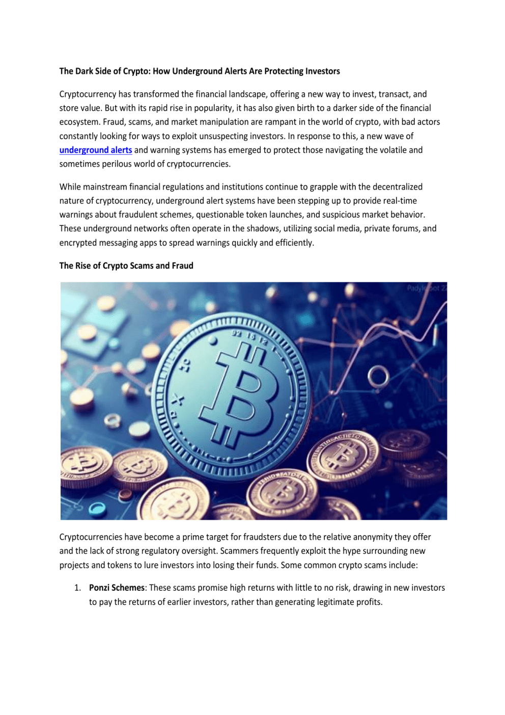 The Dark Side of Crypto: How Underground Alerts Are Protecting Investors Cryptocurrency has transformed the financial landscape, offering a new way to invest, transact, and store value. But with its rapid rise in popularity, it has also given birth to a darker side of the financial ecosystem. Fraud, scams, and market manipulation are rampant in the world of crypto, with bad actors constantly looking for ways to exploit unsuspecting investors. In response to this, a new wave of underground alerts and warning systems has emerged to protect those navigating the volatile and sometimes perilous world of cryptocurrencies. While mainstream financial regulations and institutions continue to grapple with the decentralized nature of cryptocurrency, underground alert systems have been stepping up to provide real-time warnings about fraudulent schemes, questionable token launches, and suspicious market behavior. These underground networks often operate in the shadows, utilizing social media, private forums, and encrypted messaging apps to spread warnings quickly and efficiently. The Rise of Crypto Scams and Fraud Cryptocurrencies have become a prime target for fraudsters due to the relative anonymity they offer and the lack of strong regulatory oversight. Scammers frequently exploit the hype surrounding new projects and tokens to lure investors into losing their funds. Some common crypto scams include: 1. Ponzi Schemes: These scams promise high returns with little to no risk, drawing in new investors to pay the returns of earlier investors, rather than generating legitimate profits. 2. Pump-and-Dump Schemes: Malicious groups artificially inflate the price of a cryptocurrency through coordinated buying, only to sell off their holdings at a profit once the price rises, leaving other investors holding worthless tokens. 3. Phishing Attacks: Fraudsters trick users into revealing private keys or login credentials through fake websites, emails, or social media profiles. 4. Rug Pulls: This occurs when the developers of a cryptocurrency project or token suddenly withdraw all funds from a liquidity pool, causing the token’s value to plummet, leaving investors with nothing. These types of scams are often difficult to detect, especially for novice investors who may not fully understand the risks involved in cryptocurrency trading or may not be familiar with the telltale signs of a scam. Underground Alerts: A Lifeline for Crypto Investors In response to the growing number of scams, underground alert systems have gained traction in the crypto community. These networks often operate in decentralized, private spaces, such as Telegram groups, Discord channels, and Reddit threads. Within these communities, experienced traders and whistleblowers share tips, red flags, and reports of potential fraud. These systems act as an earlywarning mechanism, helping investors protect their portfolios from sudden crashes or manipulations. 1. Community-Driven Alerts: One of the most powerful aspects of underground alerts is the community-driven nature. Traders, influencers, and researchers collaborate to share information and warn others about risky projects. This collective intelligence often enables faster identification of fraudulent activities than traditional channels. 2. Real-Time Information: Underground alert systems operate in real-time, allowing users to react quickly to emerging scams. Unlike traditional media outlets or regulatory bodies, which can take time to investigate and publish reports, these communities offer immediate warnings, enabling investors to act before they are exposed to financial losses. 3. Tracking Red Flags: Veteran crypto traders often know how to spot the signs of a scam before it goes mainstream. By keeping a close eye on suspicious token launches, the behavior of developers, or unusual trading patterns, they are able to warn others about potential dangers. These red flags include discrepancies in whitepapers, unverified team members, and unrealistic promises of returns. 4. Educating Investors: Beyond just alerting investors about scams, underground alert systems also provide education on how to spot fraudulent schemes. They help investors understand the risks of high volatility, the importance of doing due diligence, and the need to be skeptical of unsolicited investment opportunities. Social Media and Privacy Tools: Key to the Alert System The success of these underground alert systems is largely due to the power of social media and privacy tools, which provide an accessible and secure way to communicate with a large audience. 1. Telegram and Discord: Messaging platforms like Telegram and Discord have become popular hubs for crypto communities. These platforms allow investors to join dedicated channels and groups where alerts, news, and information are shared instantly. Telegram groups, in particular, have been used to track scams, share wallet addresses involved in illicit activity, and identify pump-and-dump schemes in progress. 2. Reddit and Other Forums: Reddit, with its anonymity and decentralized structure, has long been a platform for crypto enthusiasts to discuss potential scams and projects. Subreddits like r/CryptoCurrency and r/CryptoScams provide a space for investors to ask questions, share warnings, and research new coins. 3. Encrypted Messaging: Privacy tools such as Signal and ProtonMail allow whistleblowers to alert others about scams while maintaining anonymity. This is especially important in a market as volatile as crypto, where exposing fraud can make someone a target for retaliation. Challenges and Ethical Considerations While underground alerts can be a valuable resource for crypto investors, there are several challenges and ethical considerations associated with these systems: 1. Accuracy of Alerts: The decentralized nature of these alert systems means there is no central authority to verify the information shared. False alarms or rumors can spread quickly, potentially