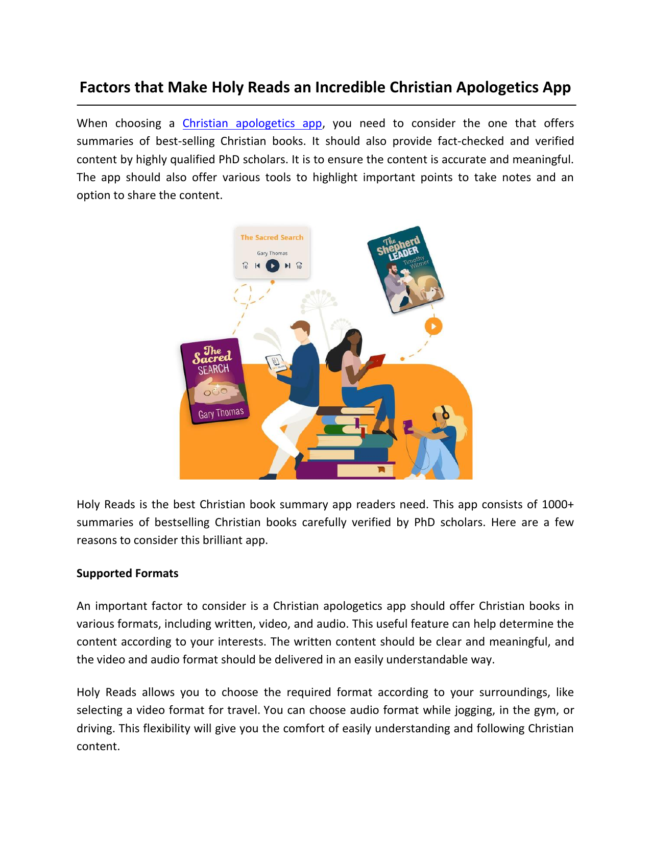 Factors that Make Holy Reads an Incredible Christian Apologetics App When choosing a Christian apologetics app, you need to consider the one that offers summaries of best-selling Christian books. It should also provide fact-checked and verified content by highly qualified PhD scholars. It is to ensure the content is accurate and meaningful. The app should also offer various tools to highlight important points to take notes and an option to share the content. Holy Reads is the best Christian book summary app readers need. This app consists of 1000+ summaries of bestselling Christian books carefully verified by PhD scholars. Here are a few reasons to consider this brilliant app. Supported Formats An important factor to consider is a Christian apologetics app should offer Christian books in various formats, including written, video, and audio. This useful feature can help determine the content according to your interests. The written content should be clear and meaningful, and the video and audio format should be delivered in an easily understandable way. Holy Reads allows you to choose the required format according to your surroundings, like selecting a video format for travel. You can choose audio format while jogging, in the gym, or driving. This flexibility will give you the comfort of easily understanding and following Christian content. Targeted Information A Christian apologetics app should also provide targeted information, like summaries of mustread articles from top Christian magazines or Bible studies for small groups. The app should offer quality content from various sources. These summaries should be clear and informative and also highlight the main points. If these features are present, you don't need to refer to multiple sources for Christian content; everything will be under one roof. You should consider Holy Reads as it provides the latest and best information about Christian literature. The app should also offer only the content that the experts, like scholars with PhDs, verify. Offline Access Another essential factor to consider is the Christian Apologetics app should offer the option of downloading for offline use. This feature is pretty helpful when planning a Sunday school curriculum or visiting a remote area. Holy Reads allows you to download your favorite content and access it whenever you require it, minimizing the dependency on a stable internet. You can easily access the content without any interruptions. In this way, you can enjoy your favorite Christian content anytime, anywhere. Choosing this app with an offline option will ensure your peace of mind. Explore features of the Christian Books app at https://www.holyreads.com/ Original Source: https://bit.ly/4gO5BEX