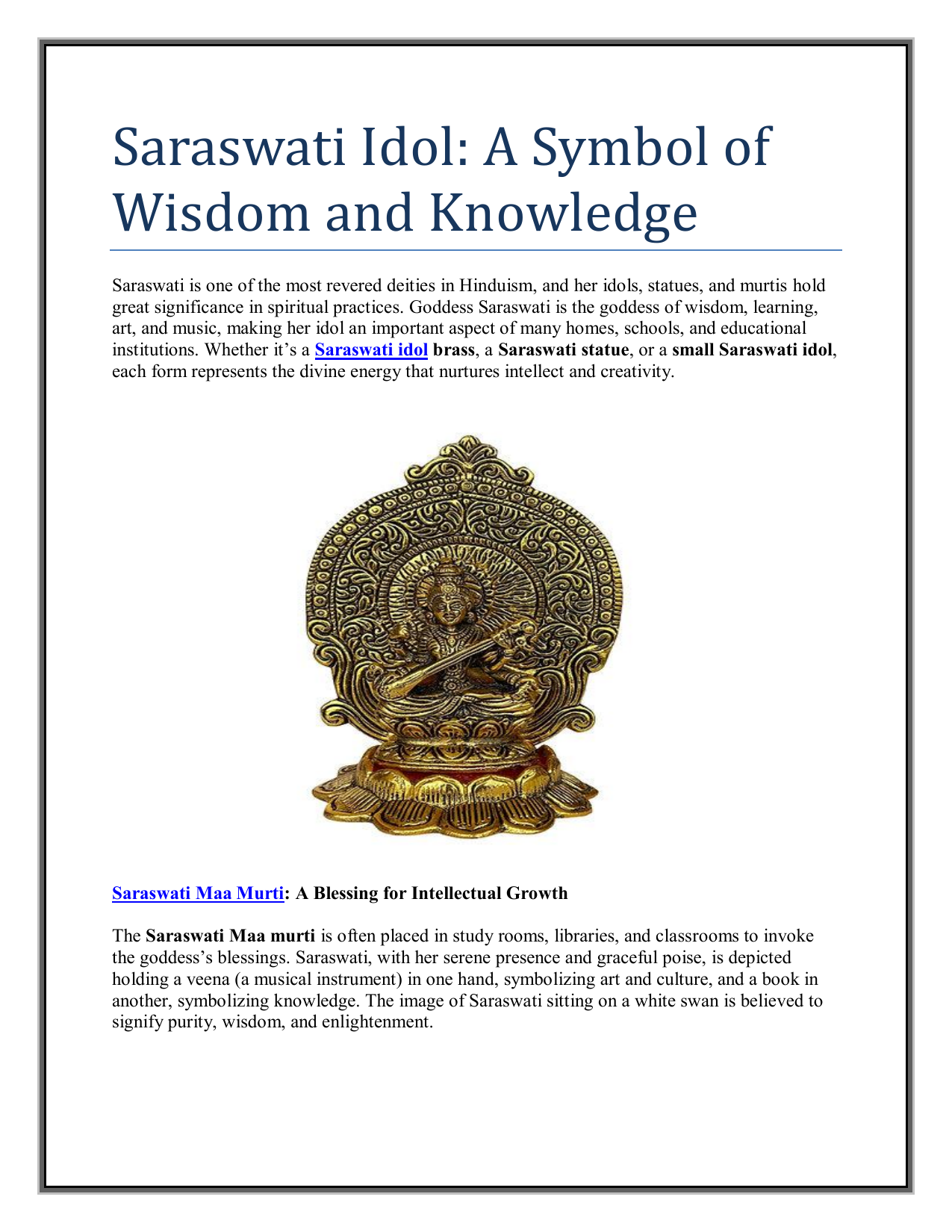 Saraswati Idol: A Symbol of Wisdom and Knowledge Saraswati is one of the most revered deities in Hinduism, and her idols, statues, and murtis hold great significance in spiritual practices. Goddess Saraswati is the goddess of wisdom, learning, art, and music, making her idol an important aspect of many homes, schools, and educational institutions. Whether it’s a Saraswati idol brass, a Saraswati statue, or a small Saraswati idol, each form represents the divine energy that nurtures intellect and creativity. Saraswati Maa Murti: A Blessing for Intellectual Growth The Saraswati Maa murti is often placed in study rooms, libraries, and classrooms to invoke the goddess’s blessings. Saraswati, with her serene presence and graceful poise, is depicted holding a veena (a musical instrument) in one hand, symbolizing art and culture, and a book in another, symbolizing knowledge. The image of Saraswati sitting on a white swan is believed to signify purity, wisdom, and enlightenment. The Saraswati photo frame is another popular item for those who want to keep her presence close by in their personal or workspaces. These frames can be used to hang pictures of the goddess or display artistic renditions of her, ensuring her divine blessings are always around. Saraswati Statue: A Beautiful Expression of Art and Devotion A Saraswati statue is often crafted from various materials such as brass, wood, or marble, each offering a unique aesthetic appeal. The brass Saraswati idol is especially popular for its durability and traditional appeal. It exudes a sense of timelessness and elegance that is perfect for homes and places of worship. A Goddess Saraswati idol brass adds a golden touch of divinity and prosperity to any space. Small Saraswati Idol: Ideal for Personal Spaces If space is a concern, a small Saraswati idol is an excellent option. These compact yet powerful representations of the goddess are ideal for placement in study desks, personal altars, or prayer corners. Despite their small size, these idols pack in the same spiritual energy and blessings of larger statues. Saraswati Murti: Enhancing Spiritual and Educational Environments The Saraswati murti is not just a decorative item; it is a source of inspiration. Whether it's in a school, a temple, or a home, the presence of the Saraswati idol encourages learning, creativity, and wisdom. Devotees often offer prayers to the Saraswati idol during festivals like Vasant Panchami, which is dedicated to the goddess. During this time, students place their books near the idol, seeking her blessings for academic success. Saraswati Mata Maa: A Mother Figure in Hinduism In Hinduism, Saraswati Mata Maa is also referred to as the mother of all knowledge and wisdom. Her blessings are sought not only by students but also by musicians, artists, and anyone involved in intellectual or creative pursuits. Her divine presence through the idol brings about an atmosphere of tranquility, focus, and productivity. Whether you opt for a Saraswati photo frame or a grand Saraswati statue, the idol embodies a motherly energy that nurtures growth and enlightenment. Why Invest in a Saraswati Idol? Having a Saraswati idol in your home or workspace is more than just a decorative choice; it is a spiritual investment. The presence of Saraswati brings clarity, learning, and divine protection. It is an effective way to channel positive energy into your environment, boosting concentration, creativity, and academic success. Whether it is the grandeur of a Saraswati statue brass or the simplicity of a small Saraswati idol, each form serves as a powerful reminder of the goddess’s blessings. In conclusion, whether you are looking for a Saraswati idol, Saraswati Maa murti, or Goddess Saraswati statue brass, each form holds a unique significance. Choose the one that resonates most with your space and needs, and invite the blessings of Saraswati, the goddess of wisdom and knowledge, into your life. About Us : 34/35 Mathura Vihar, Vijay Nagar, Jabalpur (M.P.) Phone: +919713099668 Email: [email protected] Pin: 482002 Website : https://www.salvusestore.com/product-page/salvus-app-solutions-oxidizedmetal-saraswati-mata-sitting-statue-6-inches