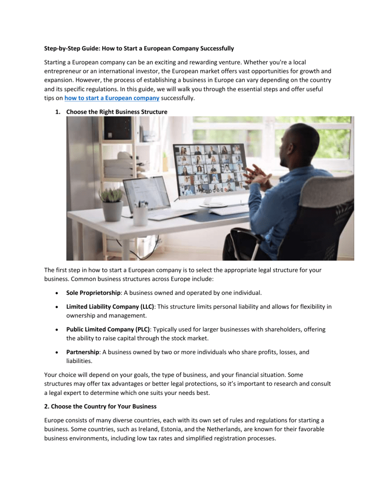 Step-by-Step Guide: How to Start a European Company Successfully Starting a European company can be an exciting and rewarding venture. Whether you're a local entrepreneur or an international investor, the European market offers vast opportunities for growth and expansion. However, the process of establishing a business in Europe can vary depending on the country and its specific regulations. In this guide, we will walk you through the essential steps and offer useful tips on how to start a European company successfully. 1. Choose the Right Business Structure The first step in how to start a European company is to select the appropriate legal structure for your business. Common business structures across Europe include: Sole Proprietorship: A business owned and operated by one individual. Limited Liability Company (LLC): This structure limits personal liability and allows for flexibility in ownership and management. Public Limited Company (PLC): Typically used for larger businesses with shareholders, offering the ability to raise capital through the stock market. Partnership: A business owned by two or more individuals who share profits, losses, and liabilities. Your choice will depend on your goals, the type of business, and your financial situation. Some structures may offer tax advantages or better legal protections, so it’s important to research and consult a legal expert to determine which one suits your needs best. 2. Choose the Country for Your Business Europe consists of many diverse countries, each with its own set of rules and regulations for starting a business. Some countries, such as Ireland, Estonia, and the Netherlands, are known for their favorable business environments, including low tax rates and simplified registration processes. When deciding how to start a European company, consider these factors: Tax benefits: Countries like Ireland have low corporate tax rates, which can be attractive for international companies. Business infrastructure: Look for countries with developed infrastructure, ease of communication, and reliable banking systems. Labor laws: Different countries have varying employment regulations and labor market conditions. Language barriers: Depending on your target market, you may need to consider language proficiency or translation services. Take your time to research the business climate in various countries to make an informed decision. 3. Register Your Business Once you have decided on the business structure and location, the next step is to officially register your company. The registration process will vary depending on the country, but in general, you will need to: Submit an application to the relevant government authority. Provide documentation such as proof of identity, business address, and details about the company’s directors and shareholders. Obtain a business license: This might include sector-specific permits or licenses depending on your type of business (e.g., food industry, e-commerce). Pay registration fees: Fees will vary by country and business structure. In most European countries, you can complete the registration process online, which speeds up the procedure. Some countries also allow you to register a European company as a branch of an existing business. 4. Open a Business Bank Account One of the next critical steps in how to start a European company is opening a business bank account. This step is essential for managing finances, paying taxes, and handling transactions. Requirements for opening an account may vary by country, but typically include: Proof of identity for business owners. Business registration details, including your company’s legal name and address. Proof of business activity: Some banks require a business plan or proof of trade. It is advisable to choose a bank that offers services in the local language and has experience working with international businesses. 5. Comply with Tax Regulations Europe has a complex taxation system that requires business owners to understand local tax laws and obligations. Once your company is registered, you will need to: Obtain a tax identification number (TIN): This number is used for tax reporting purposes. Understand VAT (Value Added Tax): Most European countries implement VAT, which applies to the sale of goods and services. If your business sells goods or services, you may need to register for VAT. File corporate taxes: Depending on your company structure, you may need to file annual corporate tax returns. Tax rates vary by country, so it’s important to familiarize yourself with local rates. Consulting a local accountant or tax advisor can help ensure that your company is compliant with all tax laws and that you maximize your potential tax savings. 6. Hire Employees and Set Up Payroll If you plan to hire employees, understanding the labor laws of your chosen country is crucial. You will need to: Create employment contracts that comply with local regulations. Register your employees with the relevant authorities for social security, pension contributions, and other benefits. Set up a payroll system to ensure that employees are paid on time and that taxes are withheld correctly. Some European countries have strong labor protections, so it's important to comply with employment laws regarding working hours, wages, and employee benefits. 7. Market Your Business After successfully setting up your company, it’s time to promote your business. Some marketing strategies to consider include: Building an online presence: Creating a website and utilizing social media platforms is key to reaching a broader audience. Local marketing: Depending on your business, you may want to focus on local marketing efforts to engage your target market. Networking: Participating in business networks and joining industry groups can help you establish connections and partnerships in your new European market. Marketing regulations may vary by country, so it’s essential to ensure that all campaigns